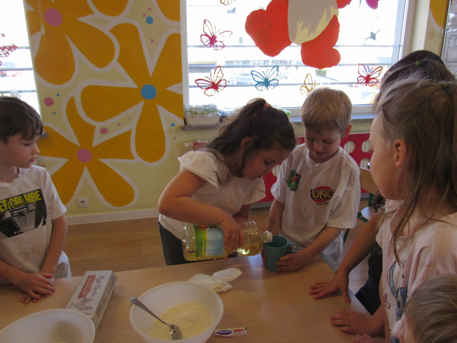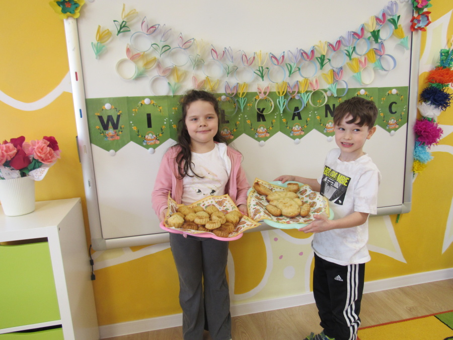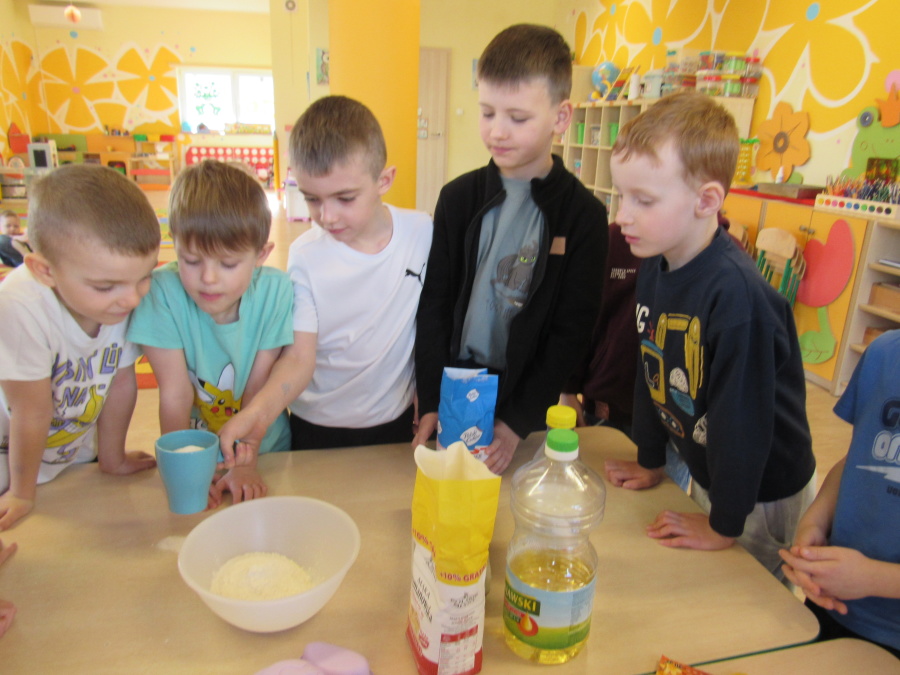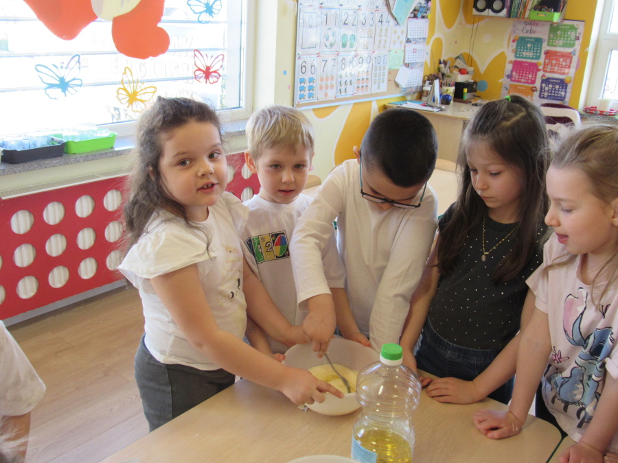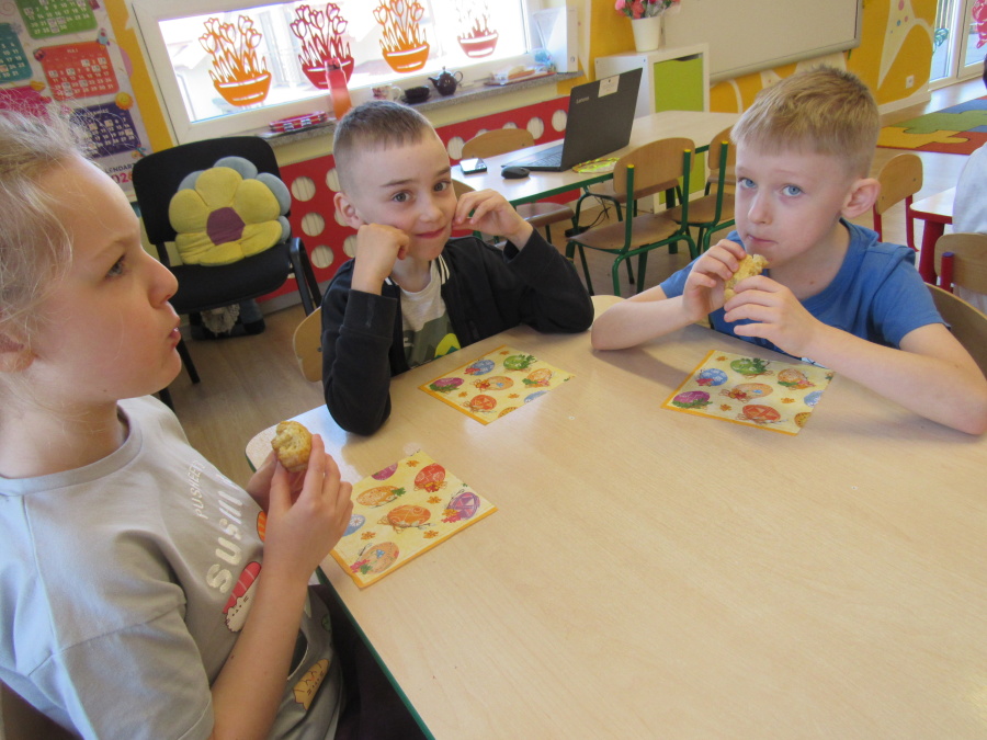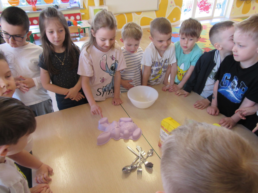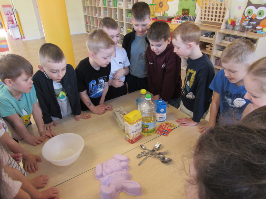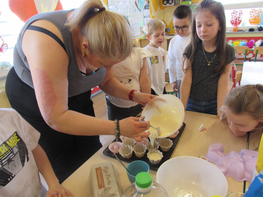 Zbliżające się Wielkanoc sprawiła, że gr. Kropeczek przystąpiła dziś do wypieków. Odmierzaliśmy składniki, przesypywaliśmy i przelewaliśmy, mieszaliśmy je ze sobą. Powstała masa trafiła do foremek. Czas oczekiwania na upieczenie i ostygnięcie babeczek bardzo się nam dłużył.Na szczęście warto było czekać. Babeczki i króliczek były przepyszne.