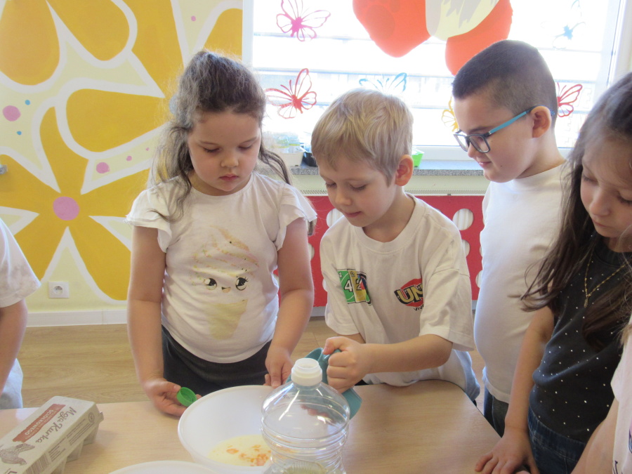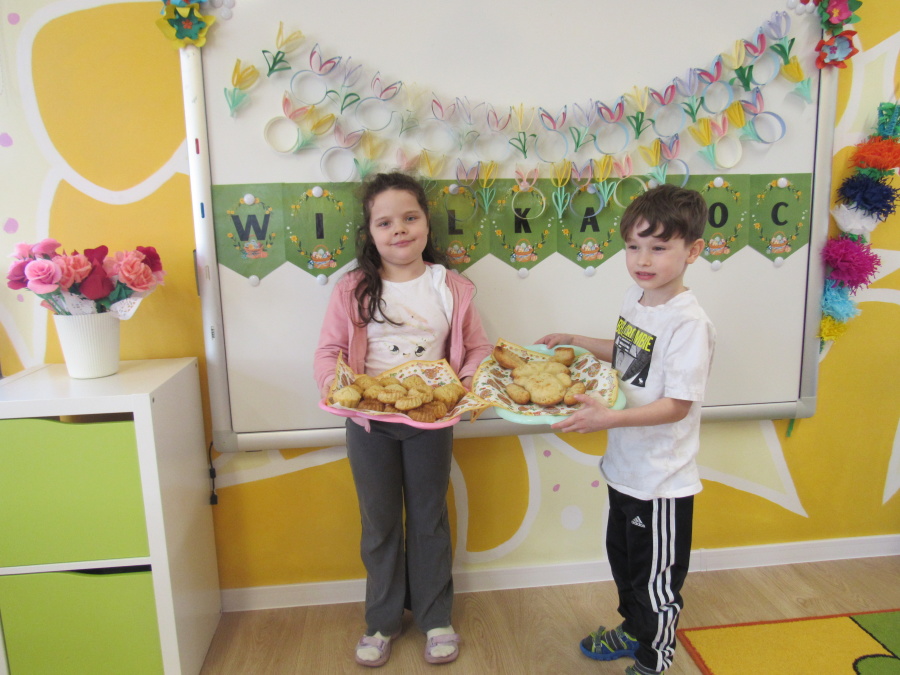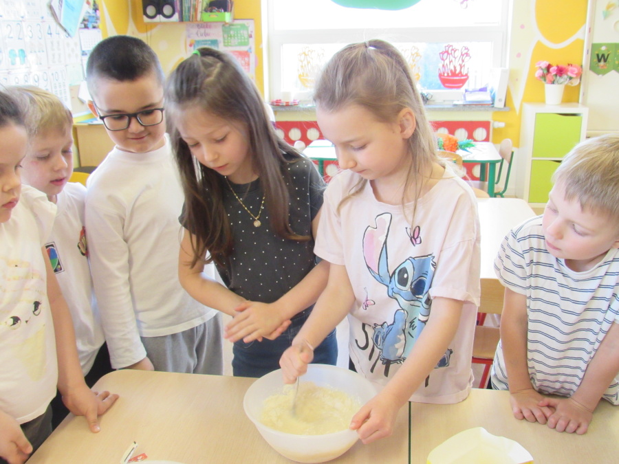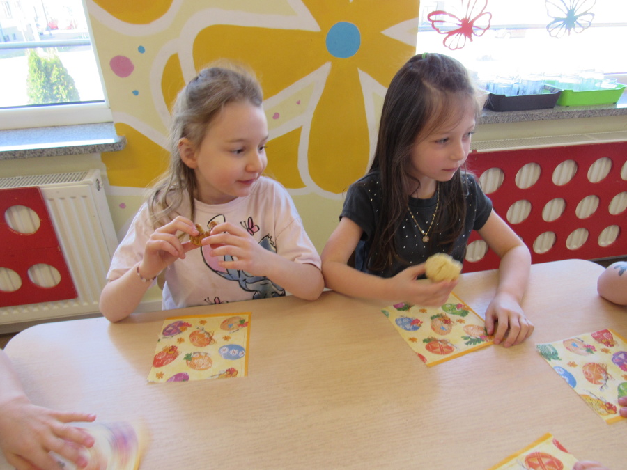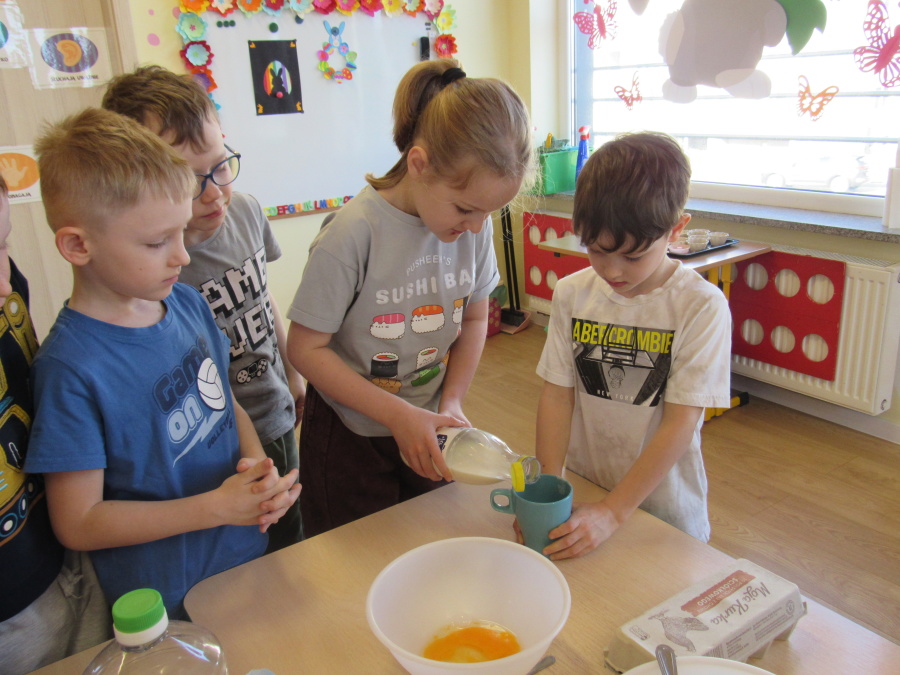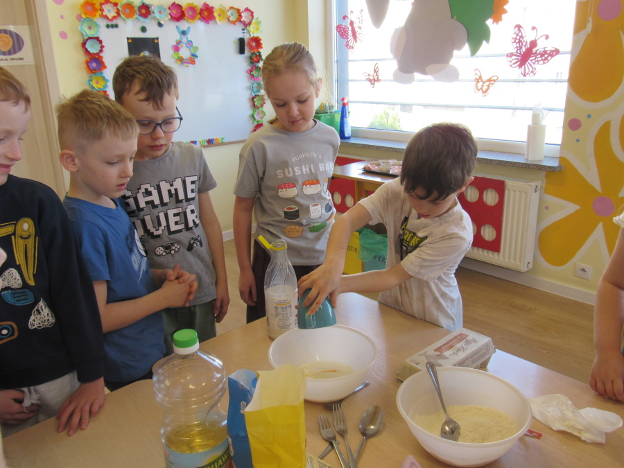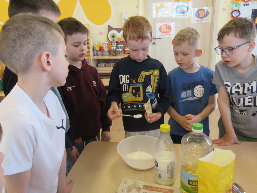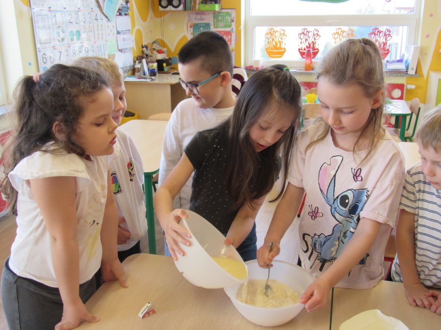 Zbliżające się Wielkanoc sprawiła, że gr. Kropeczek przystąpiła dziś do wypieków. Odmierzaliśmy składniki, przesypywaliśmy i przelewaliśmy, mieszaliśmy je ze sobą. Powstała masa trafiła do foremek. Czas oczekiwania na upieczenie i ostygnięcie babeczek bardzo się nam dłużył.Na szczęście warto było czekać. Babeczki i króliczek były przepyszne.