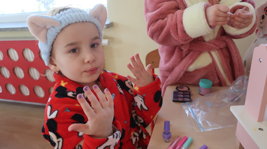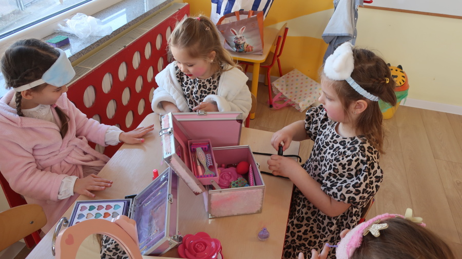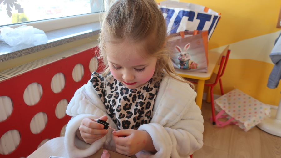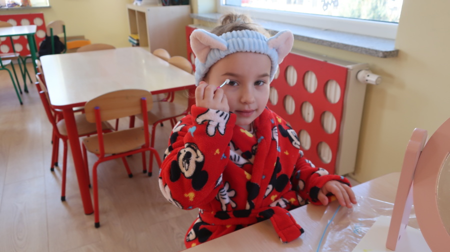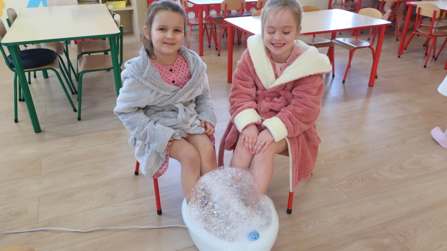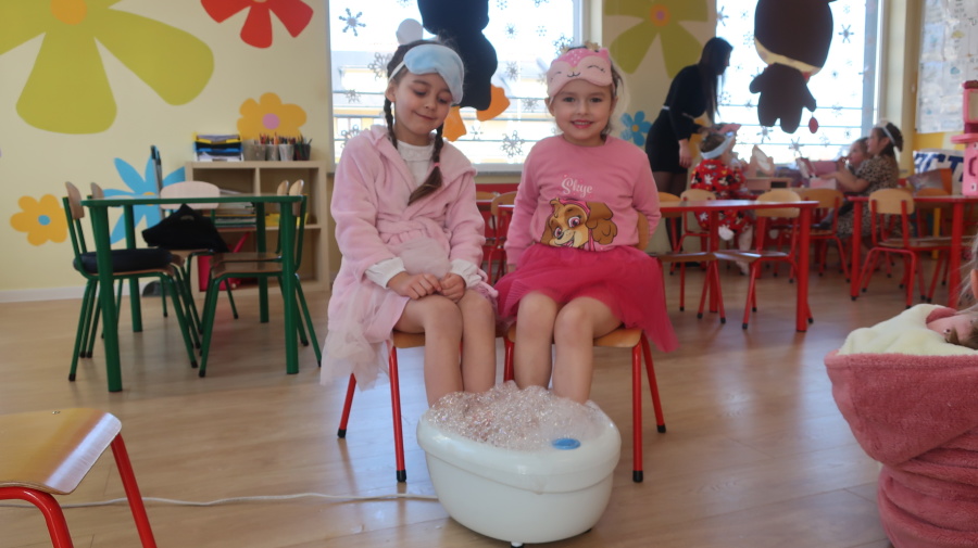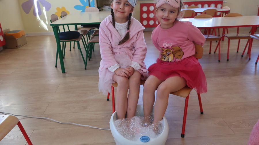 Dzisiaj w naszym przedszkolu świętowaliśmy Dzień Kobiet. Z tej okazji przygotowaliśmy dla dziewczynek wyjątkowy, relaksujący dzień w przedszkolnym SPA. Dziewczynki ubrane w szlafroczki odpoczywały na leżakach, a na oczach miały plasterki ogórka – jak w prawdziwym salonie urody. Był to czas relaksu, wyciszenia i dobrej zabawy. Nie zabrakło także atrakcji w postaci hydromasażu stóp w wodzie z bąbelkami, który sprawił dzieciom wiele radości. Dziewczynki mogły również korzystać z dziecięcych kosmetyków, malować paznokcie i poczuć się naprawdę wyjątkowo. Miłym akcentem tego dnia było również to, że chłopcy wręczyli dziewczynkom drobne upominki, składając im serdeczne życzenia. Dzień upłynął w bardzo miłej atmosferze, pełnej uśmiechu, radości i wspólnej zabawy.