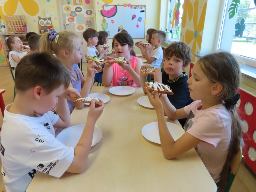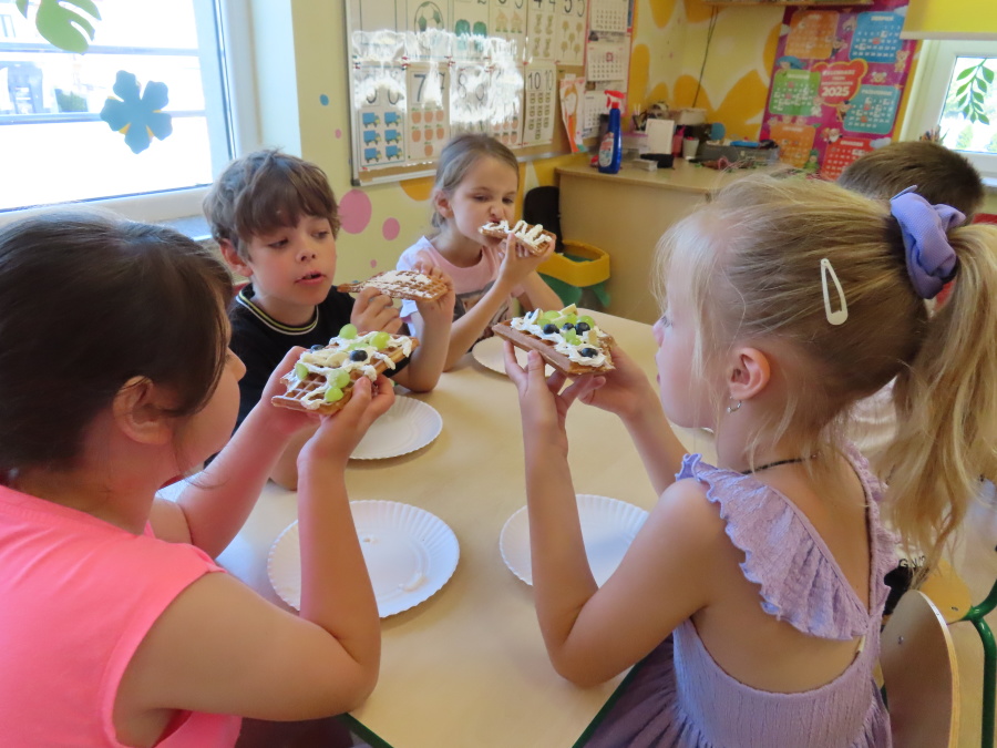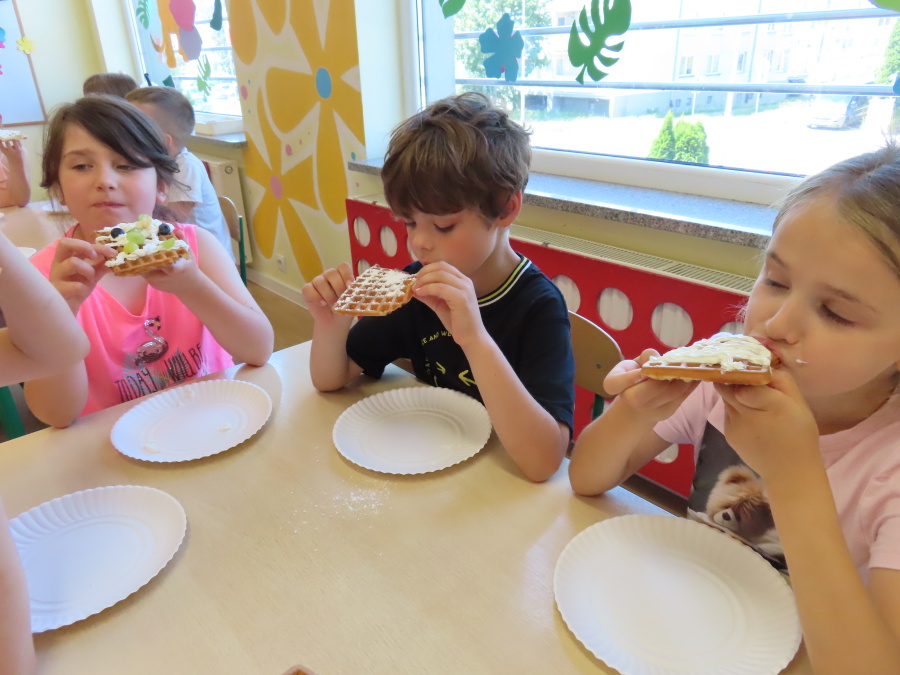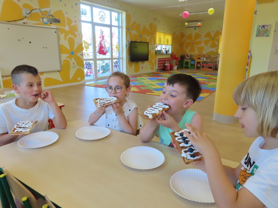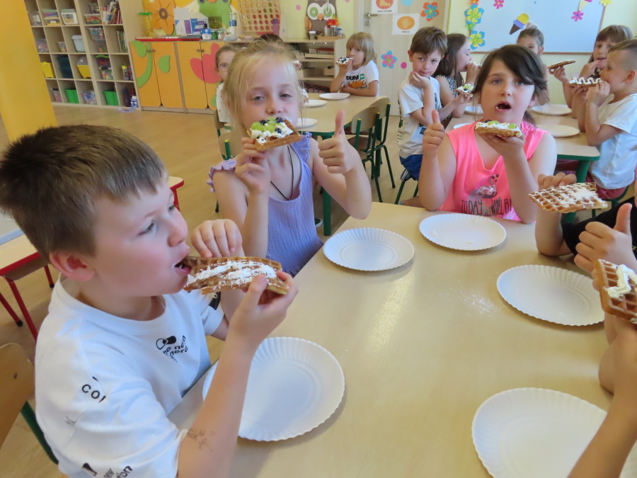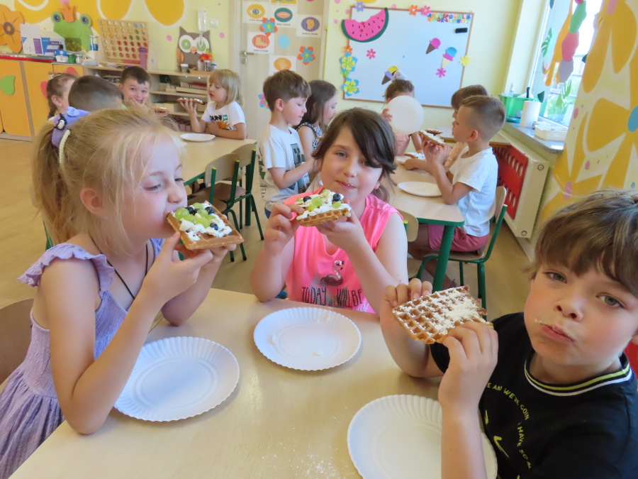 Gofry - ulubiony przysmak nad polskim morzem. Dzisiejsza pogoda: upalna, słoneczna i zachęcająca do kąpieli sprawiła, że przygotowane dziś w gr. Kropeczek gofry przywołały wspomnienia letniej bryzy nad Bałtykiem. Dzieci odmierzały składniki, mieszały je mikserem. Przygotowane ciastu upiekła pani Ania. Przedszkolaki wybierały dodatki: cukier puder, bitą śmietanę czy owoce. Wszystkie gofry zostały spałaszowane ze smakiem.