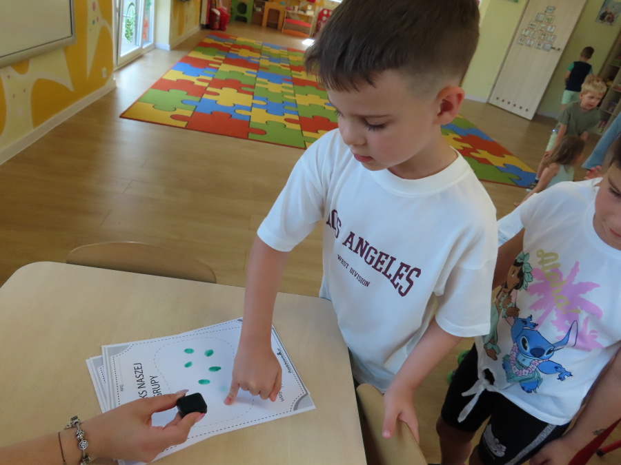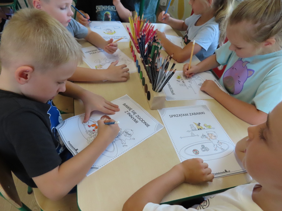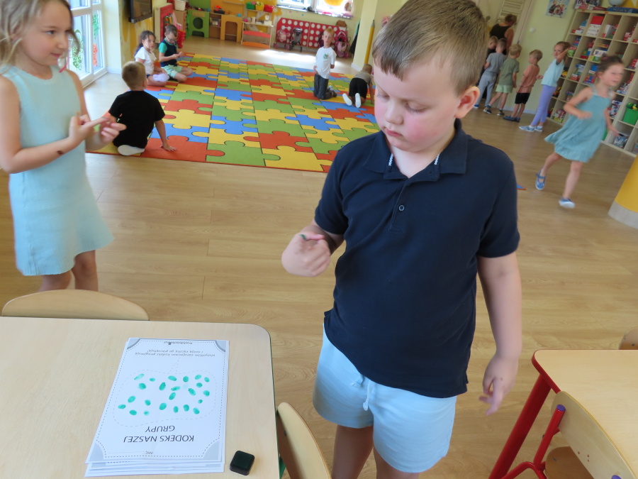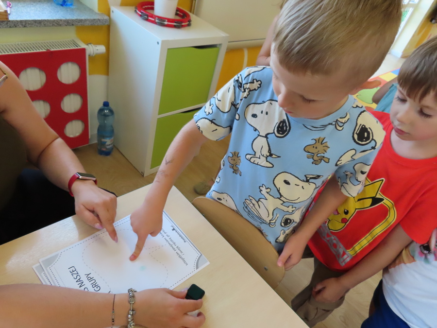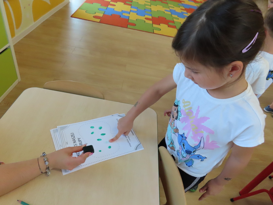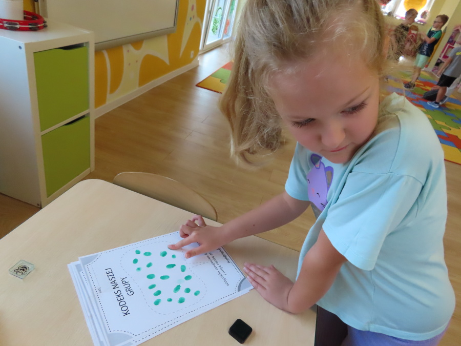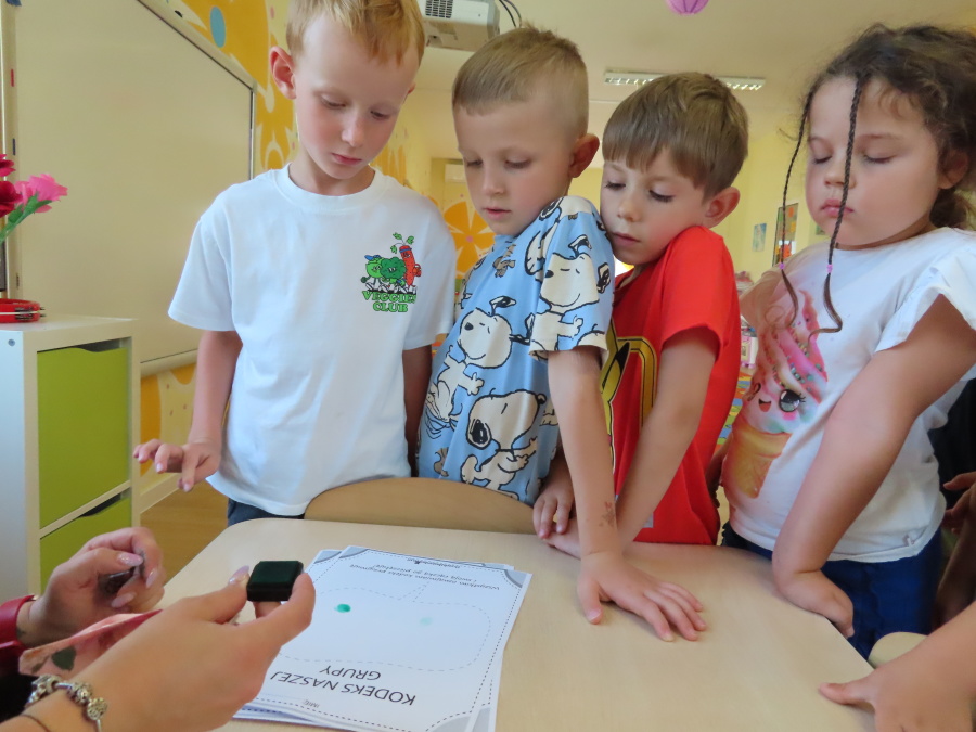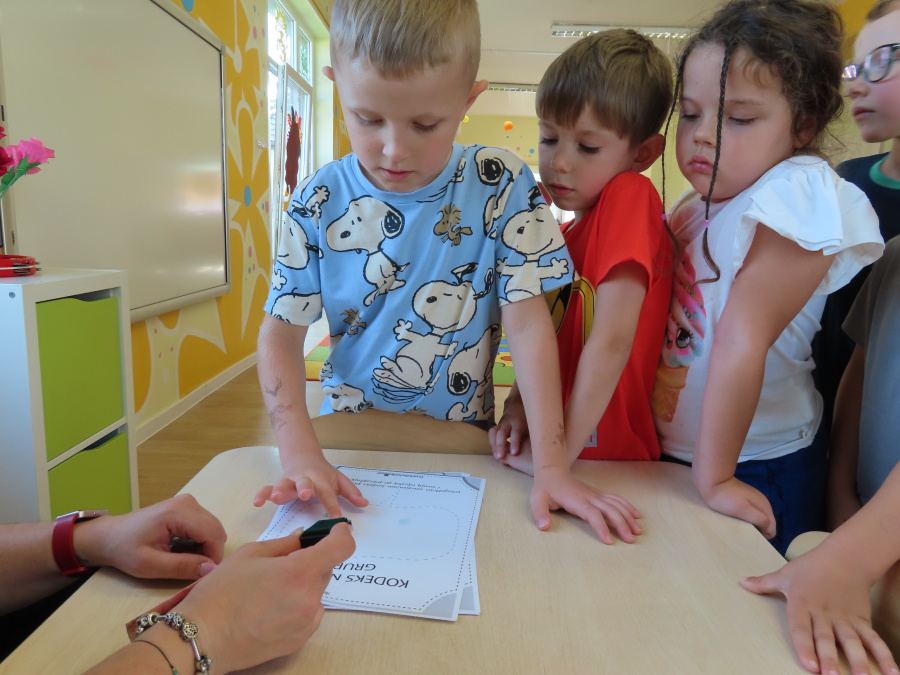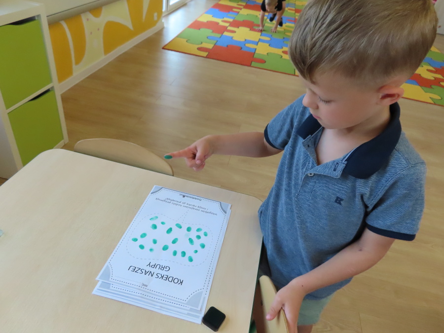 Kropeczki tworzyły dziś Kodeks grupy. Dzieci losowały karty z różnymi zachowaniami, które mogą wystąpić w grupie. Omawiały sytuację przedstawioną na ilustracji i wspólnie decydowały, czy to zachowanie jest właściwe dla dobrej atmosfery w grupie przedszkolnej. Przedszkolaki pokolorowały również ilustracje z zasadami które obowiązują w ich grupie. Każda Kropeczka potwierdziła swoje zatwierdzenie Kodeksu odciskiem palca.