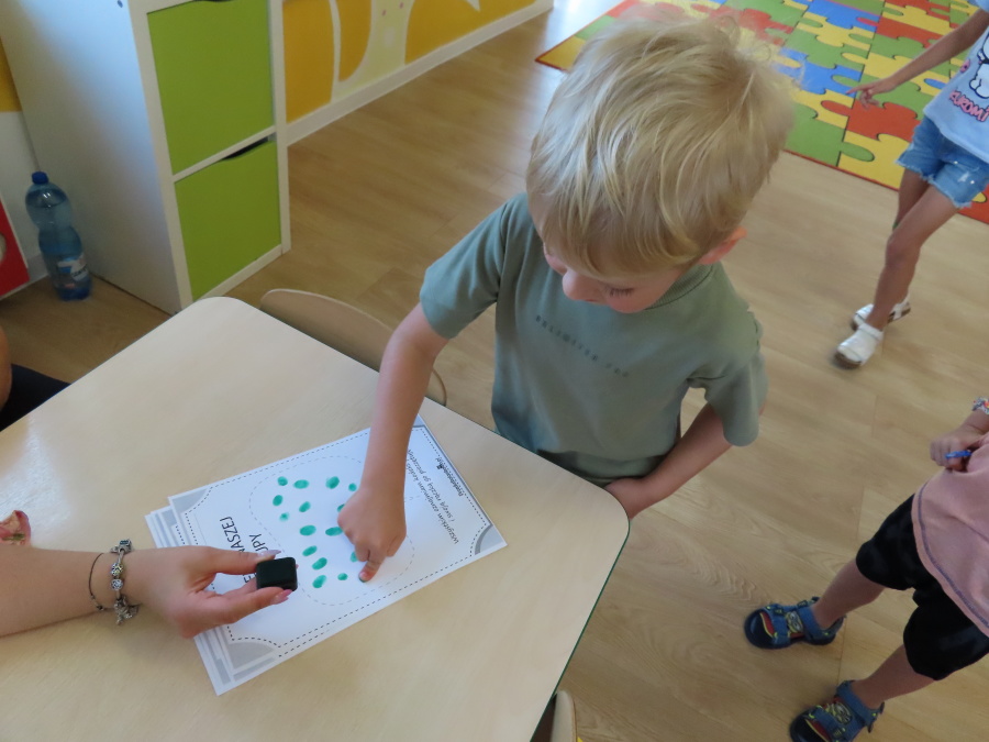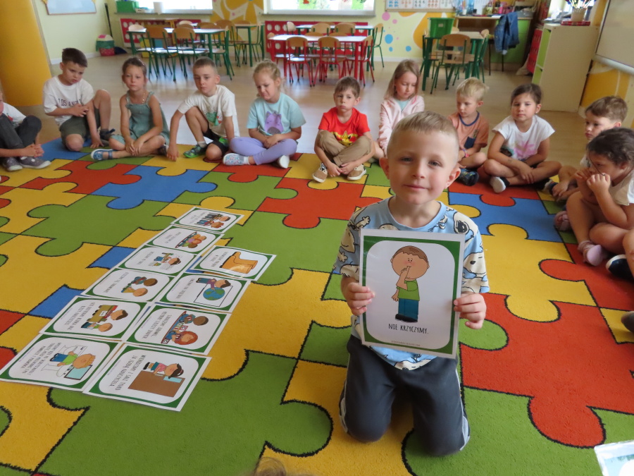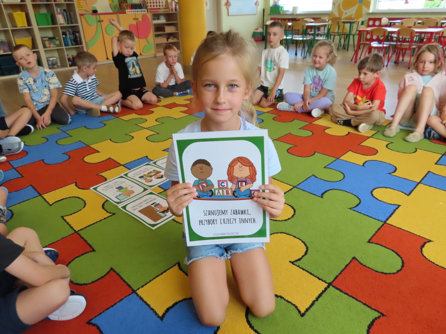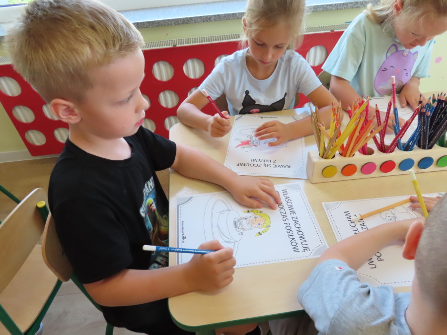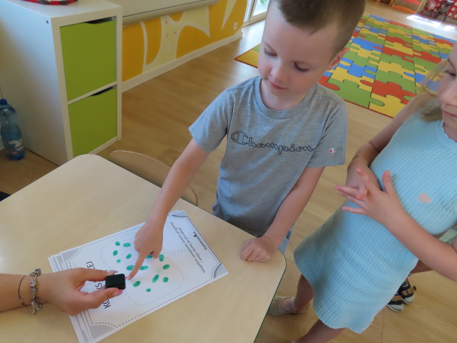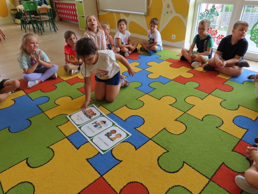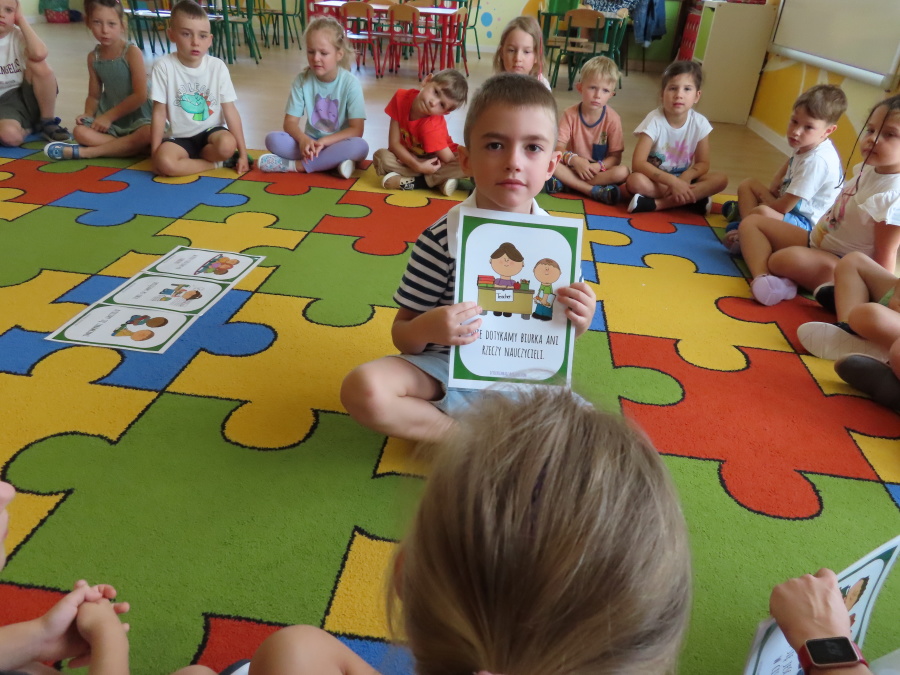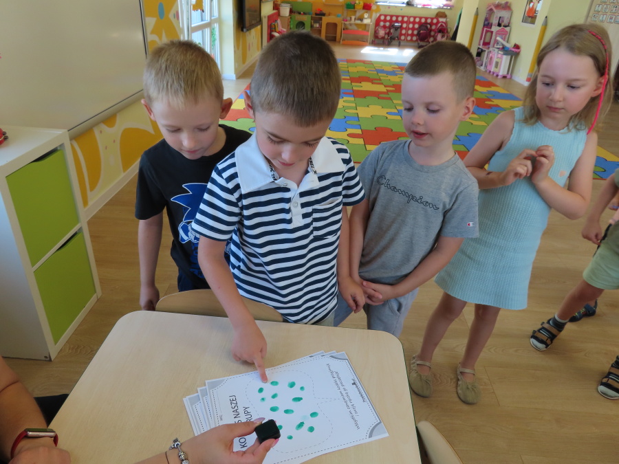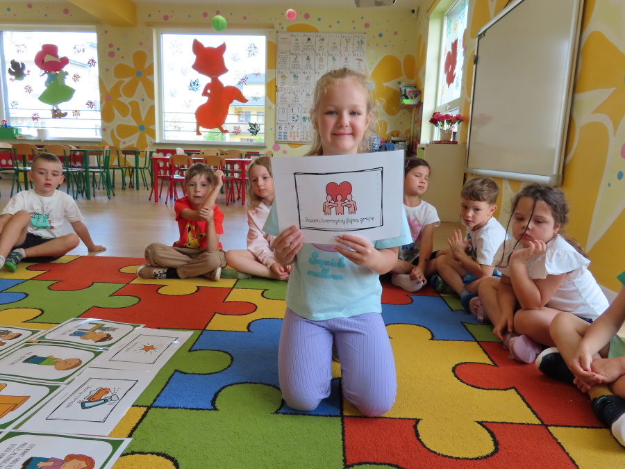 Kropeczki tworzyły dziś Kodeks grupy. Dzieci losowały karty z różnymi zachowaniami, które mogą wystąpić w grupie. Omawiały sytuację przedstawioną na ilustracji i wspólnie decydowały, czy to zachowanie jest właściwe dla dobrej atmosfery w grupie przedszkolnej. Przedszkolaki pokolorowały również ilustracje z zasadami które obowiązują w ich grupie. Każda Kropeczka potwierdziła swoje zatwierdzenie Kodeksu odciskiem palca.