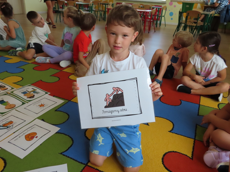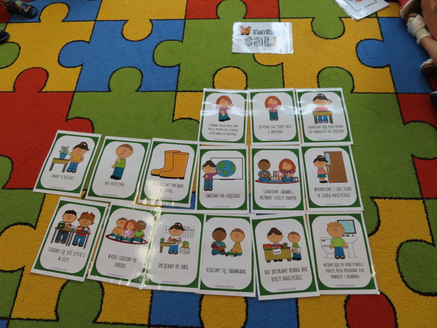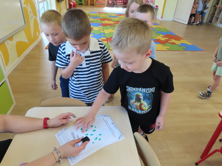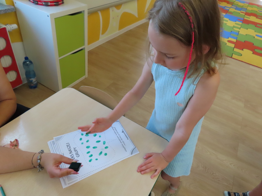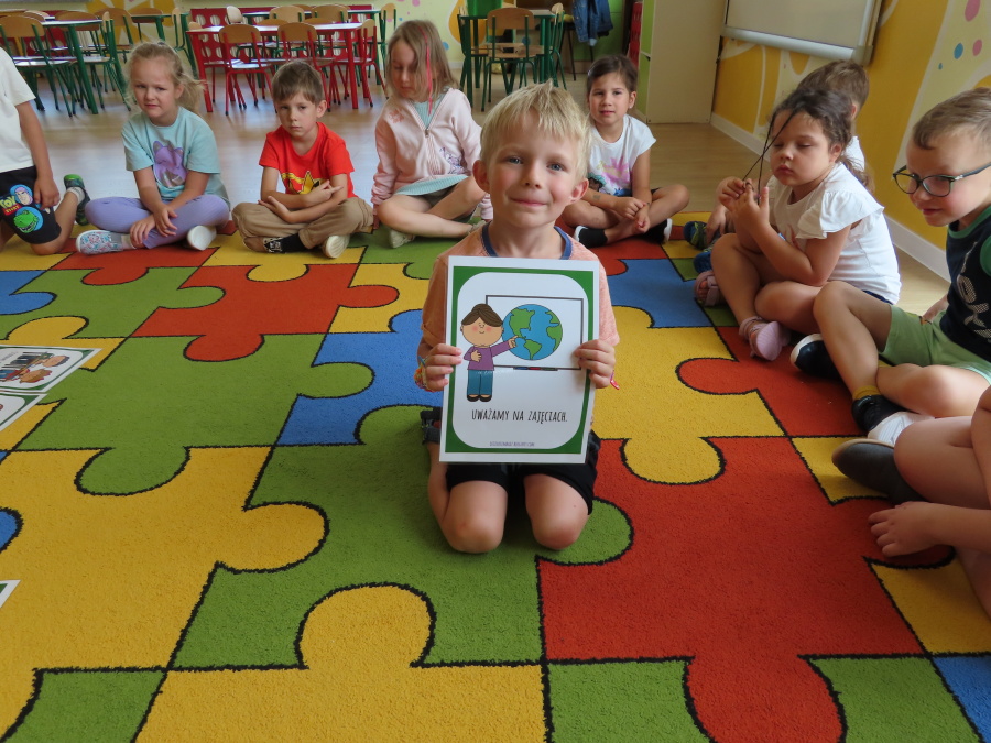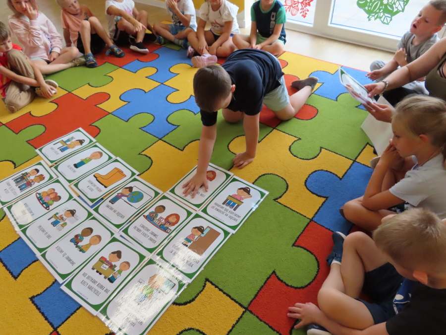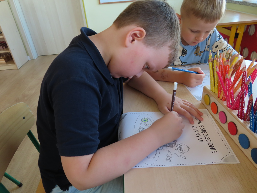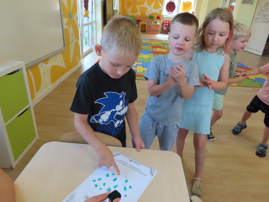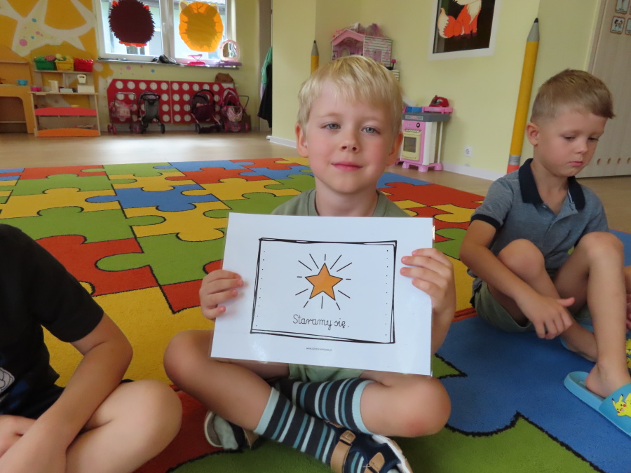 Kropeczki tworzyły dziś Kodeks grupy. Dzieci losowały karty z różnymi zachowaniami, które mogą wystąpić w grupie. Omawiały sytuację przedstawioną na ilustracji i wspólnie decydowały, czy to zachowanie jest właściwe dla dobrej atmosfery w grupie przedszkolnej. Przedszkolaki pokolorowały również ilustracje z zasadami które obowiązują w ich grupie. Każda Kropeczka potwierdziła swoje zatwierdzenie Kodeksu odciskiem palca.