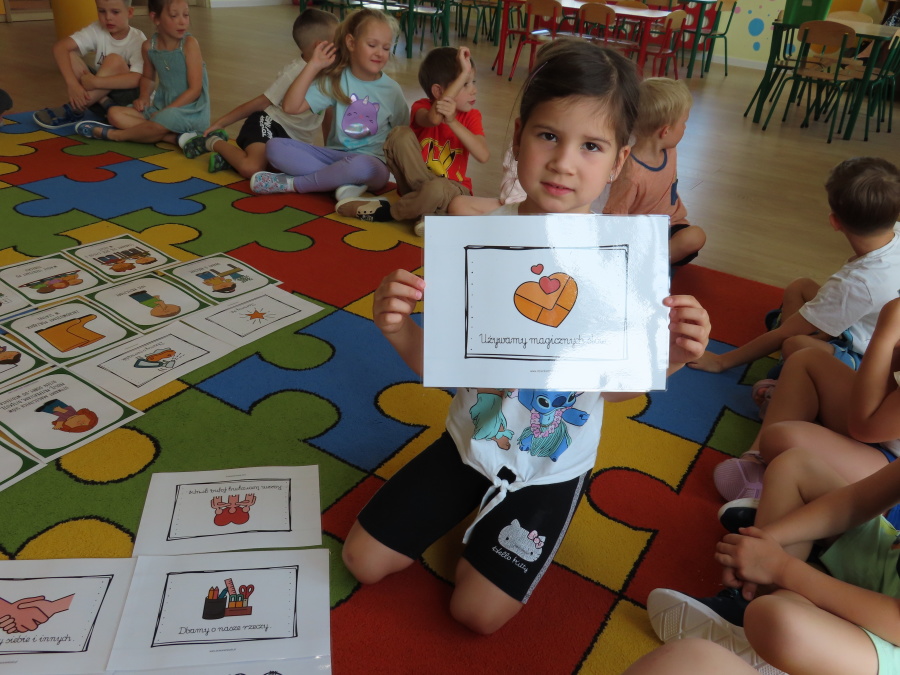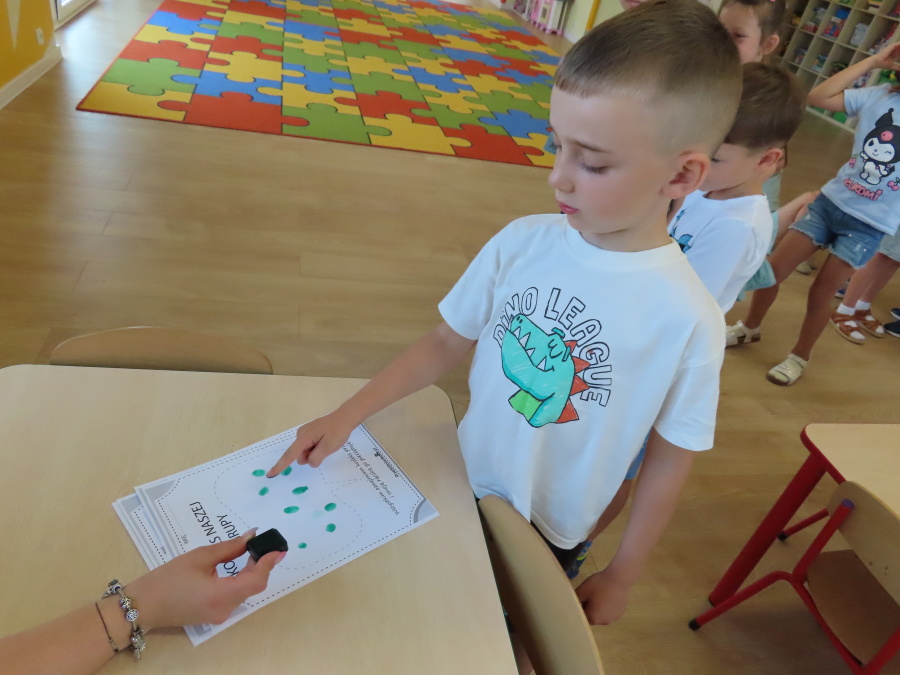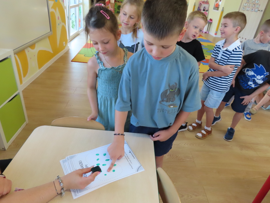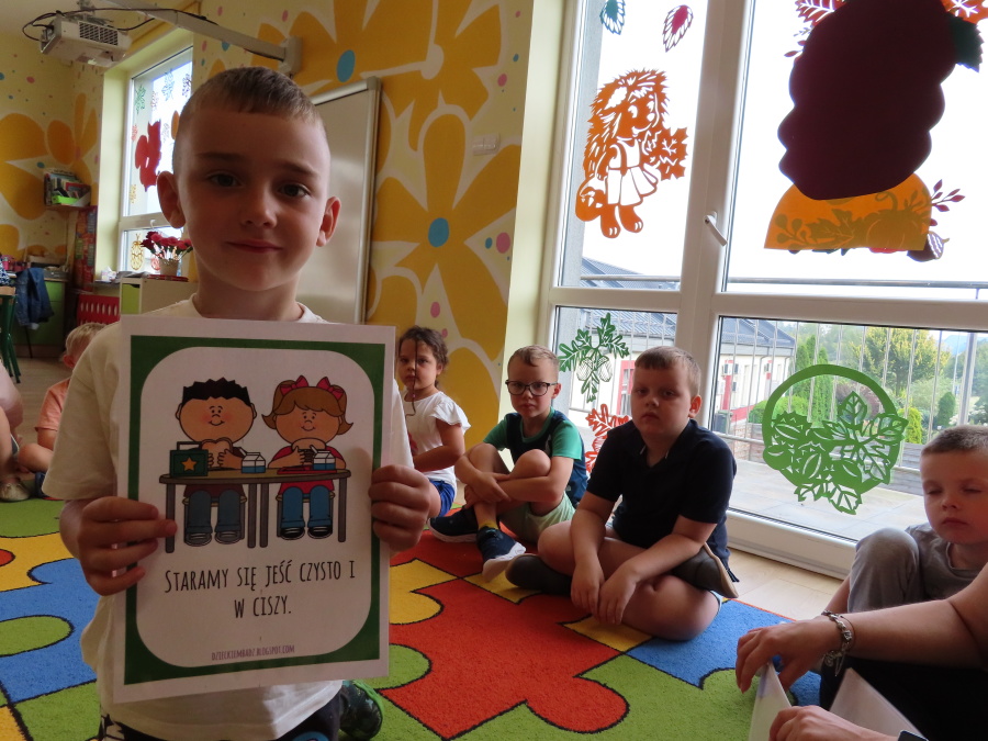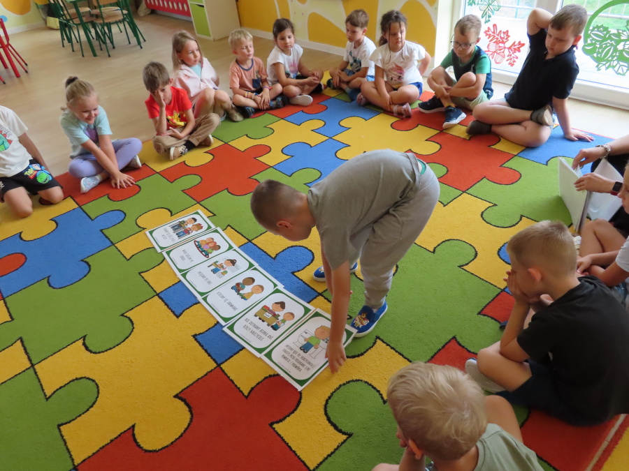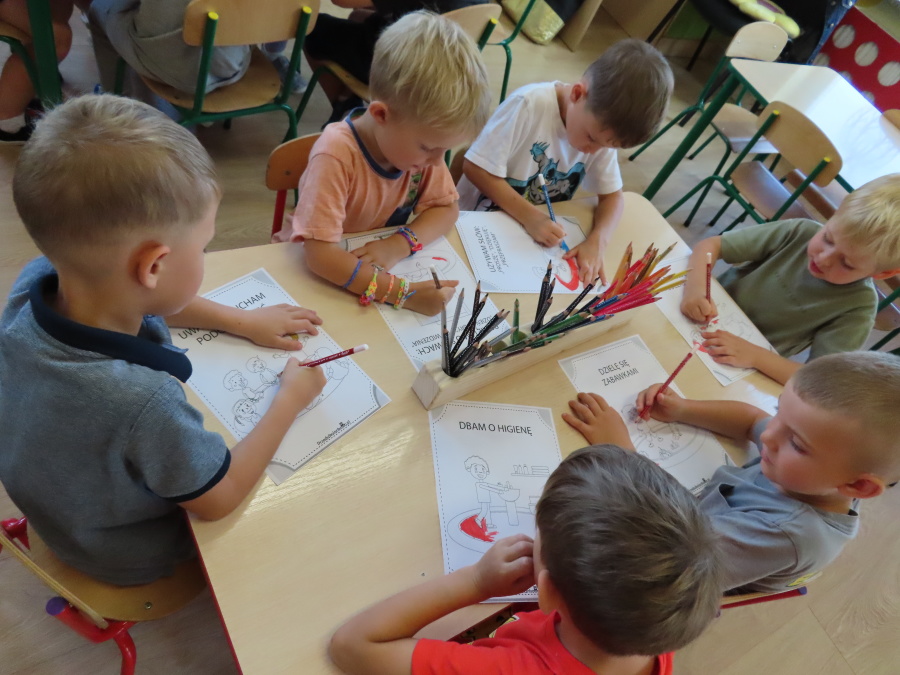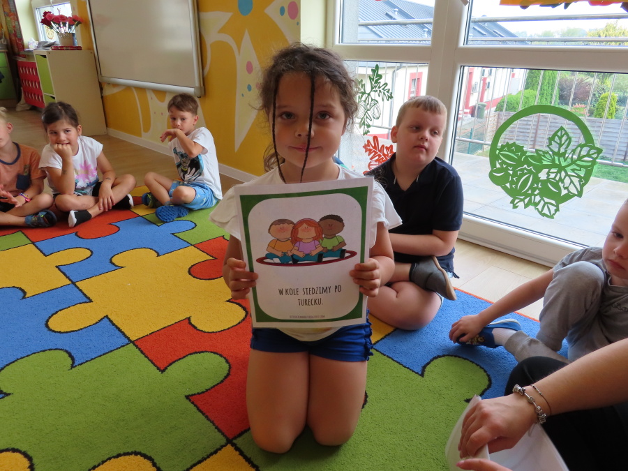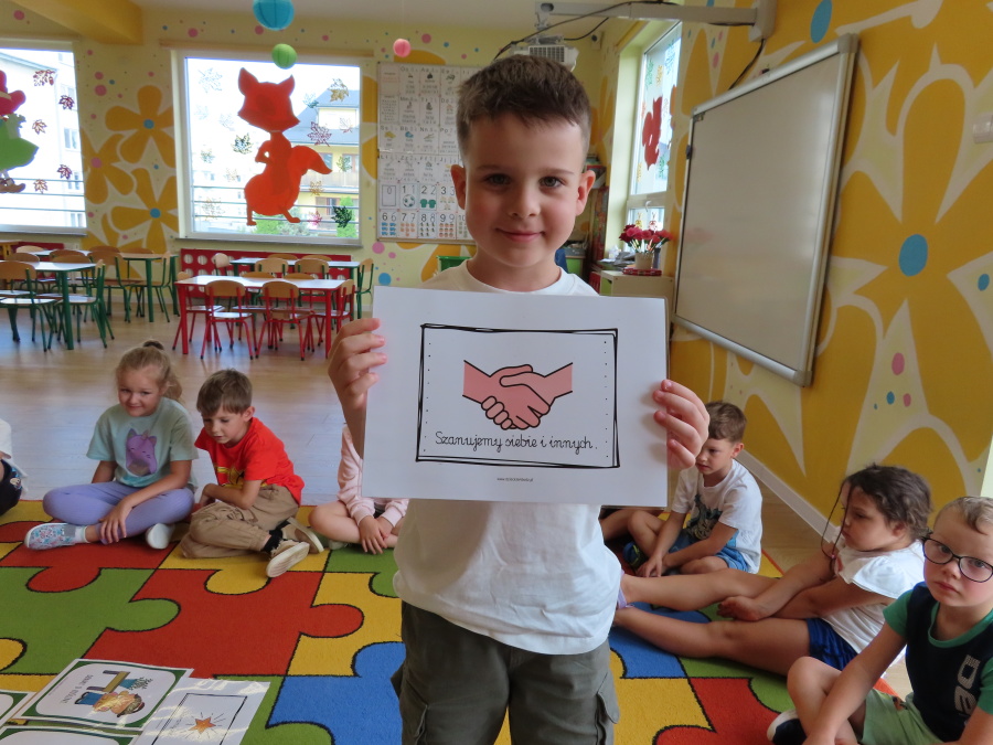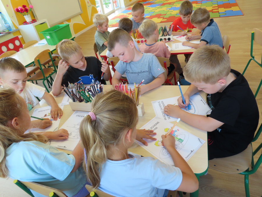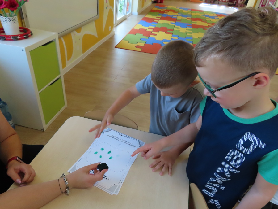 Kropeczki tworzyły dziś Kodeks grupy. Dzieci losowały karty z różnymi zachowaniami, które mogą wystąpić w grupie. Omawiały sytuację przedstawioną na ilustracji i wspólnie decydowały, czy to zachowanie jest właściwe dla dobrej atmosfery w grupie przedszkolnej. Przedszkolaki pokolorowały również ilustracje z zasadami które obowiązują w ich grupie. Każda Kropeczka potwierdziła swoje zatwierdzenie Kodeksu odciskiem palca.
