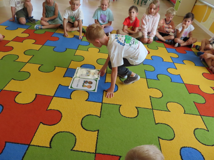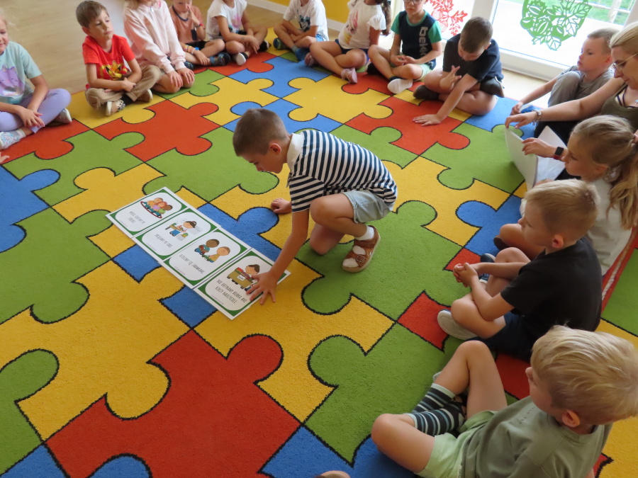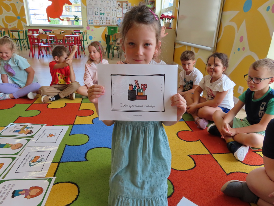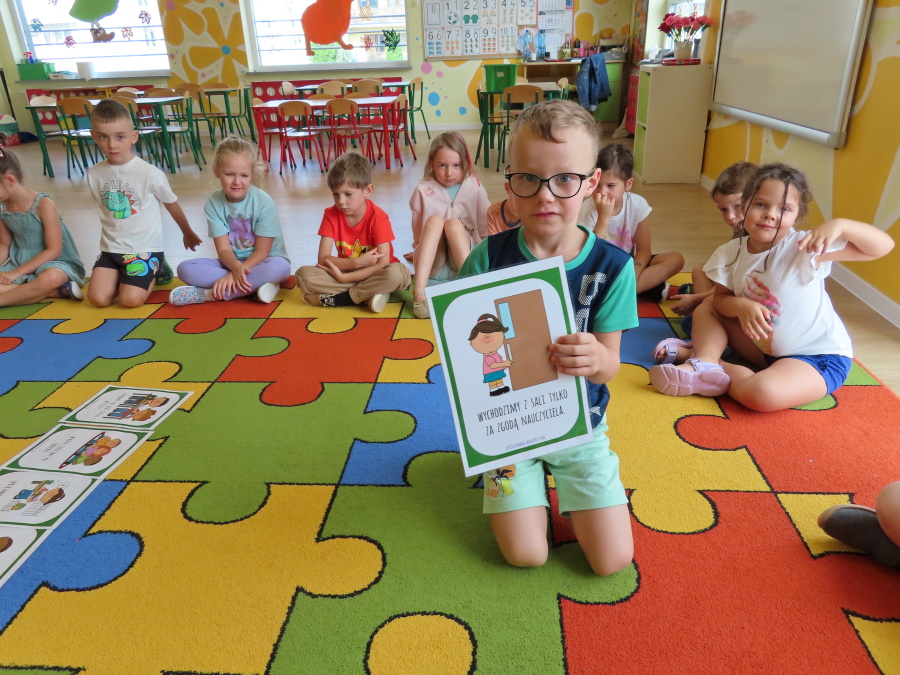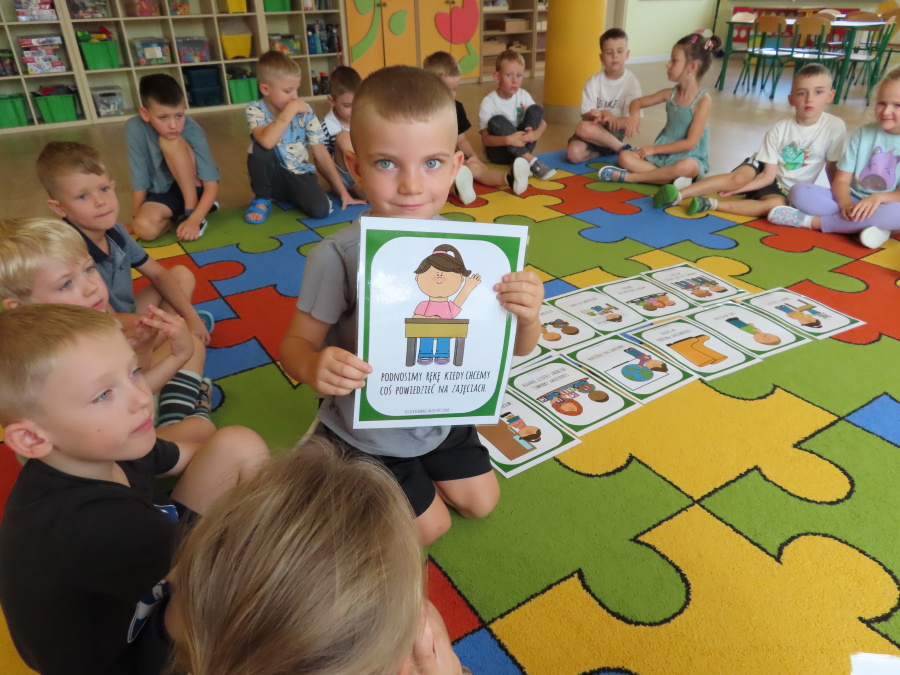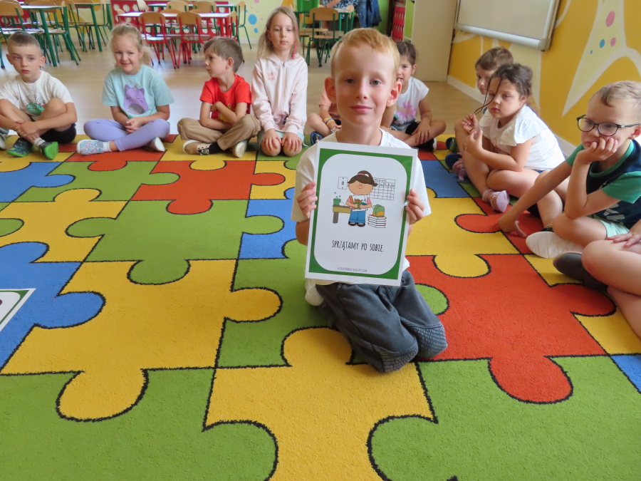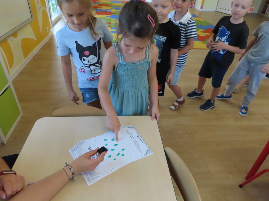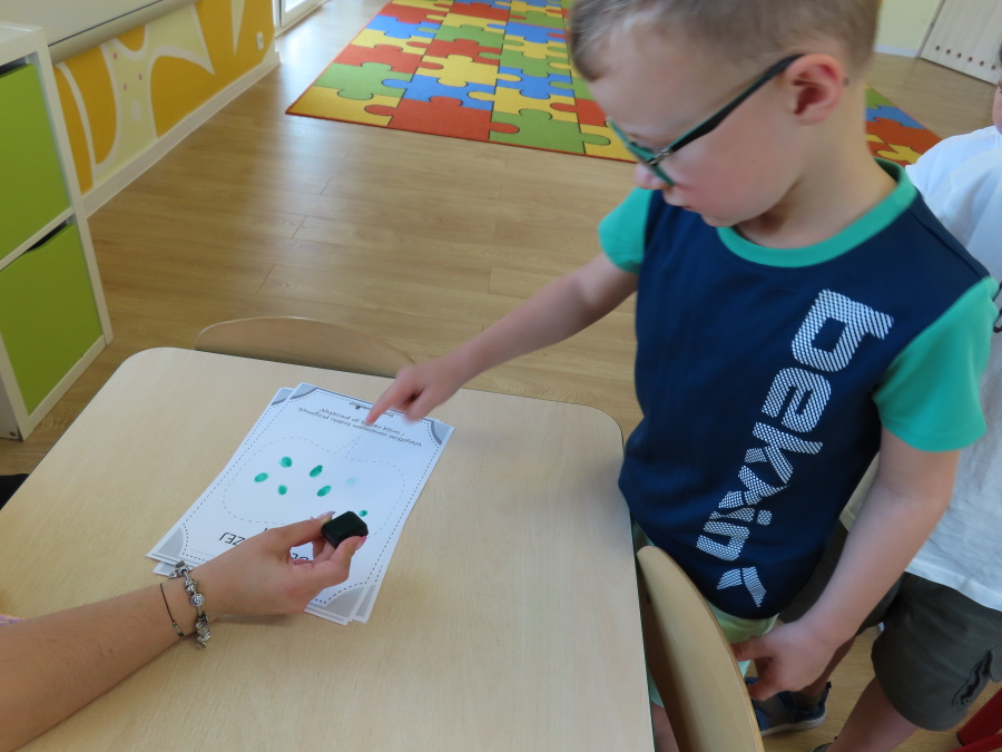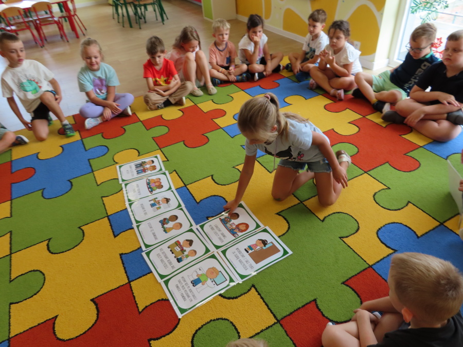 Kropeczki tworzyły dziś Kodeks grupy. Dzieci losowały karty z różnymi zachowaniami, które mogą wystąpić w grupie. Omawiały sytuację przedstawioną na ilustracji i wspólnie decydowały, czy to zachowanie jest właściwe dla dobrej atmosfery w grupie przedszkolnej. Przedszkolaki pokolorowały również ilustracje z zasadami które obowiązują w ich grupie. Każda Kropeczka potwierdziła swoje zatwierdzenie Kodeksu odciskiem palca.