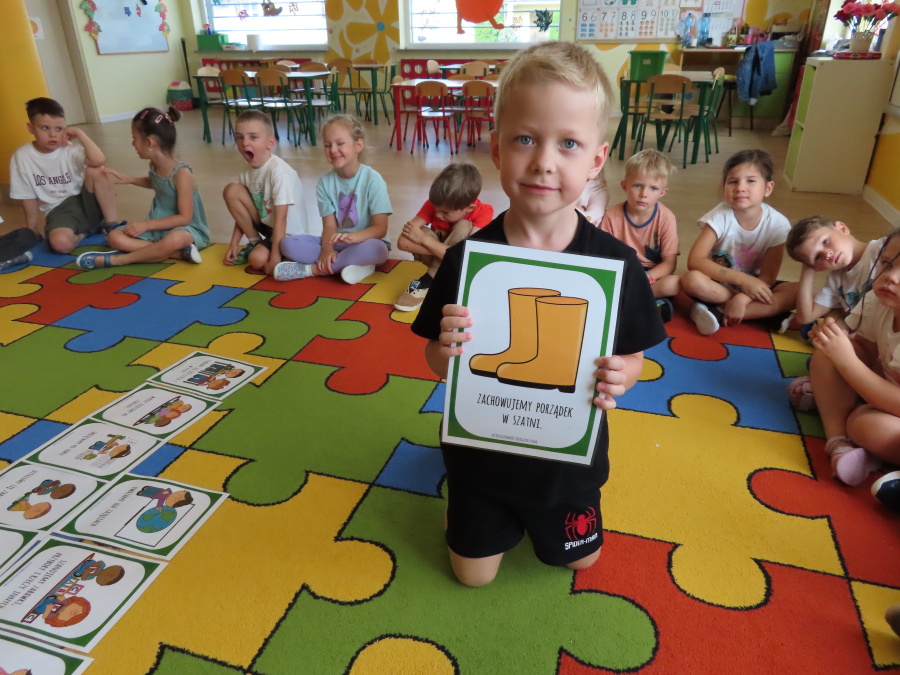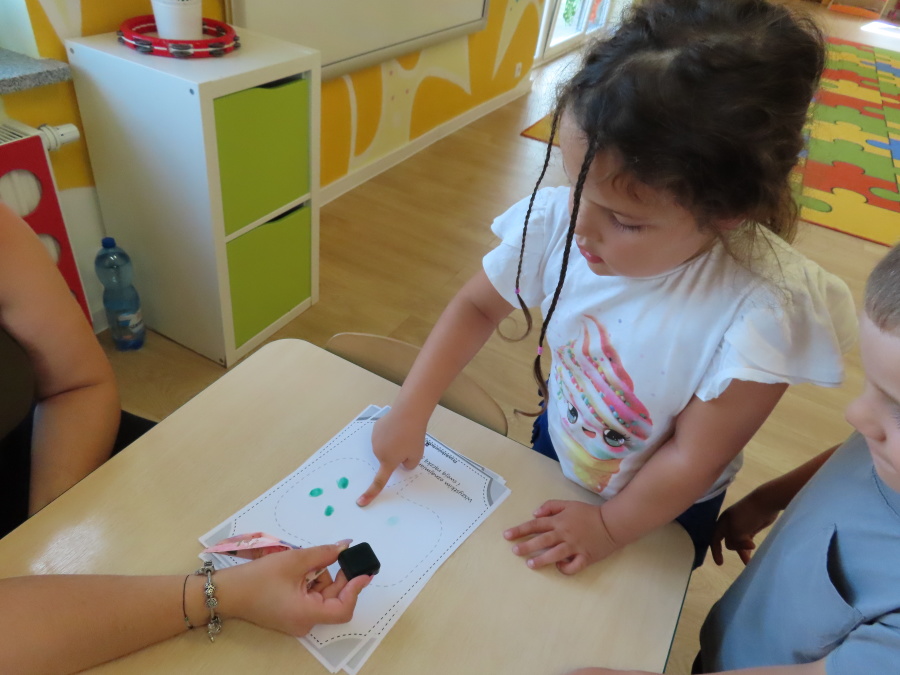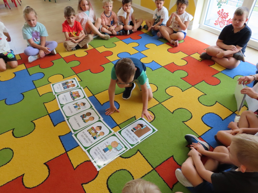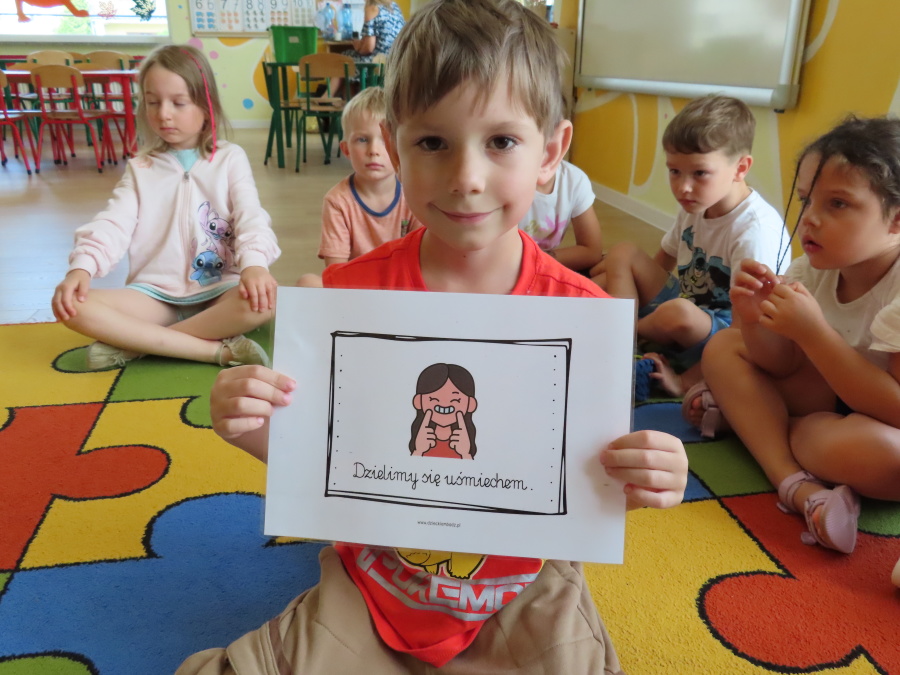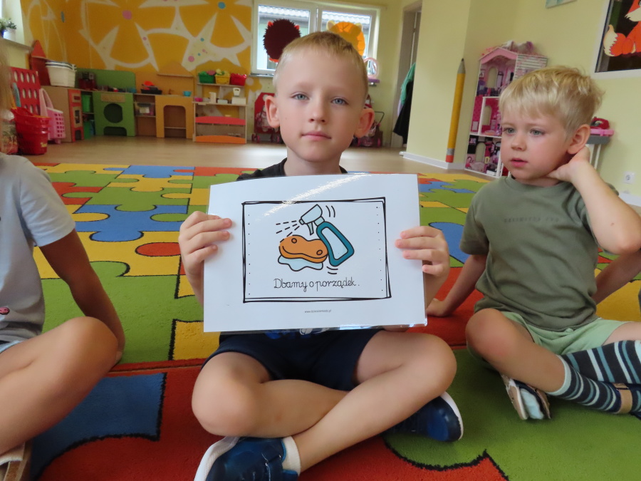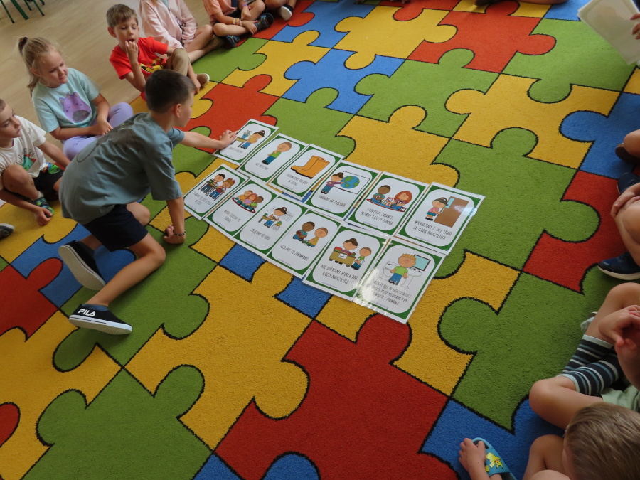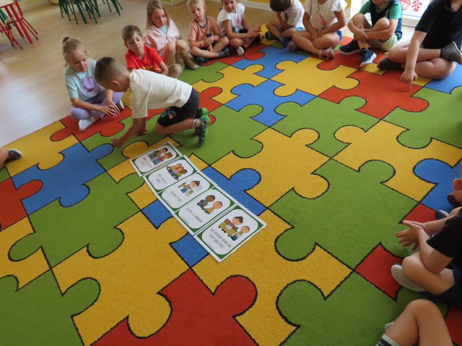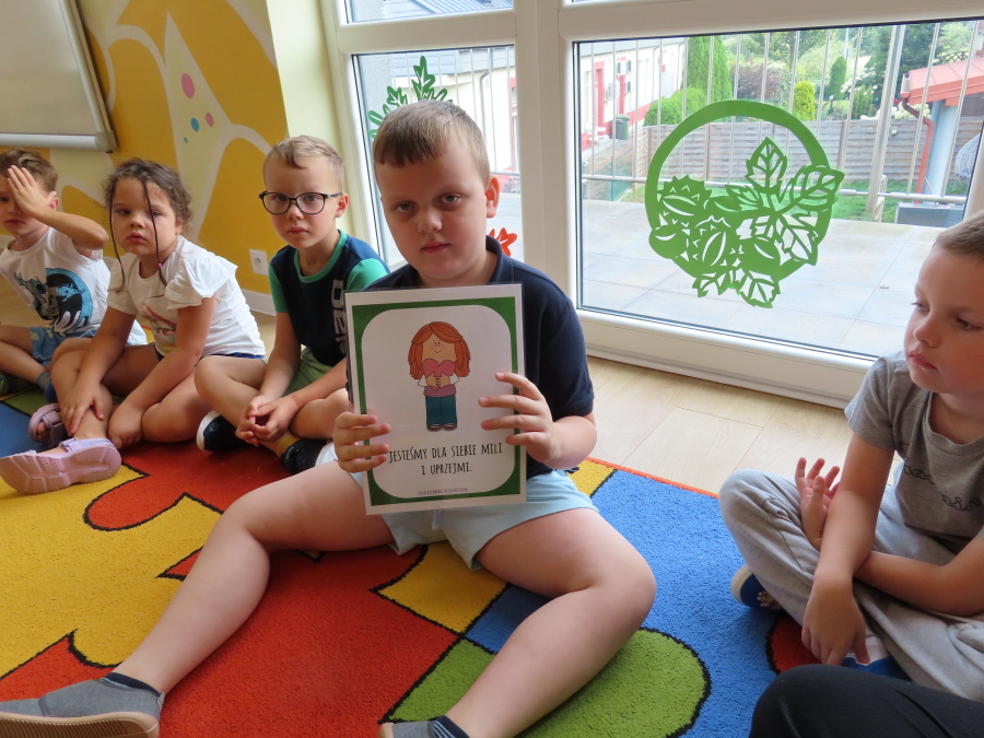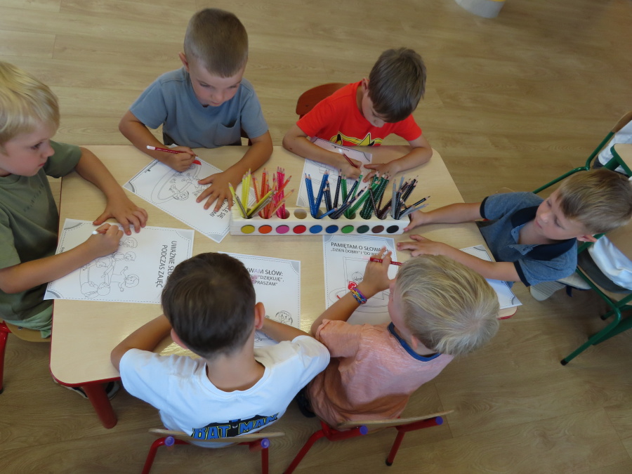 Kropeczki tworzyły dziś Kodeks grupy. Dzieci losowały karty z różnymi zachowaniami, które mogą wystąpić w grupie. Omawiały sytuację przedstawioną na ilustracji i wspólnie decydowały, czy to zachowanie jest właściwe dla dobrej atmosfery w grupie przedszkolnej. Przedszkolaki pokolorowały również ilustracje z zasadami które obowiązują w ich grupie. Każda Kropeczka potwierdziła swoje zatwierdzenie Kodeksu odciskiem palca.