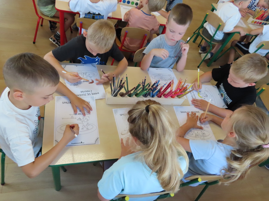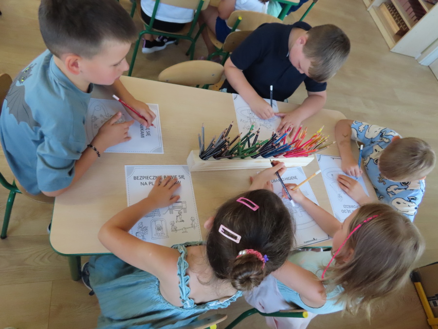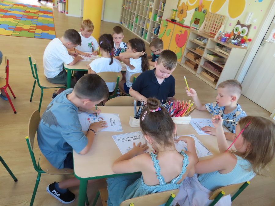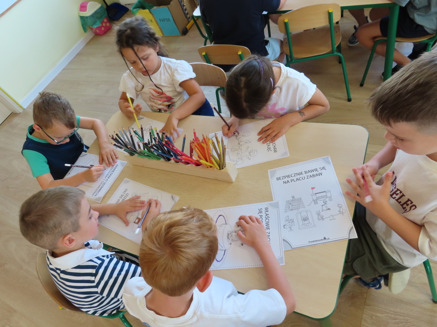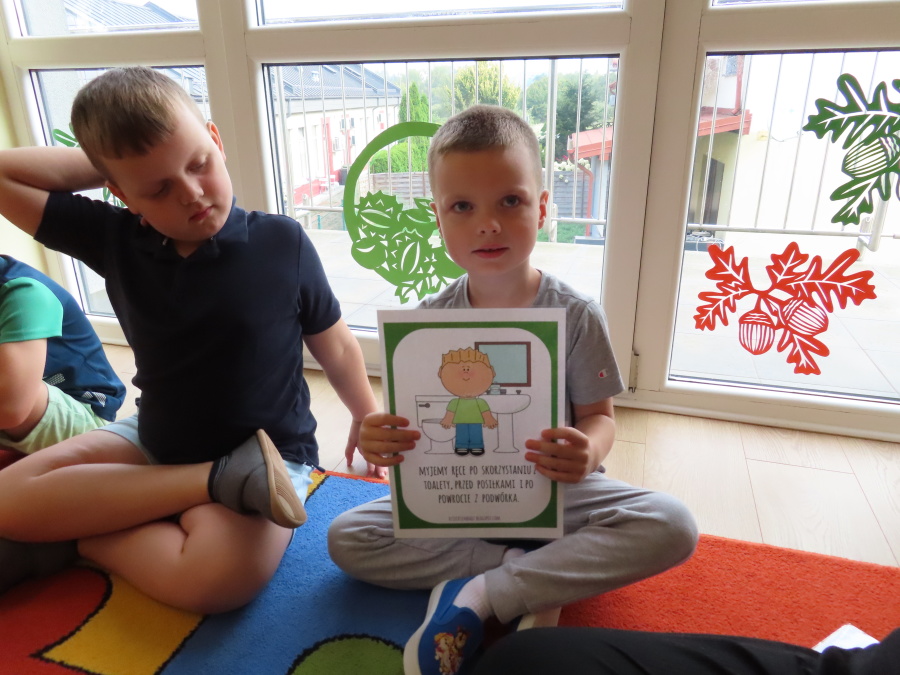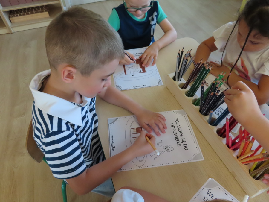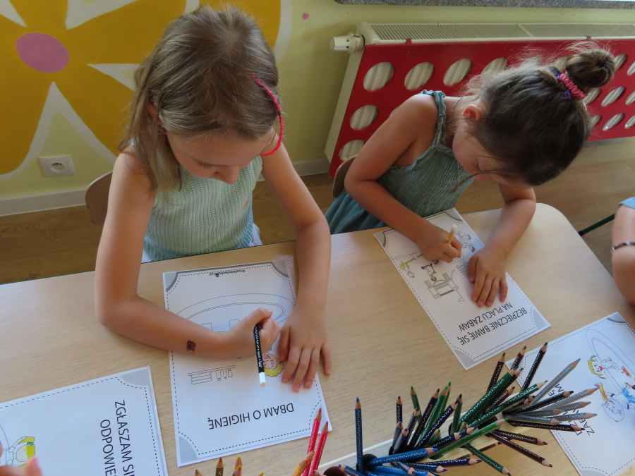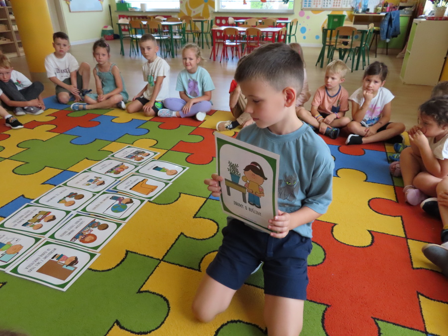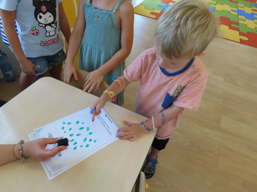 Kropeczki tworzyły dziś Kodeks grupy. Dzieci losowały karty z różnymi zachowaniami, które mogą wystąpić w grupie. Omawiały sytuację przedstawioną na ilustracji i wspólnie decydowały, czy to zachowanie jest właściwe dla dobrej atmosfery w grupie przedszkolnej. Przedszkolaki pokolorowały również ilustracje z zasadami które obowiązują w ich grupie. Każda Kropeczka potwierdziła swoje zatwierdzenie Kodeksu odciskiem palca.