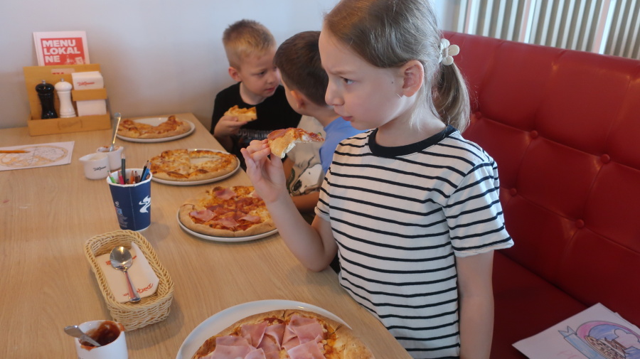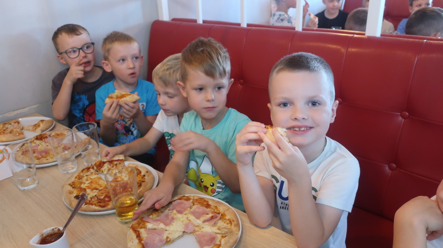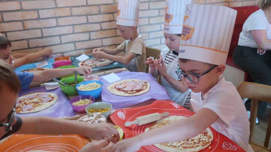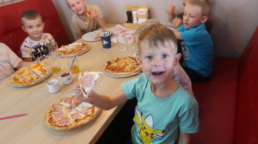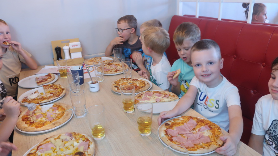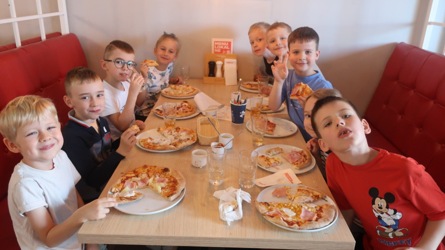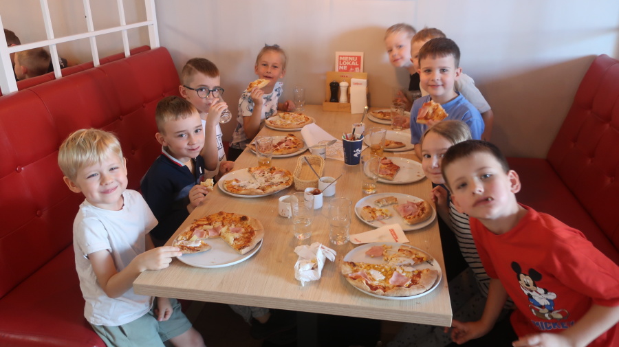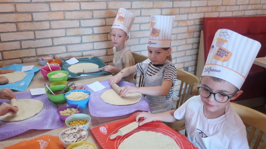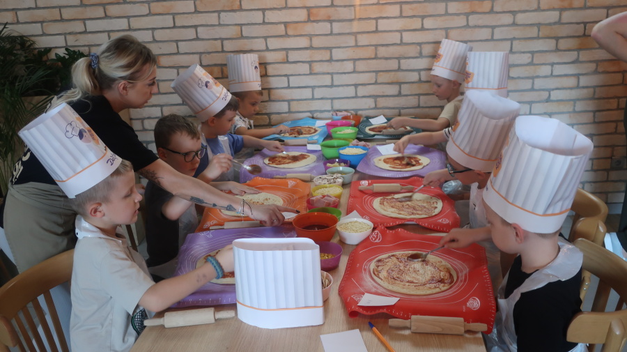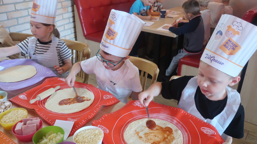 Dzień Przedszkolaka Kropeczki spędziły dziś wcielając się w ,,Małych Kucharzy\". Dzieci udało się wraz z paniami i do pizzerii gdzie brało udział w warsztatach robienia pizzy. Przedszkolaki wałkowały ciasto, nakładały na nie sos, następnie układały swoje ulubione składniki. W oczekiwaniu na pizzę dzieci kolorowały kolorowanki. Każda przygotowana pizza, po lekkim ostygnięciu, została spałaszowana. Kropeczki wykazały sie w pizzerii kulturą i koleżeństwem dzieląc się z koleżankami i kolegami swoją pizzą.