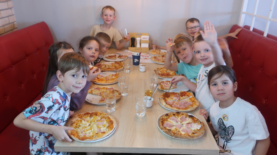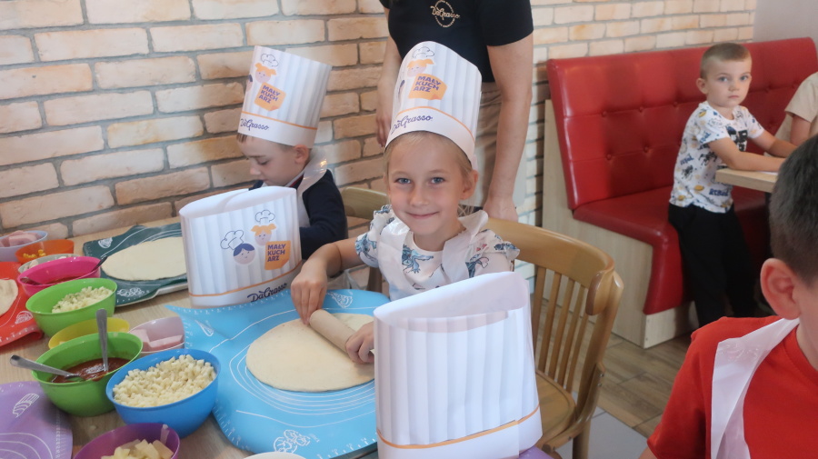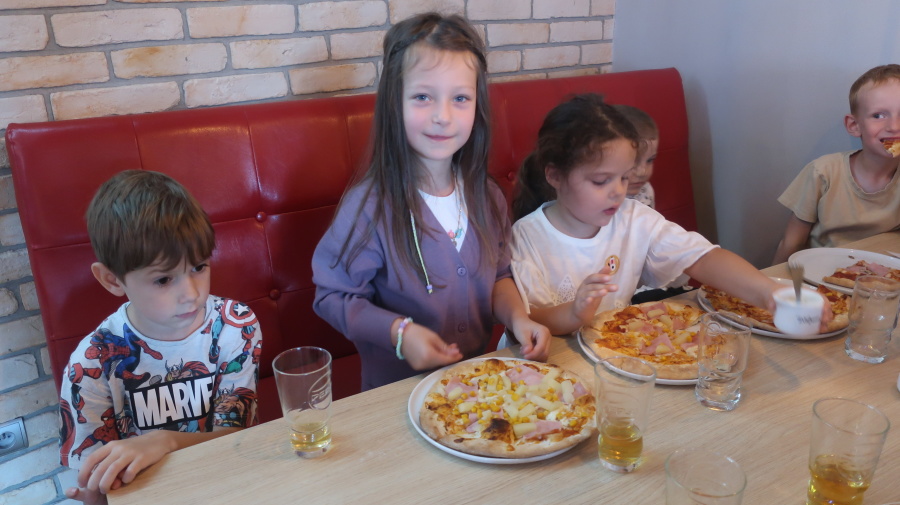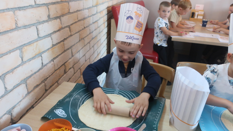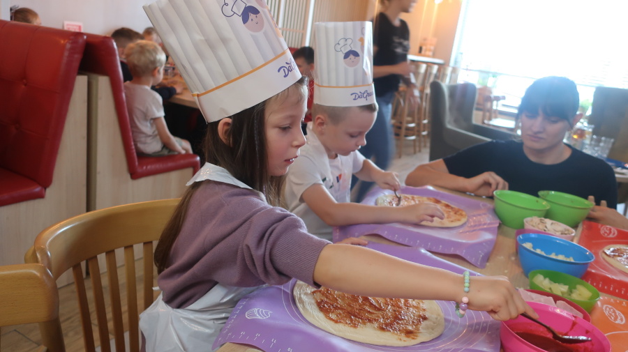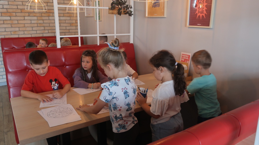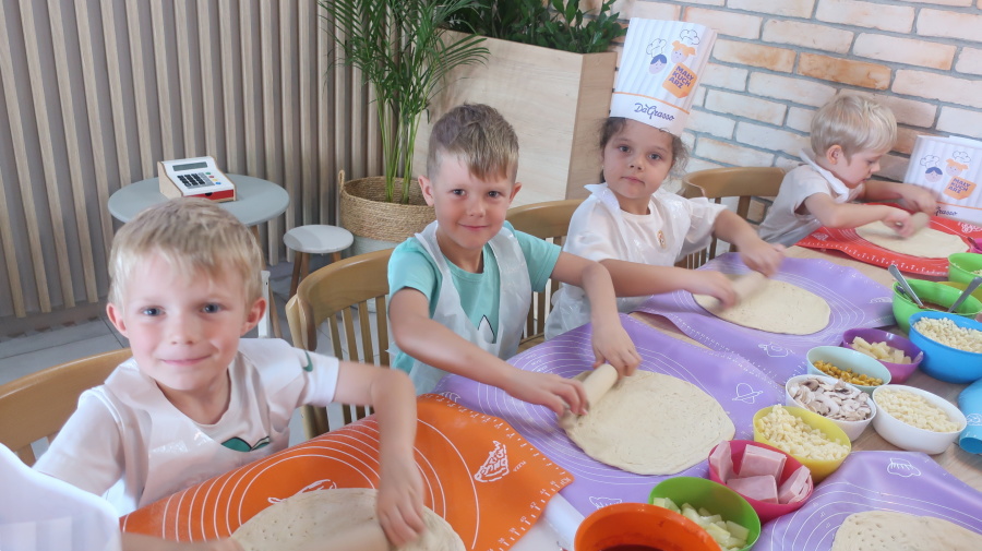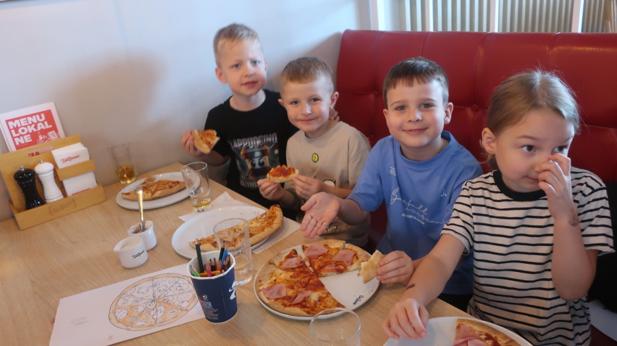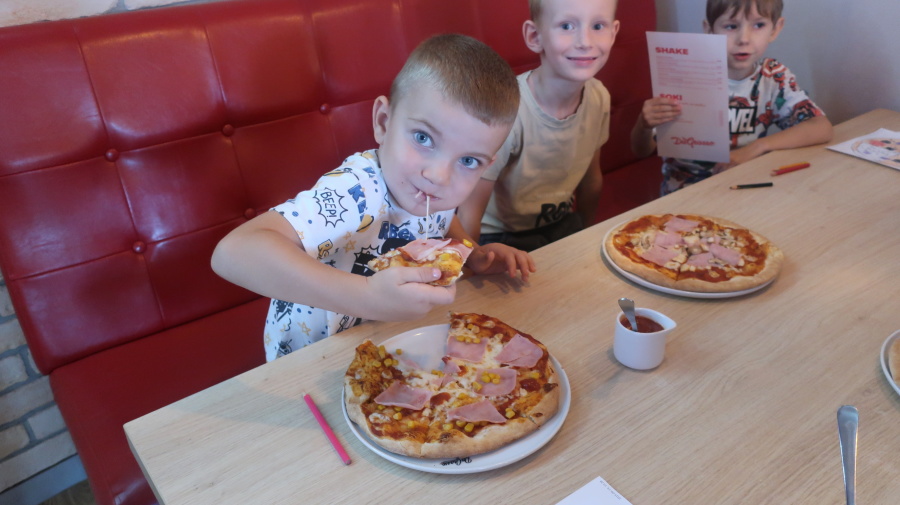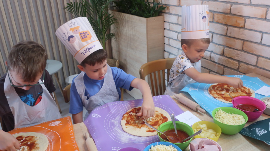 Dzień Przedszkolaka Kropeczki spędziły dziś wcielając się w ,,Małych Kucharzy\". Dzieci udało się wraz z paniami i do pizzerii gdzie brało udział w warsztatach robienia pizzy. Przedszkolaki wałkowały ciasto, nakładały na nie sos, następnie układały swoje ulubione składniki. W oczekiwaniu na pizzę dzieci kolorowały kolorowanki. Każda przygotowana pizza, po lekkim ostygnięciu, została spałaszowana. Kropeczki wykazały sie w pizzerii kulturą i koleżeństwem dzieląc się z koleżankami i kolegami swoją pizzą.