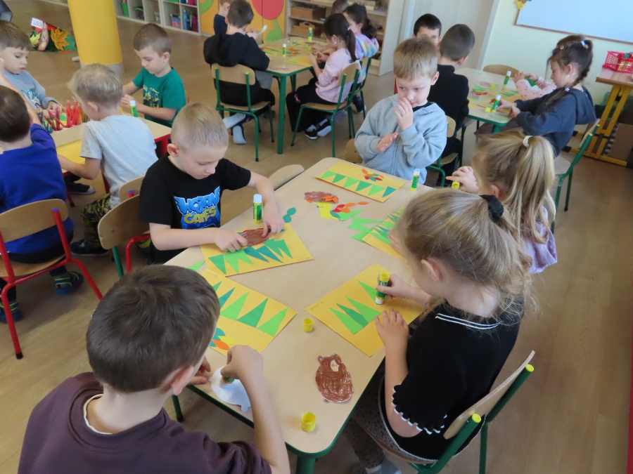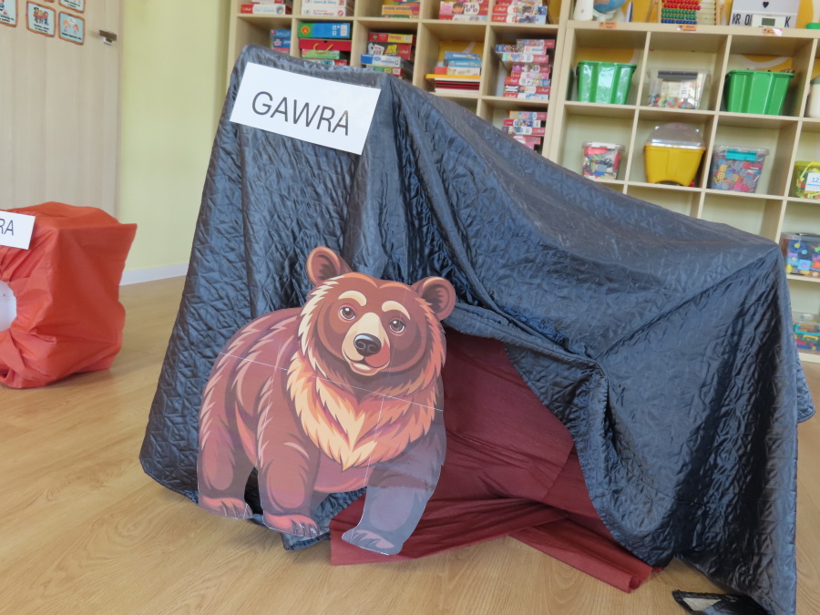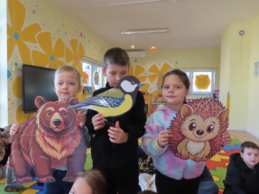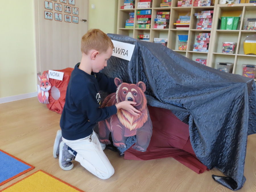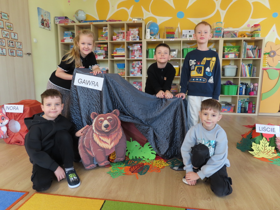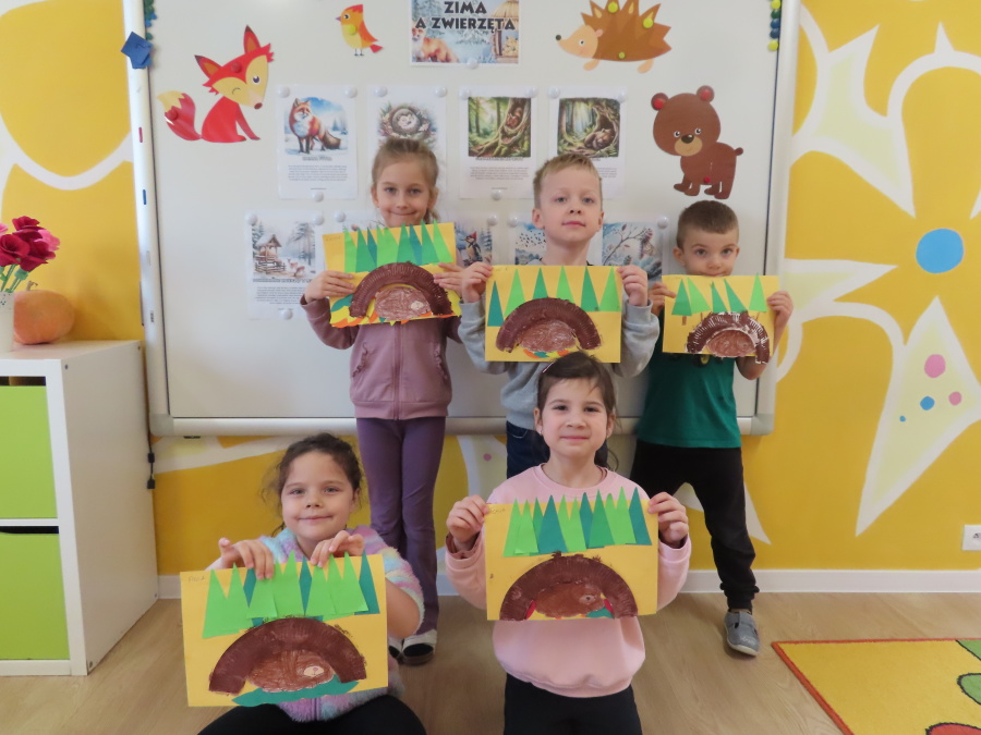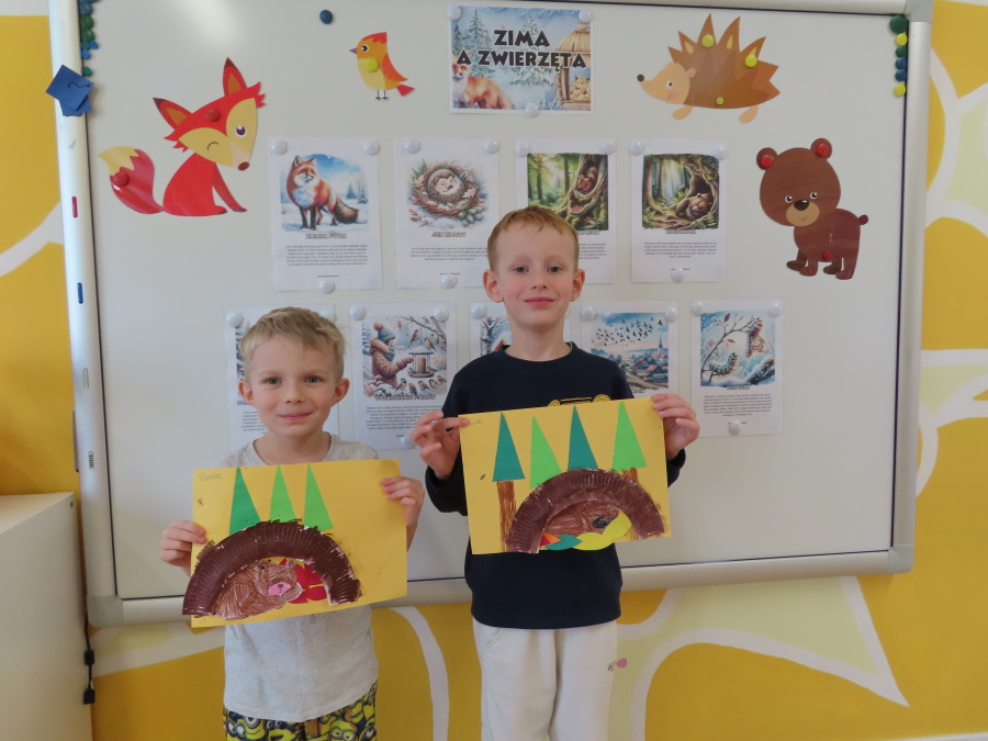 „Jak zwierzęta przygotowują się do zimy?” - pod tym hasłem odbyły się dzisiejsze zajęcia w grupie Kropeczek. Dzieci dowiedziały się, że zwierzęta przygotowują się do nadchodzącej mroźnej pory roku na kilka sposobów: poprzez migrację do cieplejszych krajów (np. bociany, żurawie), gromadzenie zapasów (np. wiewiórki, które zakopują orzechy), zmianę ubarwienia lub futra na zimowe (np. zające, sarny), czy zapadanie w sen zimowy lub hibernację (np. niedźwiedzie, jeże). Przedszkolaki wspólnie tworzyły „domy” dla poszczególnych zwierząt zimujących w Polsce oraz odszukiwały i dopasowywały podpisy różnorodnych schronień. Na zakończenie każde dziecko wykonało pracę plastyczną pt. „Gawra niedźwiedzia”.