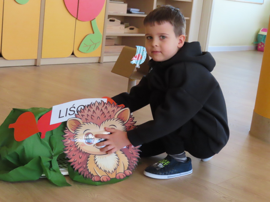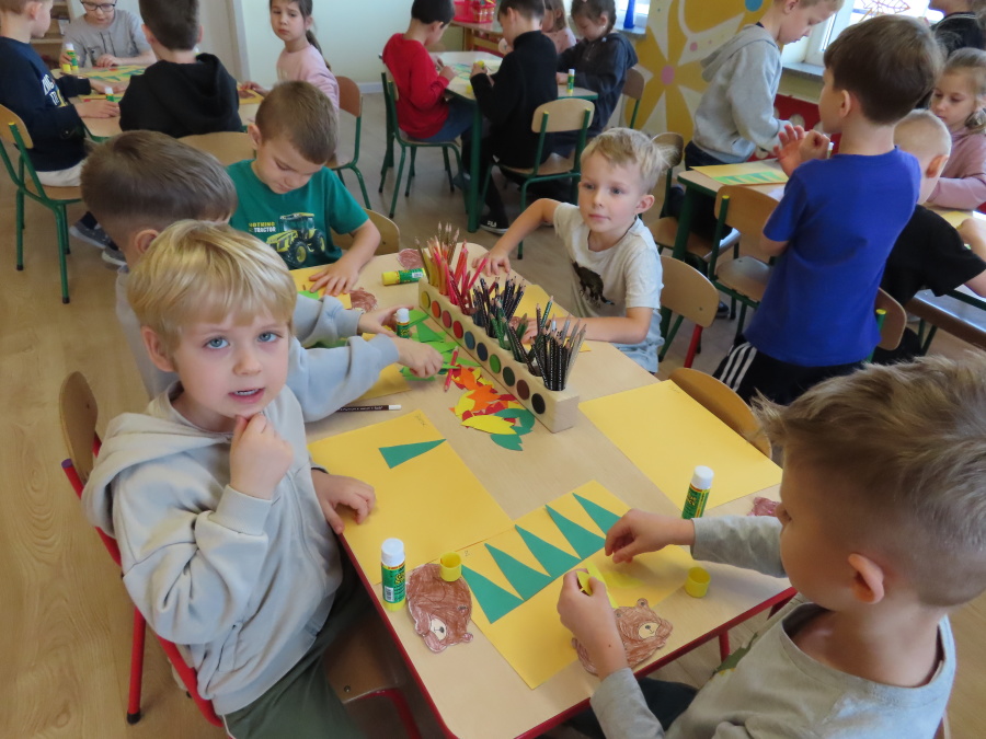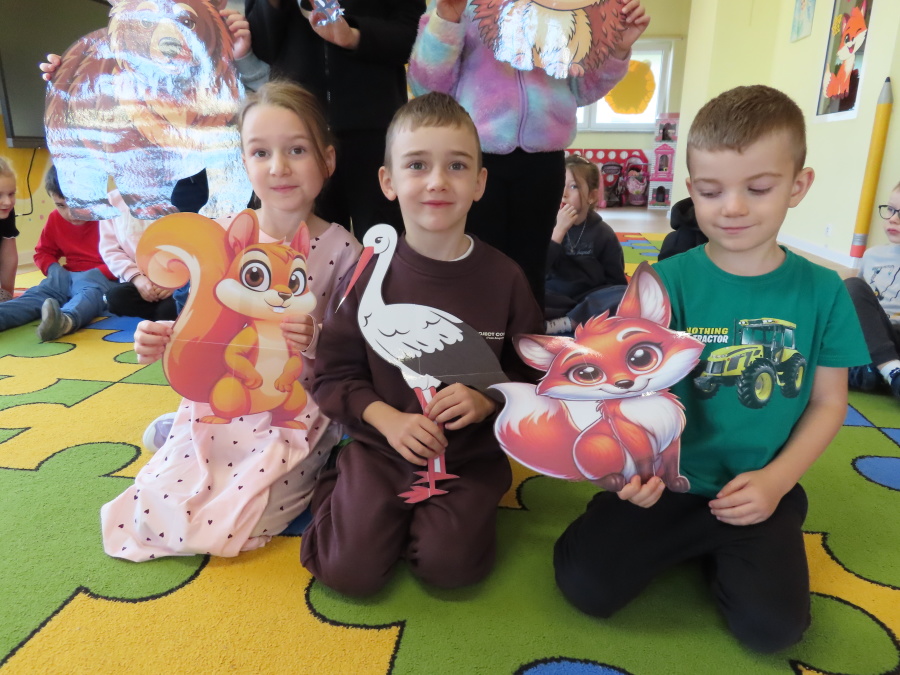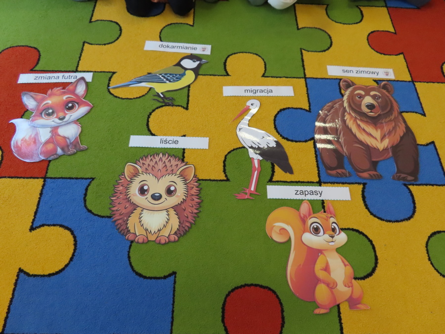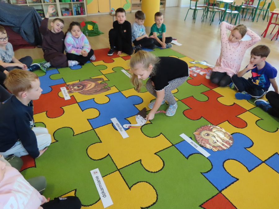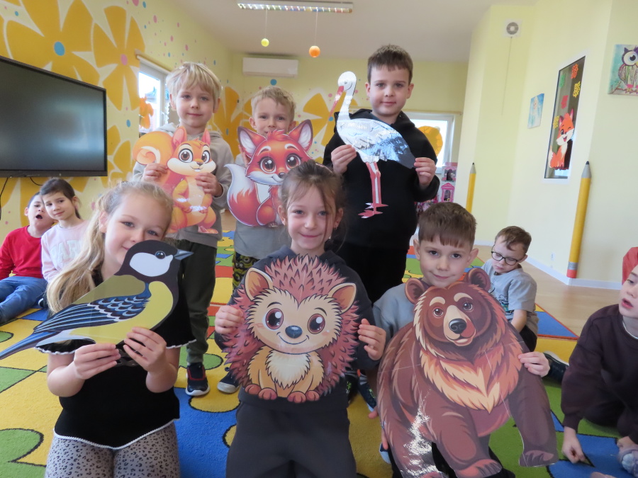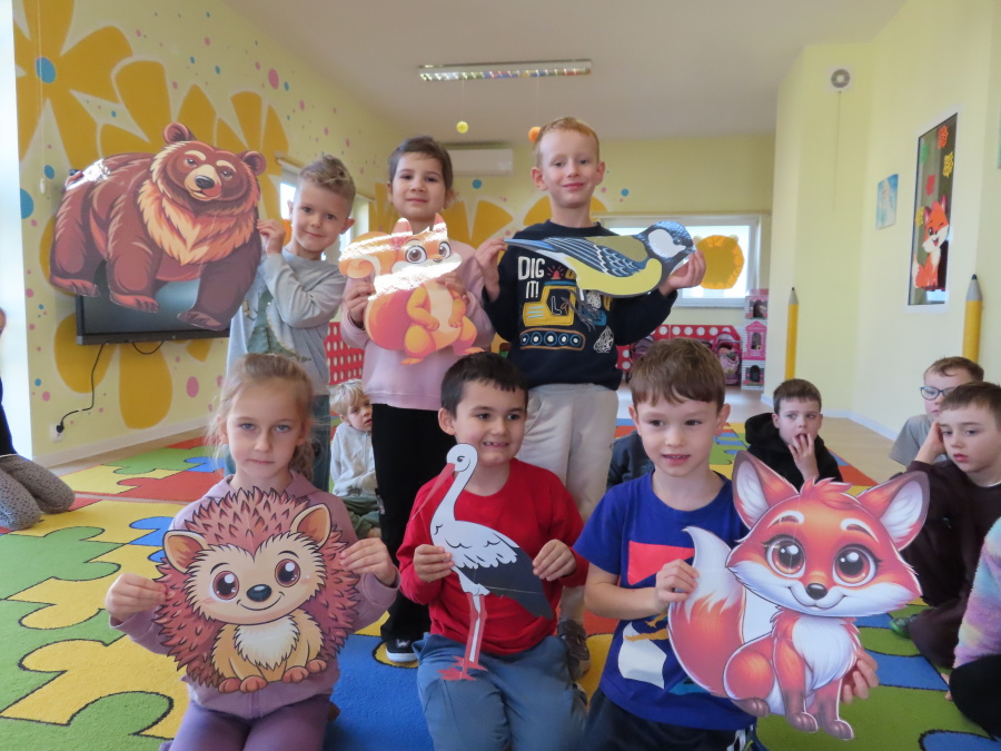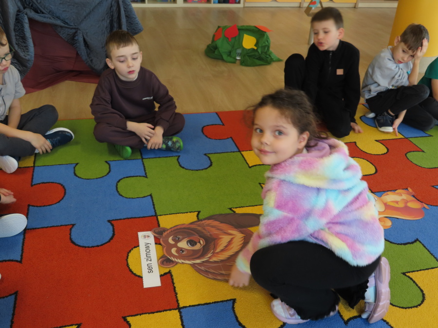 „Jak zwierzęta przygotowują się do zimy?” - pod tym hasłem odbyły się dzisiejsze zajęcia w grupie Kropeczek. Dzieci dowiedziały się, że zwierzęta przygotowują się do nadchodzącej mroźnej pory roku na kilka sposobów: poprzez migrację do cieplejszych krajów (np. bociany, żurawie), gromadzenie zapasów (np. wiewiórki, które zakopują orzechy), zmianę ubarwienia lub futra na zimowe (np. zające, sarny), czy zapadanie w sen zimowy lub hibernację (np. niedźwiedzie, jeże). Przedszkolaki wspólnie tworzyły „domy” dla poszczególnych zwierząt zimujących w Polsce oraz odszukiwały i dopasowywały podpisy różnorodnych schronień. Na zakończenie każde dziecko wykonało pracę plastyczną pt. „Gawra niedźwiedzia”.