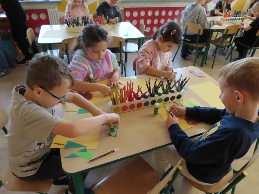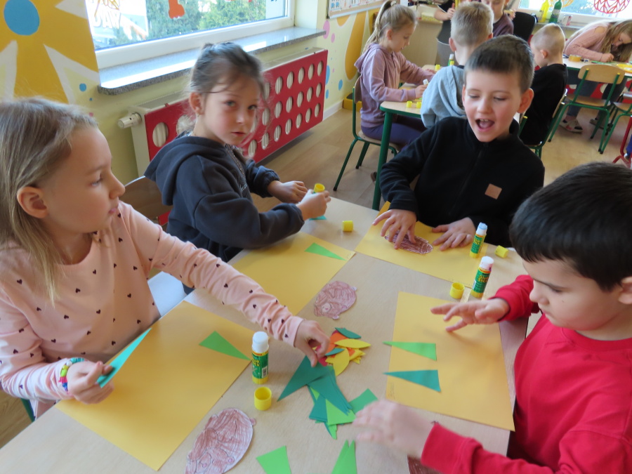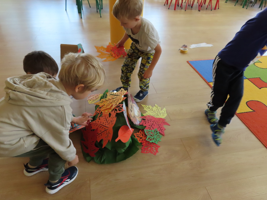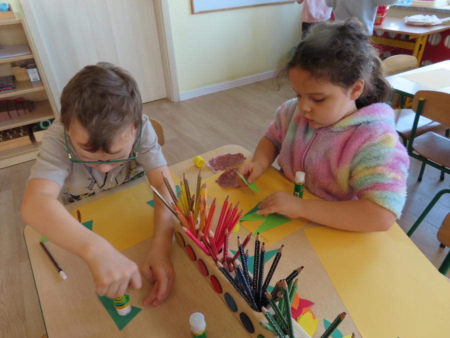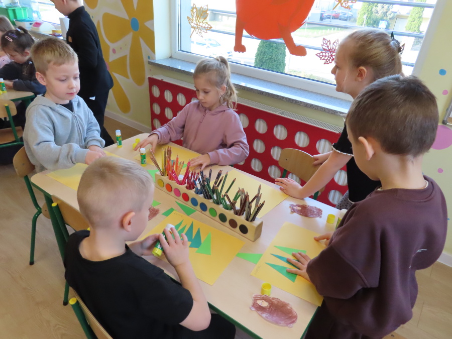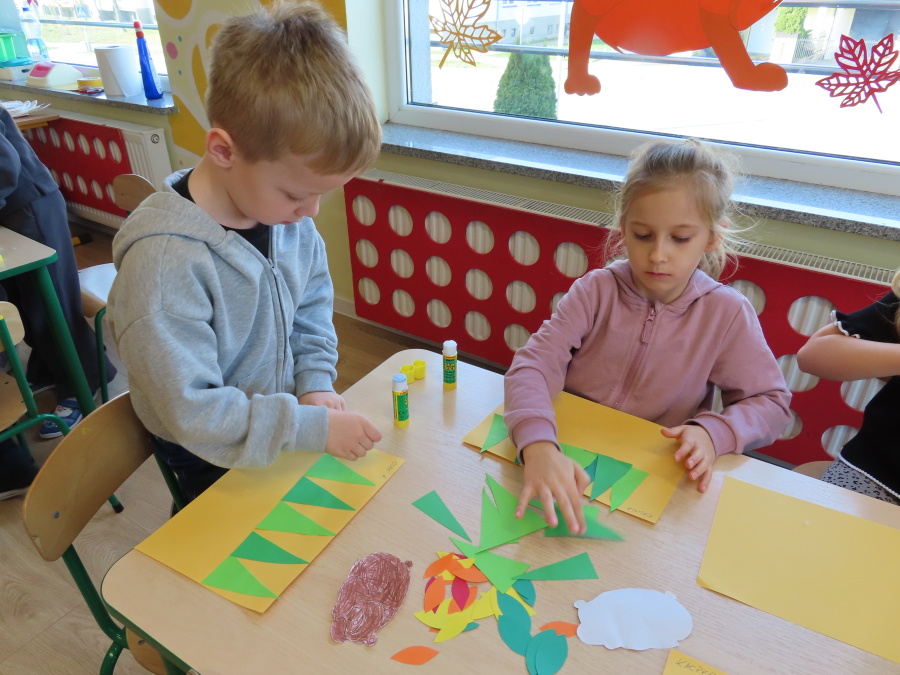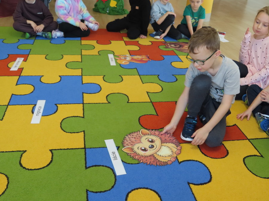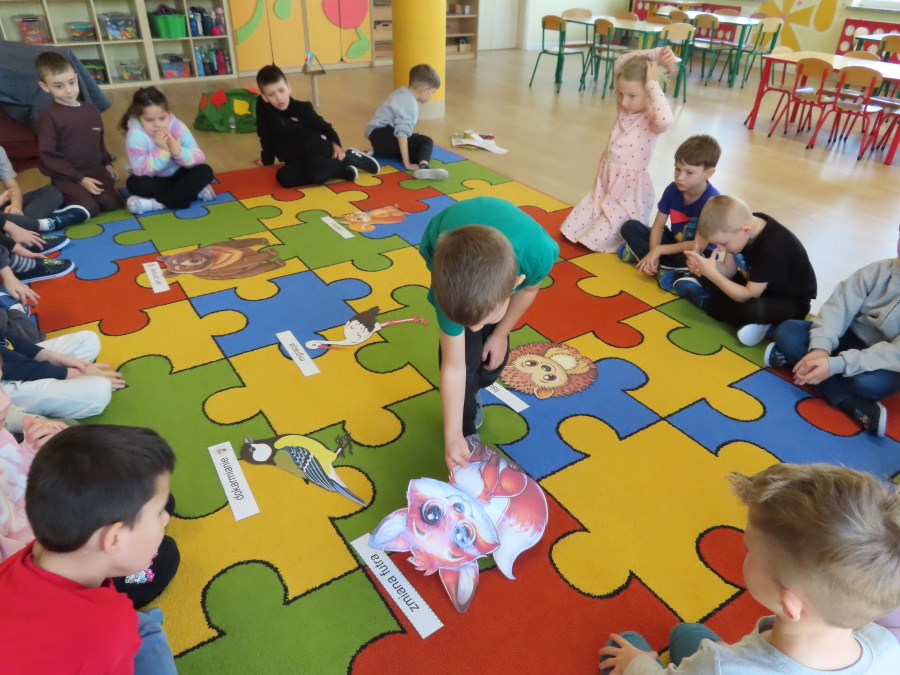 „Jak zwierzęta przygotowują się do zimy?” - pod tym hasłem odbyły się dzisiejsze zajęcia w grupie Kropeczek. Dzieci dowiedziały się, że zwierzęta przygotowują się do nadchodzącej mroźnej pory roku na kilka sposobów: poprzez migrację do cieplejszych krajów (np. bociany, żurawie), gromadzenie zapasów (np. wiewiórki, które zakopują orzechy), zmianę ubarwienia lub futra na zimowe (np. zające, sarny), czy zapadanie w sen zimowy lub hibernację (np. niedźwiedzie, jeże). Przedszkolaki wspólnie tworzyły „domy” dla poszczególnych zwierząt zimujących w Polsce oraz odszukiwały i dopasowywały podpisy różnorodnych schronień. Na zakończenie każde dziecko wykonało pracę plastyczną pt. „Gawra niedźwiedzia”.