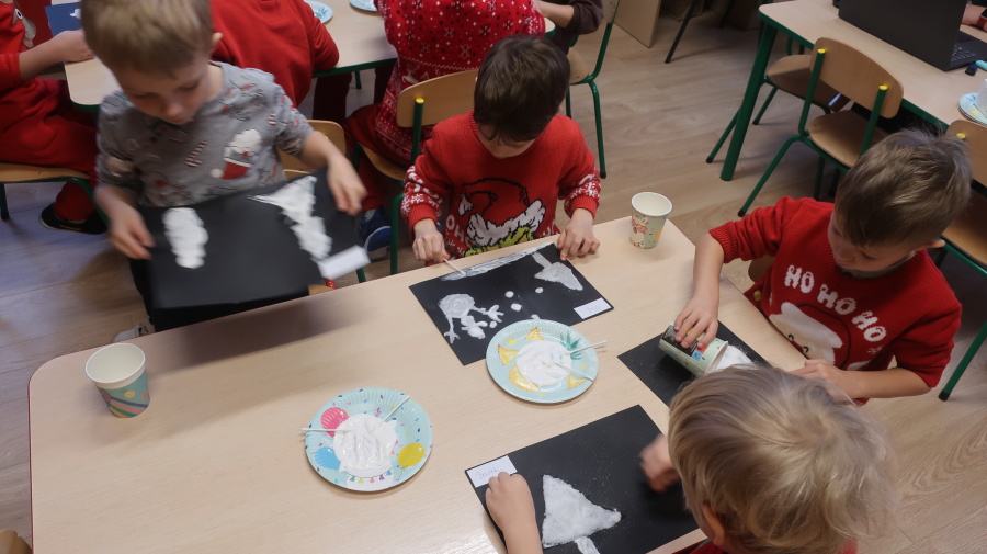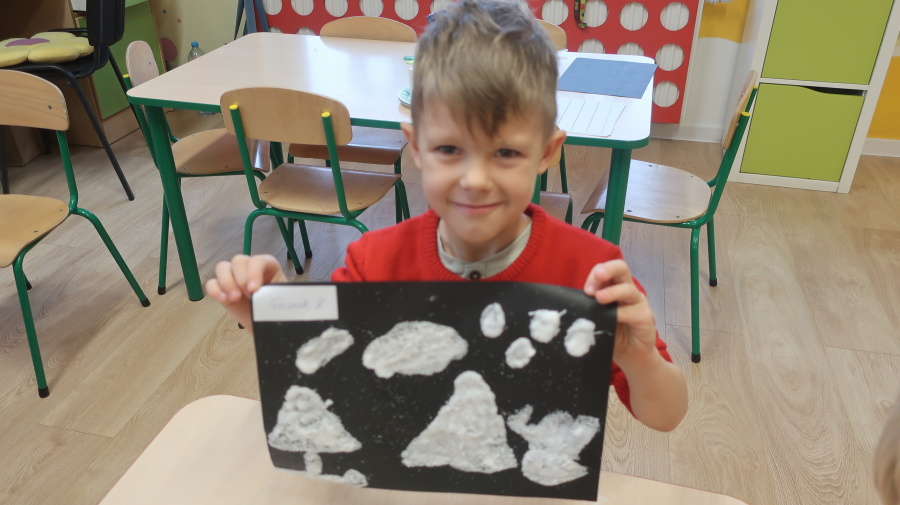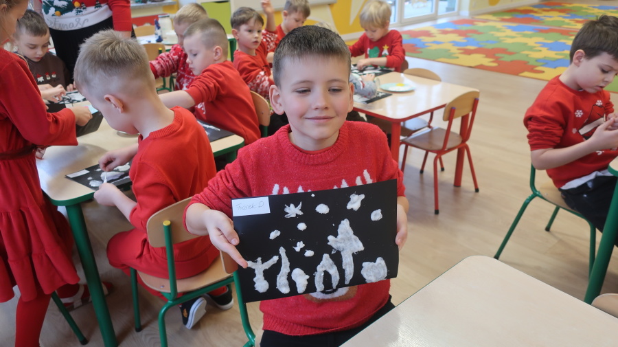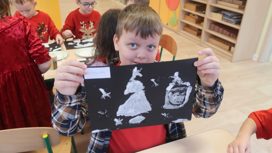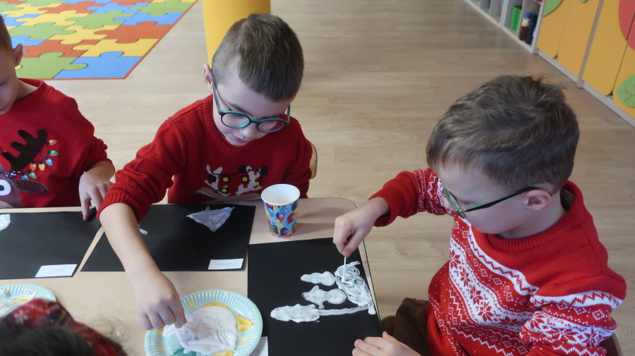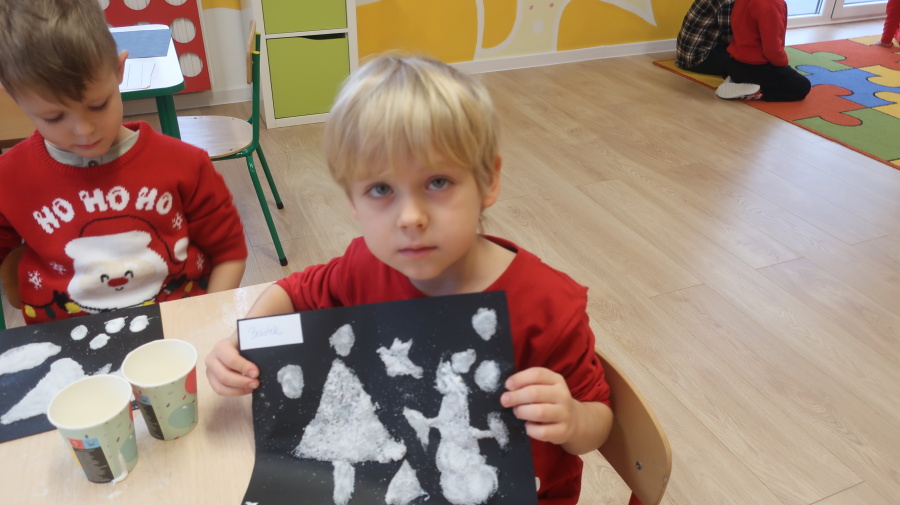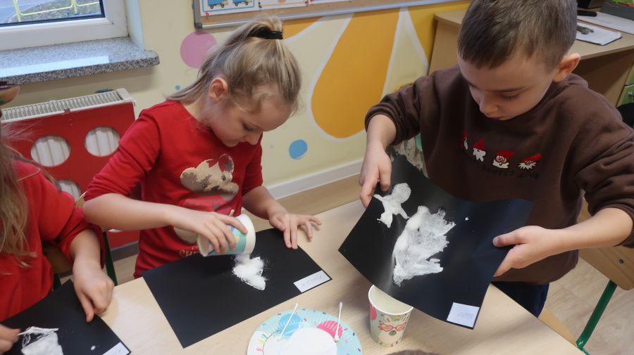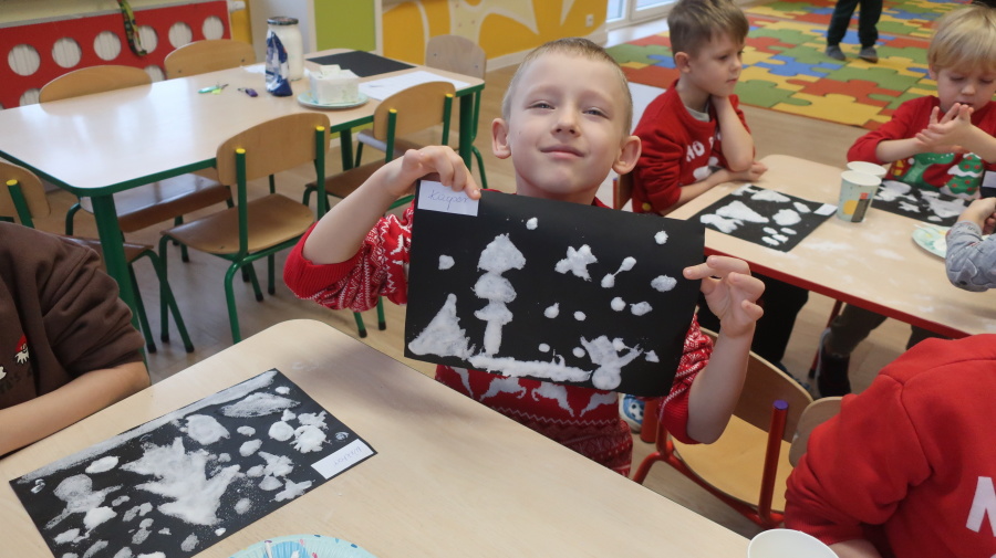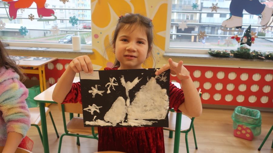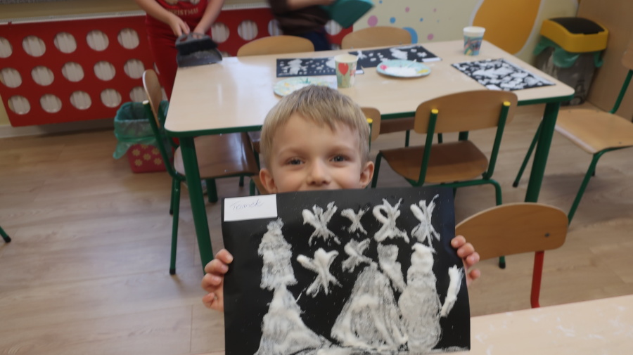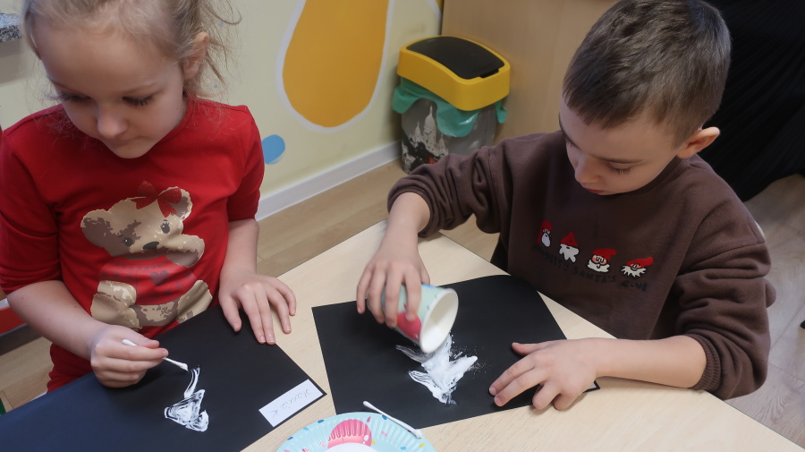 Arteterapia w grupie Kropeczek Dzisiaj podczas zajęć z arteterapii dzieci stworzyły zimowe pejzaże na czarnych kartkach używając kleju, patyczków do uszu oraz soli. Powstałe dzieła pokazują, jak kreatywność i dobra zabawa mogą iść w parze. Zajęcia z arteterapii pozwalają na wyrażanie emocji, pobudzanie wyobraźni i rozwijanie zdolności manualnych dzieci.