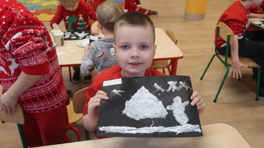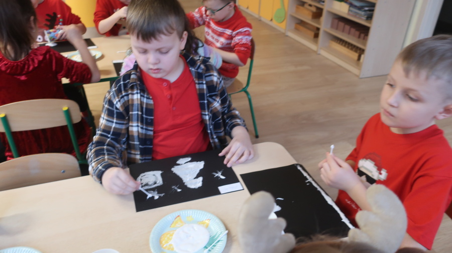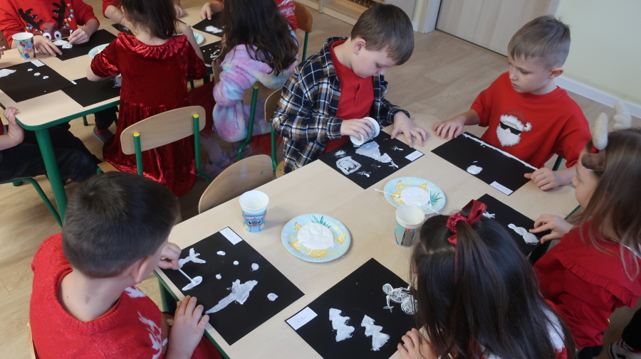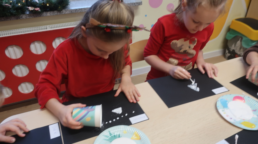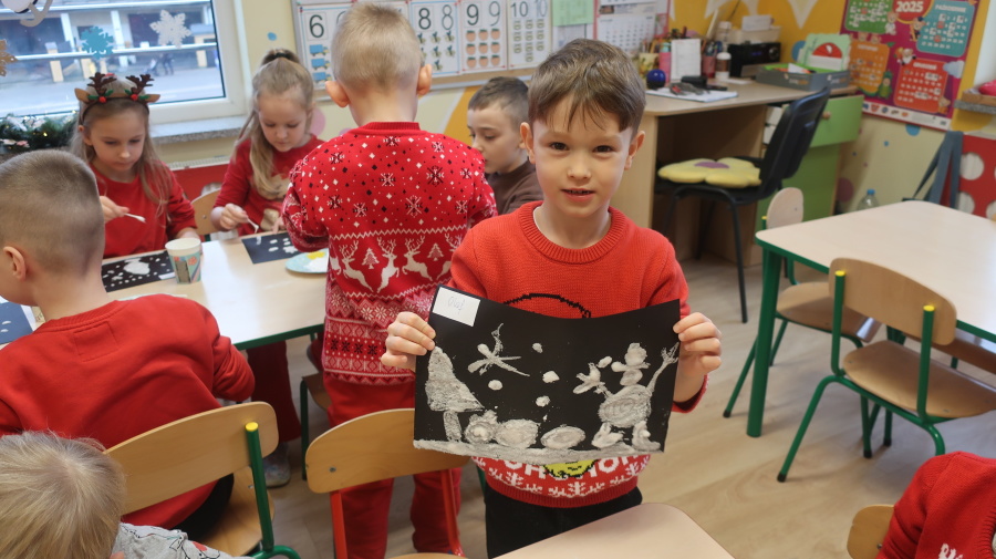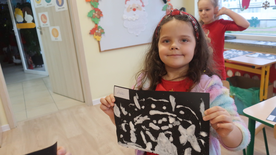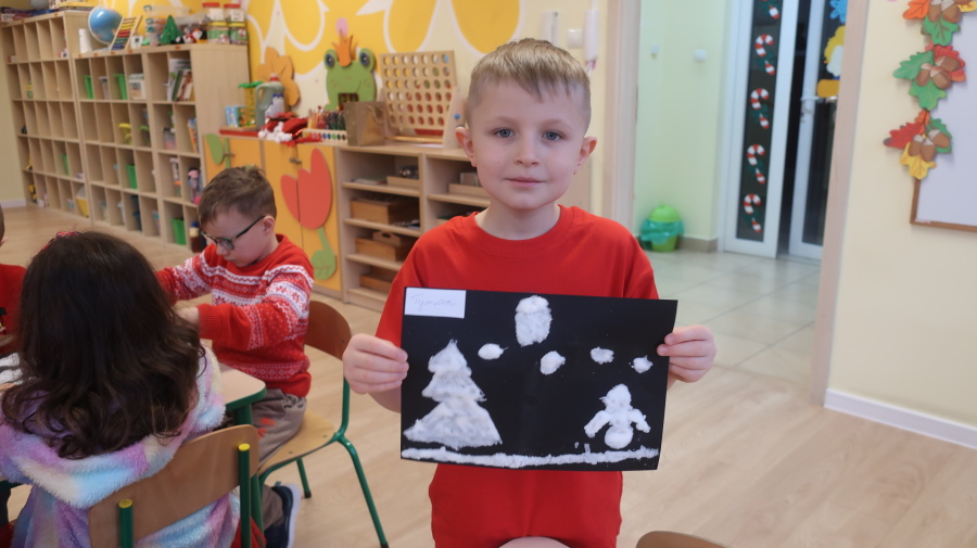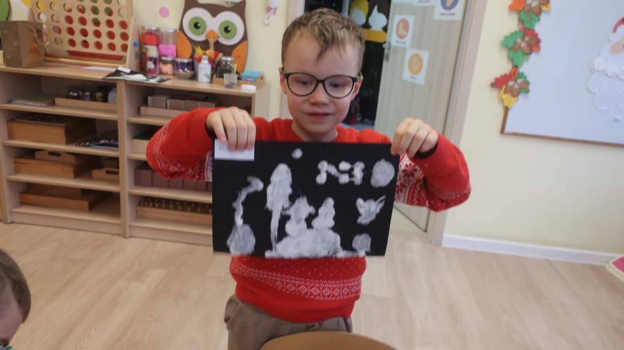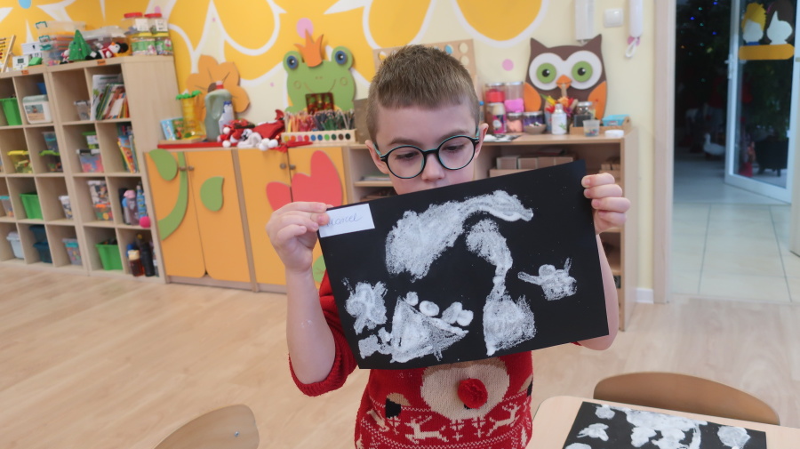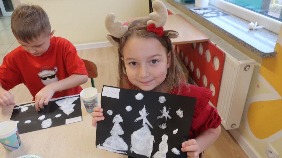 Arteterapia w grupie Kropeczek Dzisiaj podczas zajęć z arteterapii dzieci stworzyły zimowe pejzaże na czarnych kartkach używając kleju, patyczków do uszu oraz soli. Powstałe dzieła pokazują, jak kreatywność i dobra zabawa mogą iść w parze. Zajęcia z arteterapii pozwalają na wyrażanie emocji, pobudzanie wyobraźni i rozwijanie zdolności manualnych dzieci.