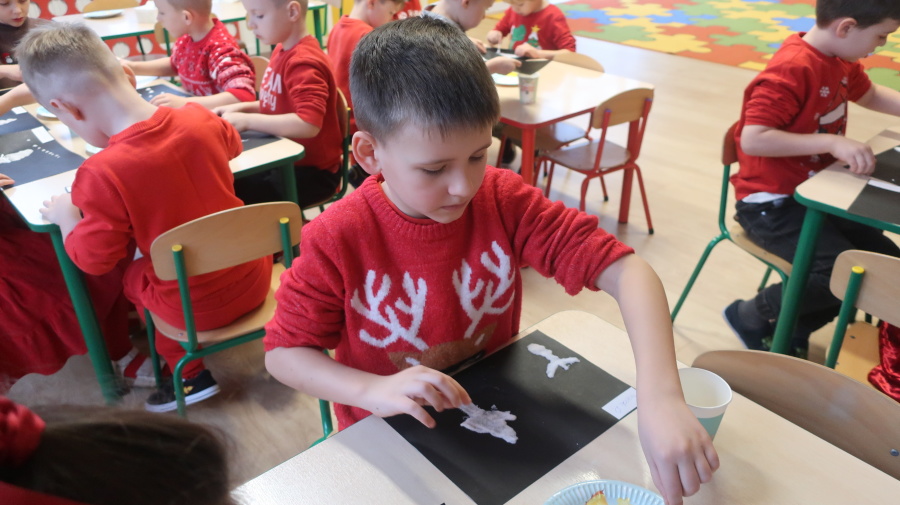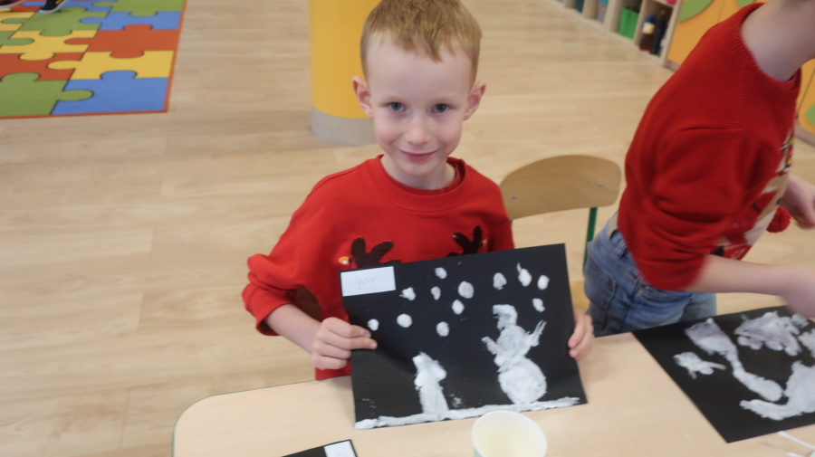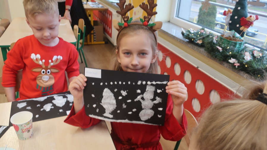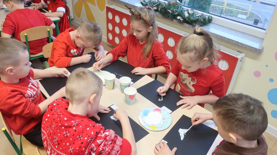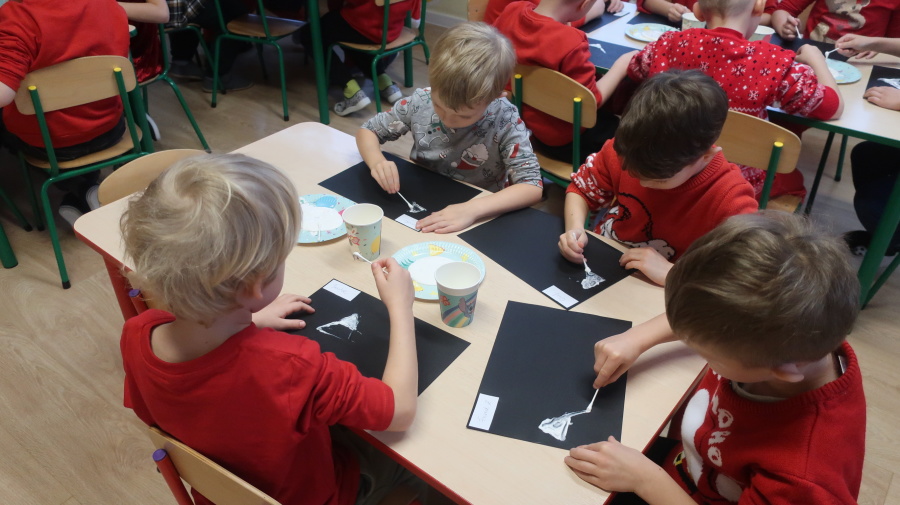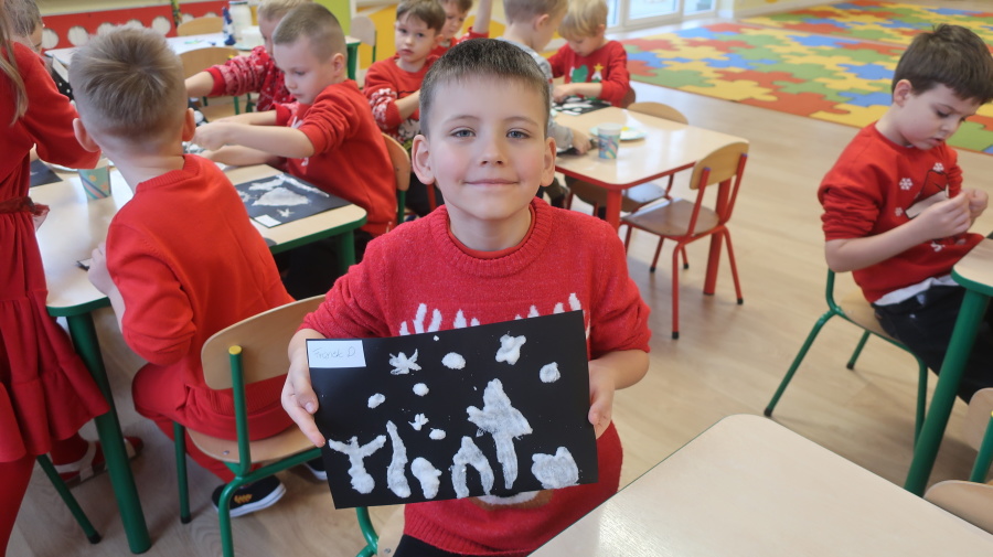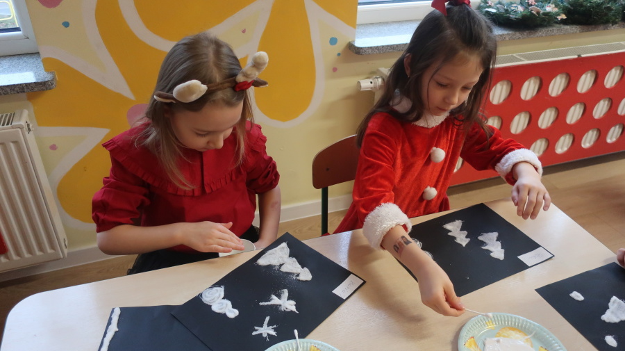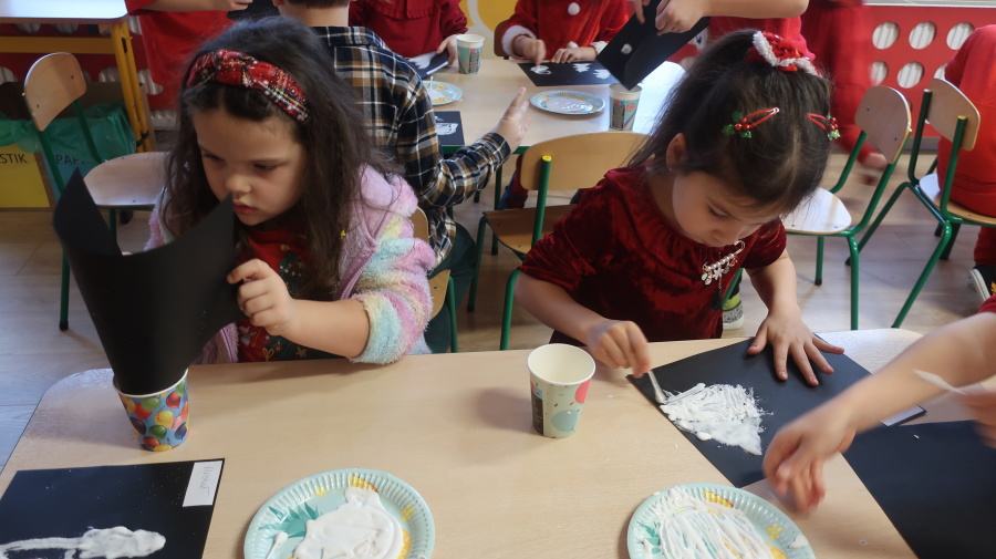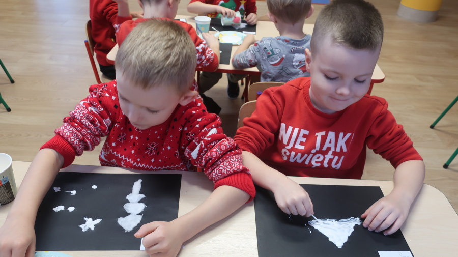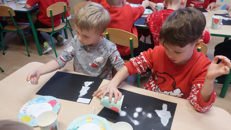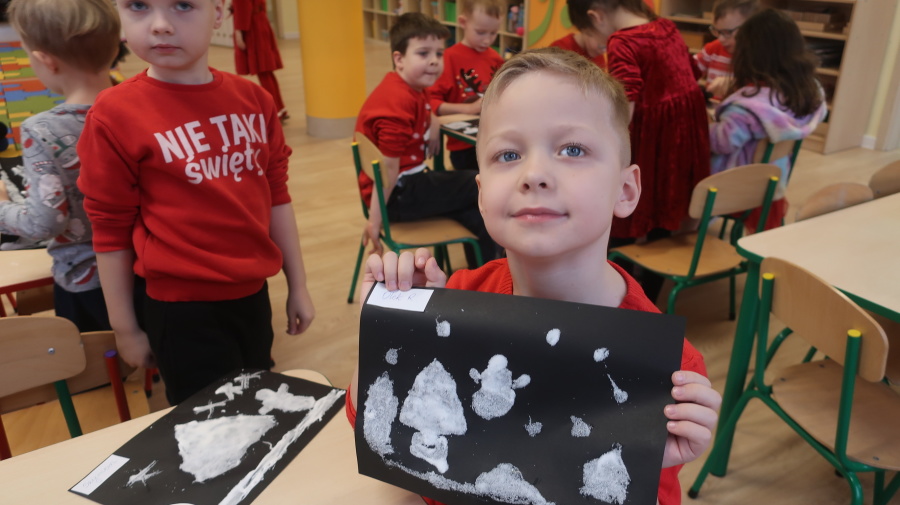Arteterapia w grupie Kropeczek Dzisiaj podczas zajęć z arteterapii dzieci stworzyły zimowe pejzaże na czarnych kartkach używając kleju, patyczków do uszu oraz soli. Powstałe dzieła pokazują, jak kreatywność i dobra zabawa mogą iść w parze. Zajęcia z arteterapii pozwalają na wyrażanie emocji, pobudzanie wyobraźni i rozwijanie zdolności manualnych dzieci.