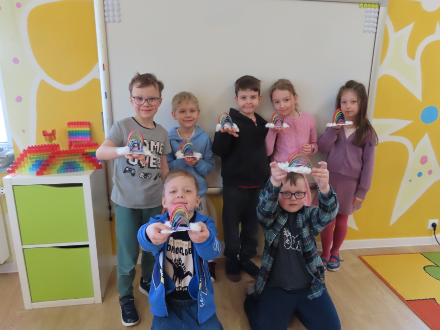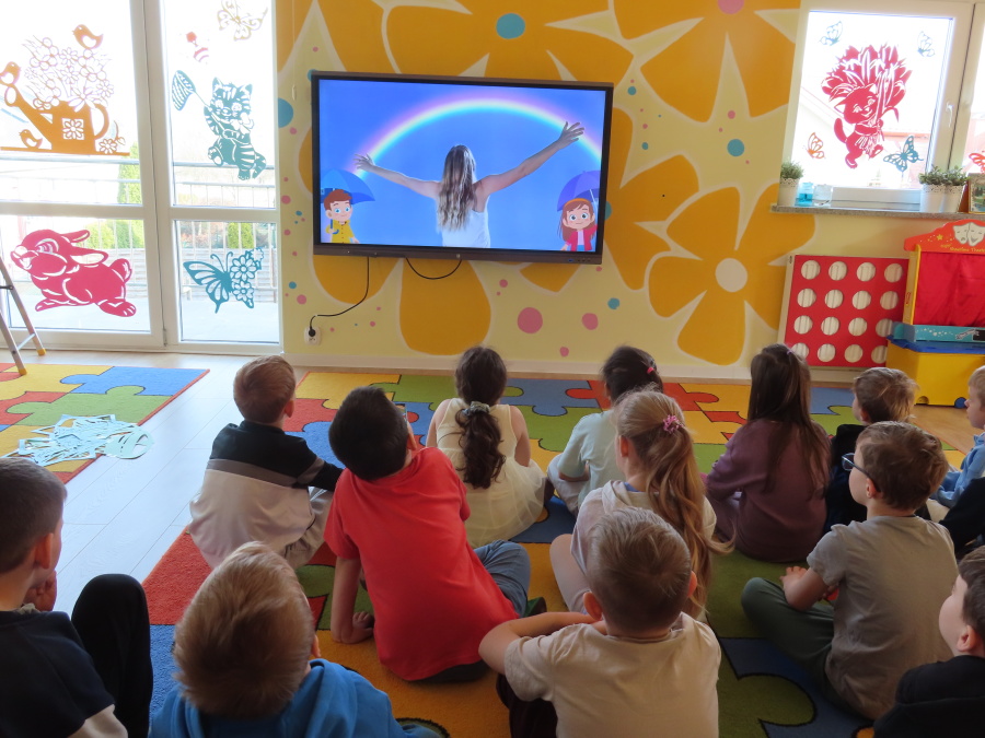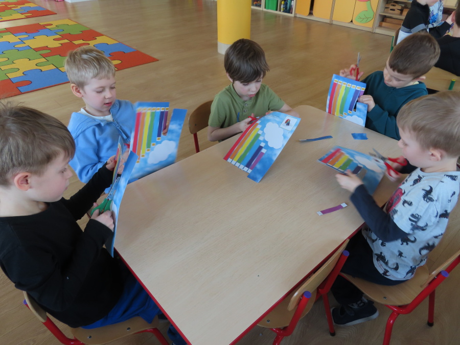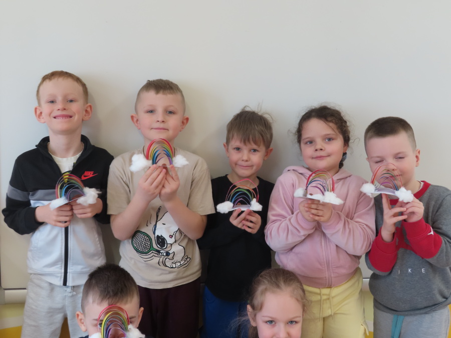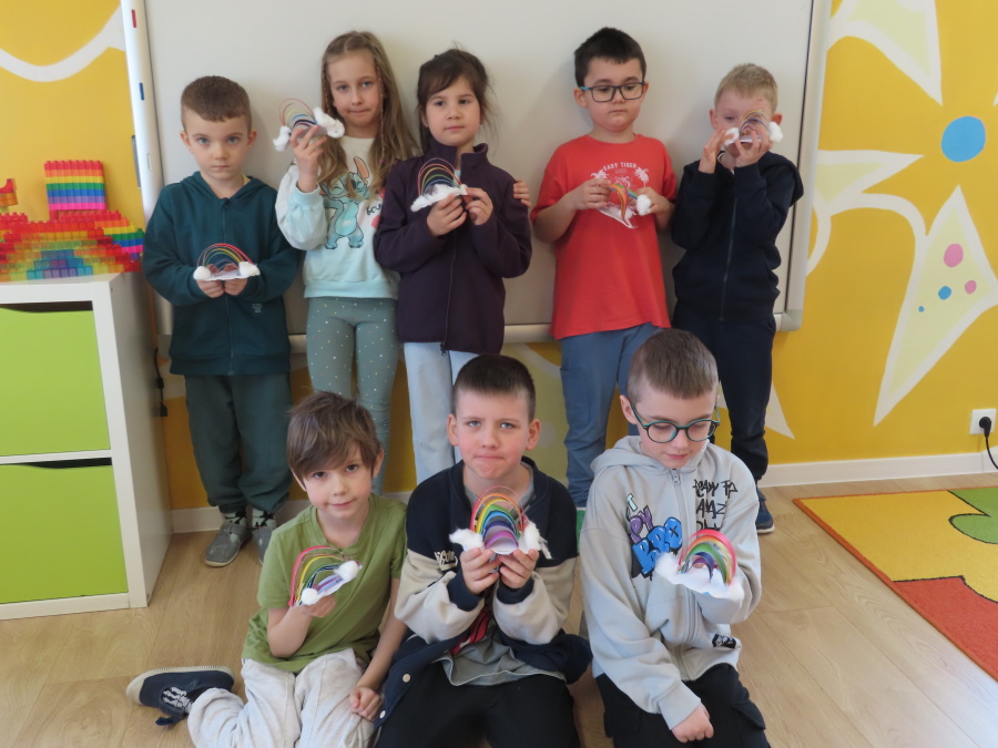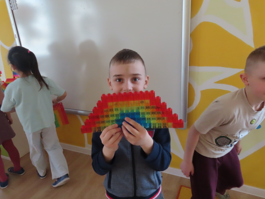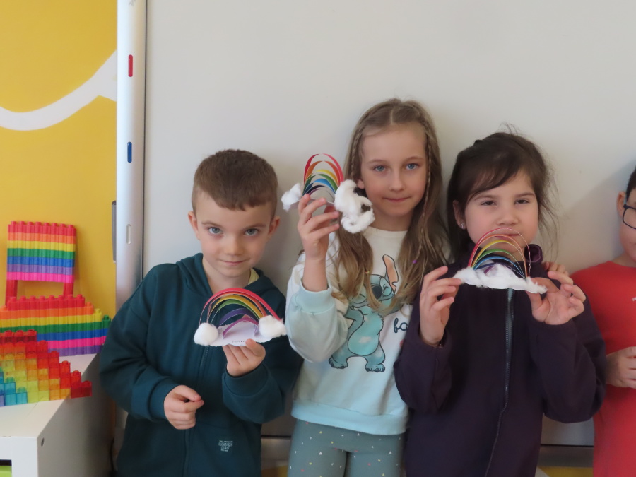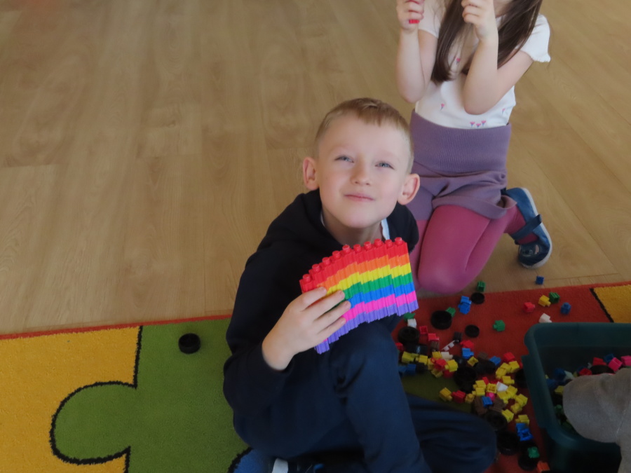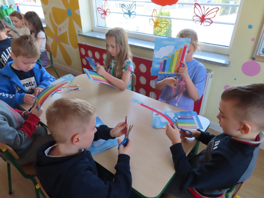 Na dzisiejszych zajęciach grupa Kropeczek rozmawiała o tęczy. Przedszkolaki obejrzały film edukacyjny o zjawiskach atmosferycznych, nazywali i przeliczali 7 kolorów tęczy. Dzieci wykonały doświadczenie pt.\" Jak powstaje tęcza\" za pomocą wody, lusterka i latarki. Uczestniczyły również w eksperymencie z bibułą, wodą i cukrem, aby zaobserwować wielobarwną ciecz. Dzieci tworzyły także tęcze z różnych rodzajów klocków dostępnych w przedszkolu. Na zakończenie Kropeczki wykonały tęczową pracę plastyczną. Była to doskonała okazja do nauki przez zabawę.