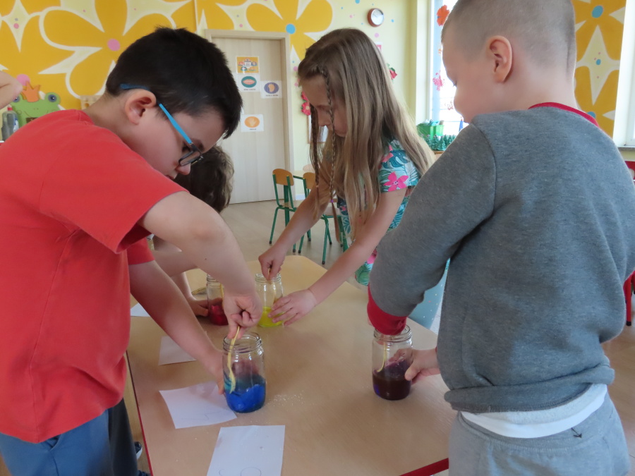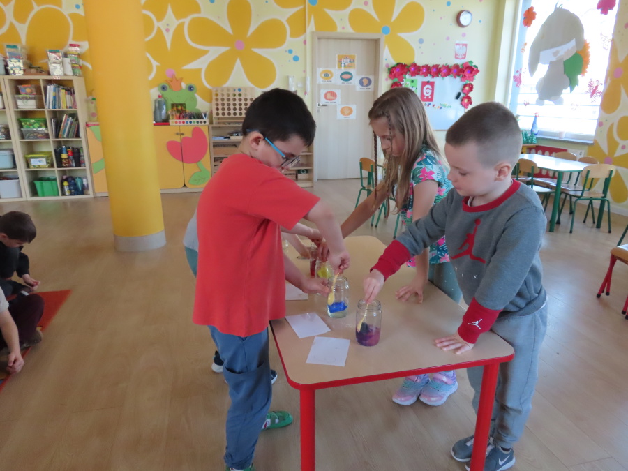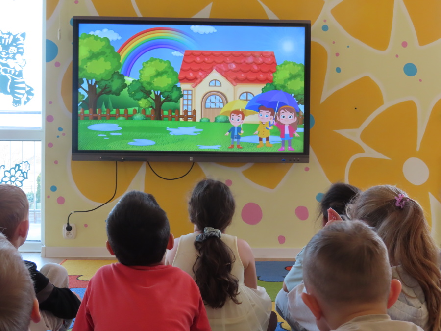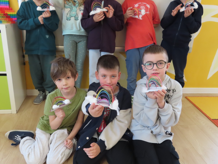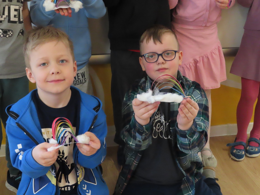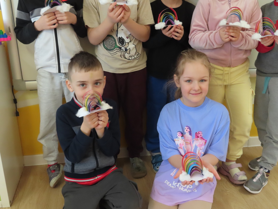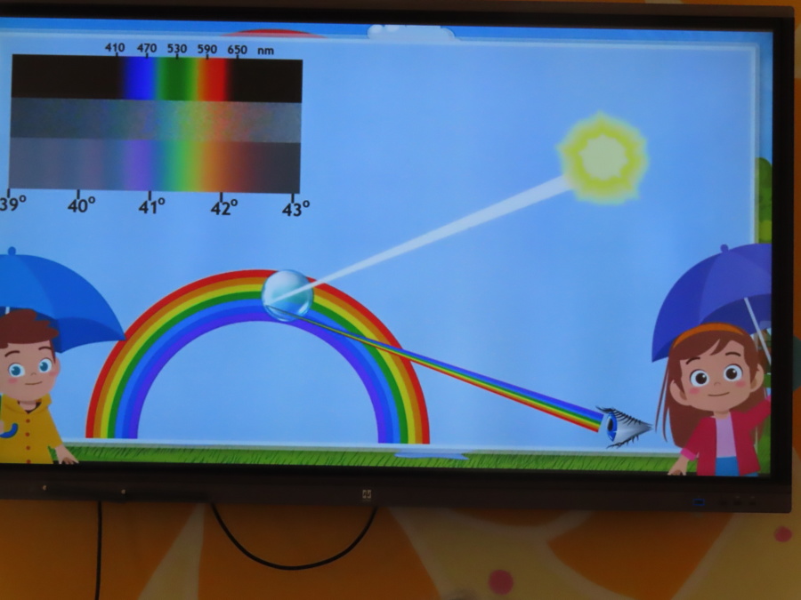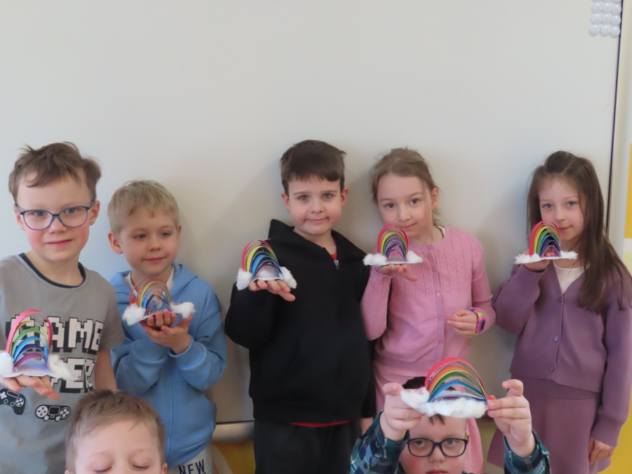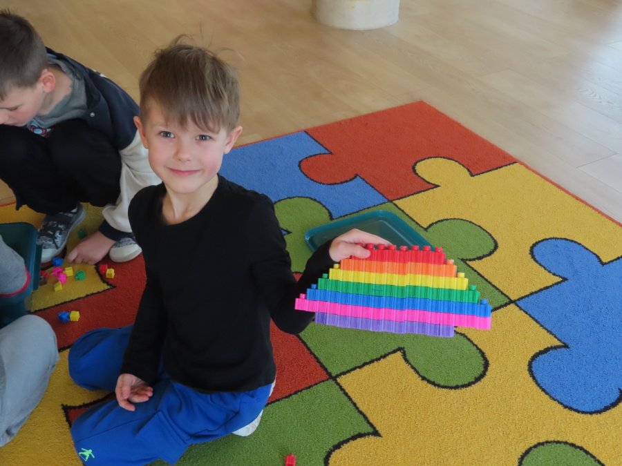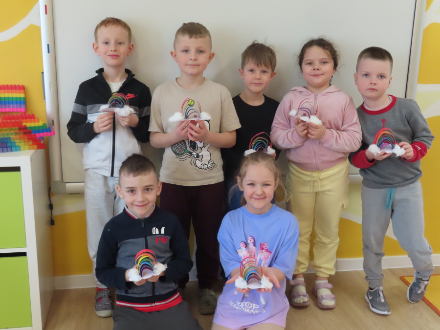 Na dzisiejszych zajęciach grupa Kropeczek rozmawiała o tęczy. Przedszkolaki obejrzały film edukacyjny o zjawiskach atmosferycznych, nazywali i przeliczali 7 kolorów tęczy. Dzieci wykonały doświadczenie pt.\" Jak powstaje tęcza\" za pomocą wody, lusterka i latarki. Uczestniczyły również w eksperymencie z bibułą, wodą i cukrem, aby zaobserwować wielobarwną ciecz. Dzieci tworzyły także tęcze z różnych rodzajów klocków dostępnych w przedszkolu. Na zakończenie Kropeczki wykonały tęczową pracę plastyczną. Była to doskonała okazja do nauki przez zabawę.