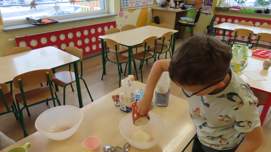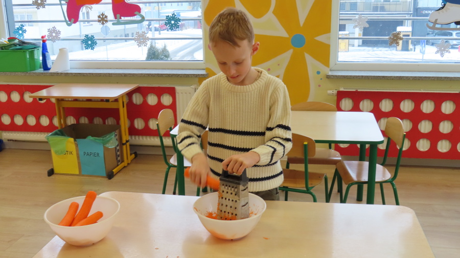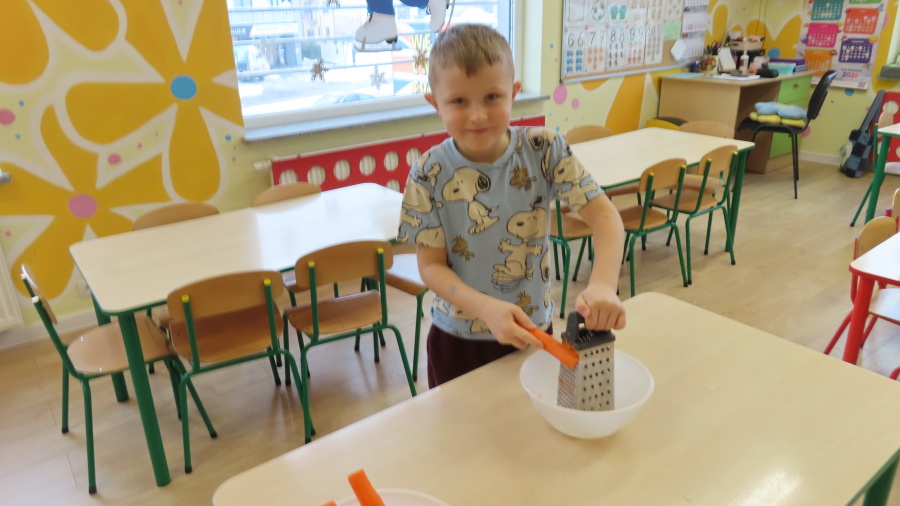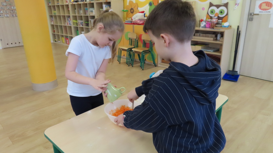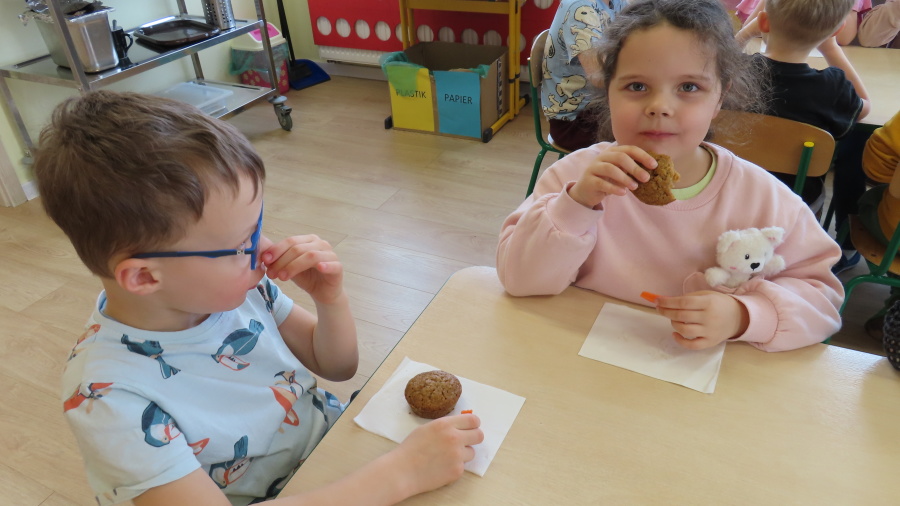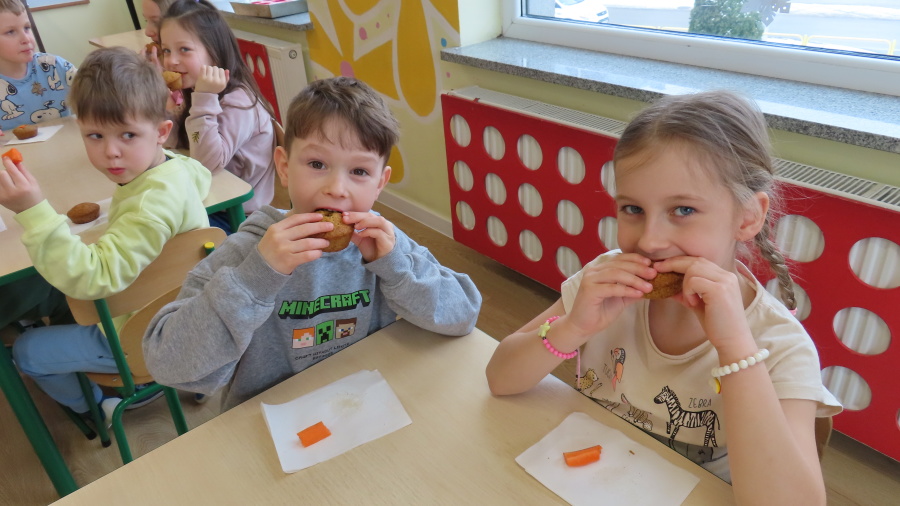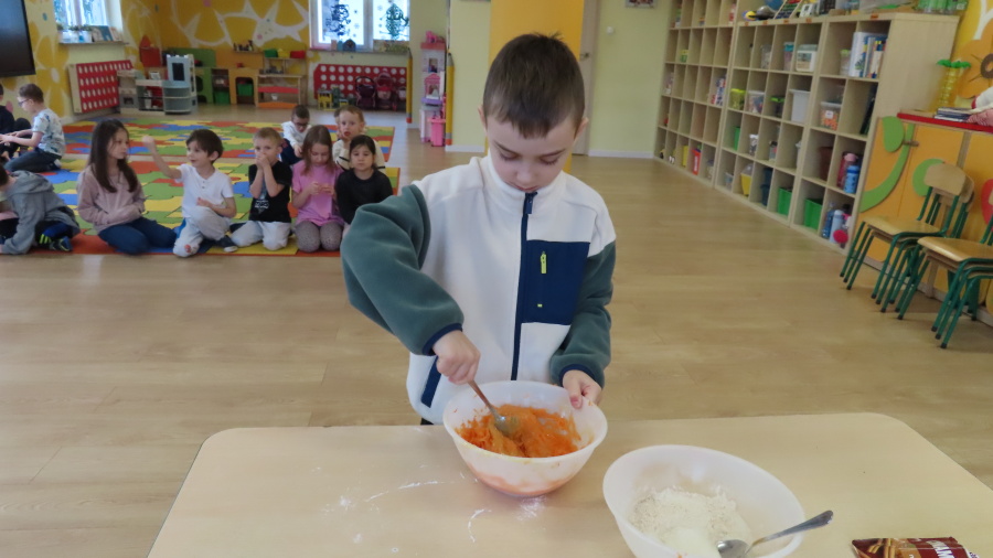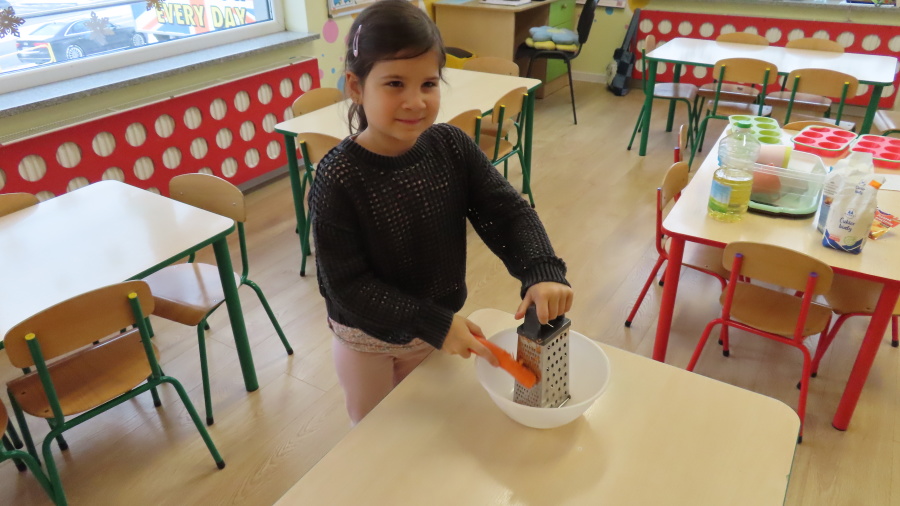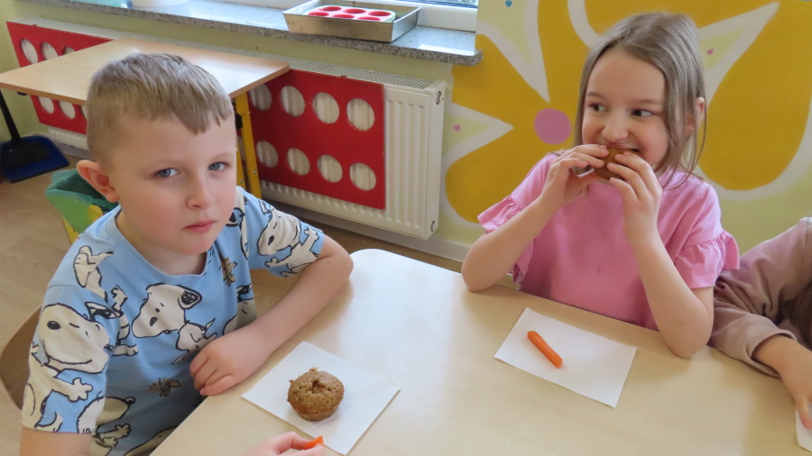 Marchewka była dziś główną postacią cyklicznych zajęć kulinarnych, które odbyły się dziś w gr. Kropeczek. Dzieci tarły marchewkę, odmierzały składniki, łączyły ze sobą produkty. Przygotowaną masę przelały do foremek. Tak przygotowanie ciasto trafiło do nagrzanego piekarnika. Cudowny zapach roznosił się po korytarzu. Po upieczeniu i ostudzeniu wszystkie muffinki szybko zniknęły z tacy.