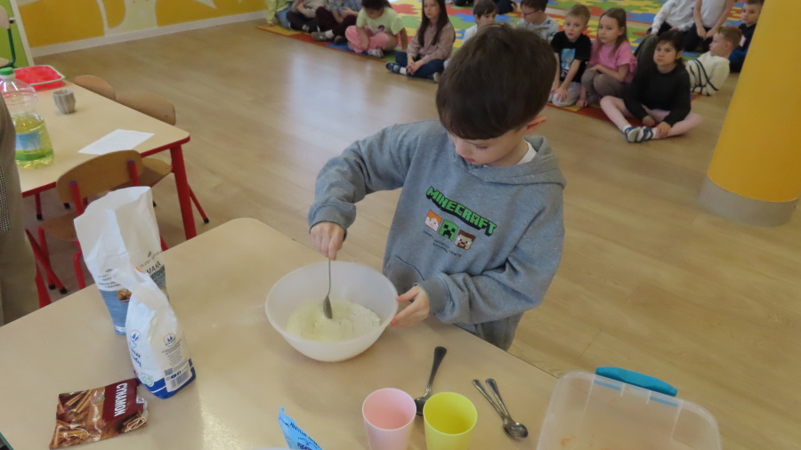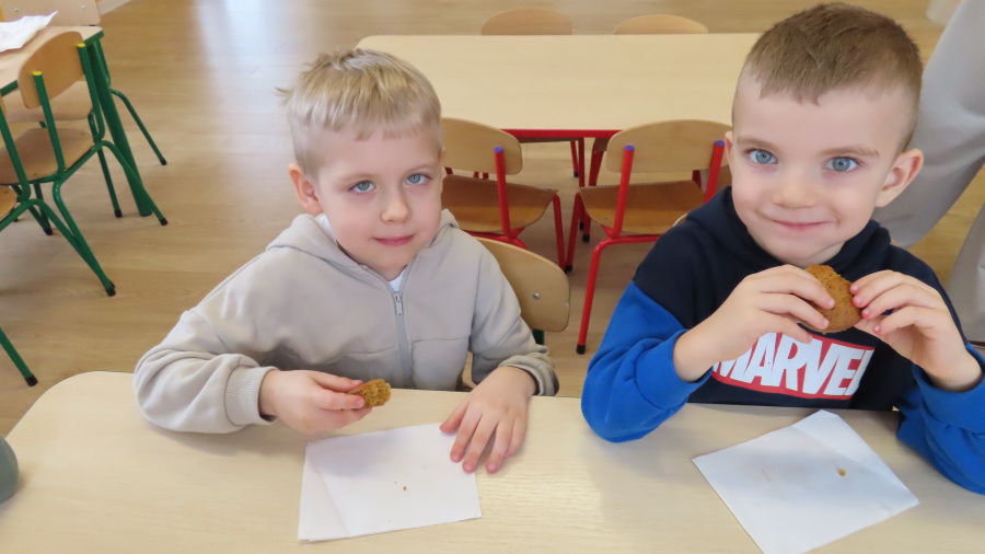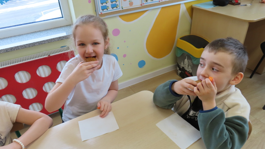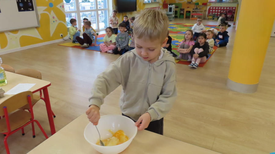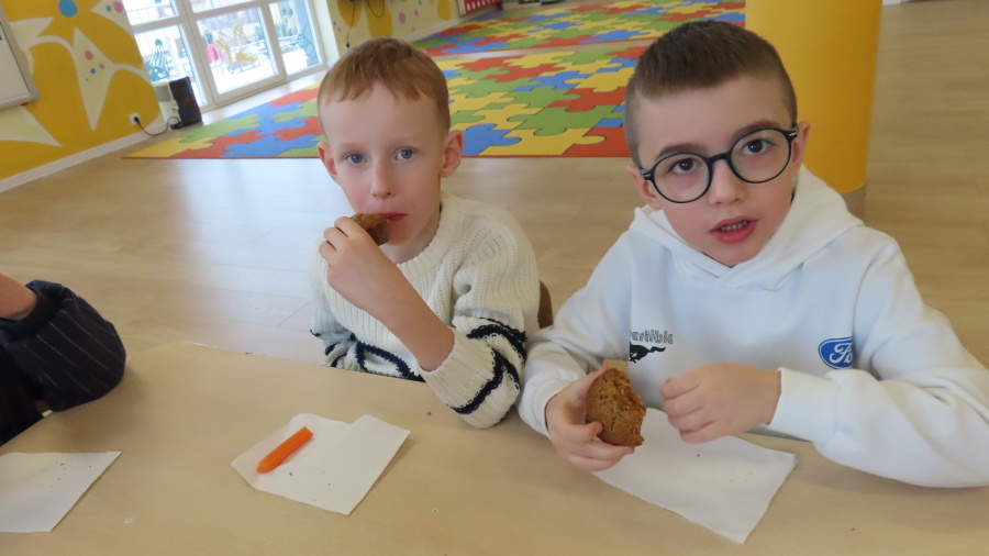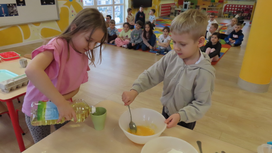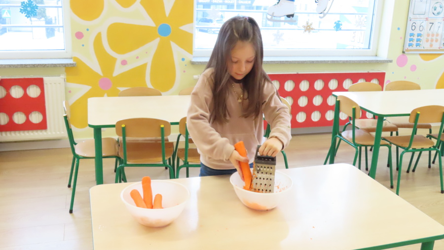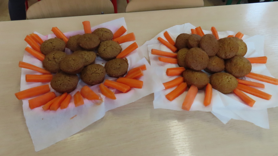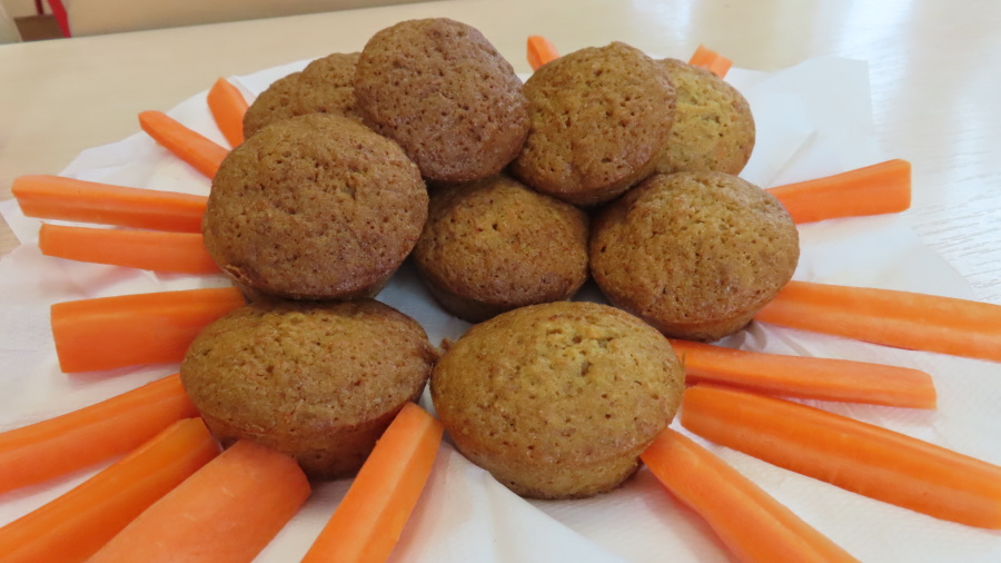 Marchewka była dziś główną postacią cyklicznych zajęć kulinarnych, które odbyły się dziś w gr. Kropeczek. Dzieci tarły marchewkę, odmierzały składniki, łączyły ze sobą produkty. Przygotowaną masę przelały do foremek. Tak przygotowanie ciasto trafiło do nagrzanego piekarnika. Cudowny zapach roznosił się po korytarzu. Po upieczeniu i ostudzeniu wszystkie muffinki szybko zniknęły z tacy.