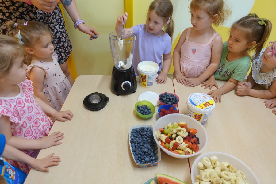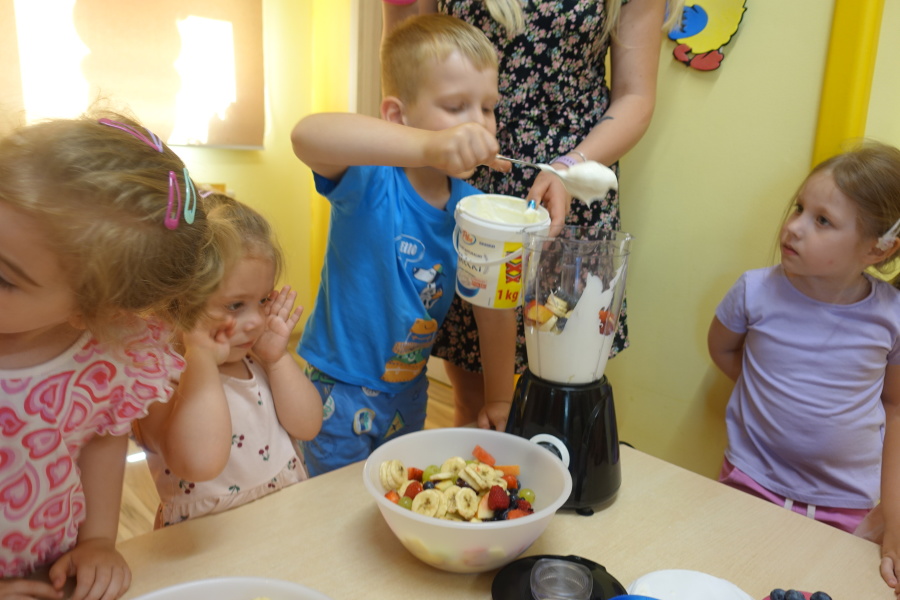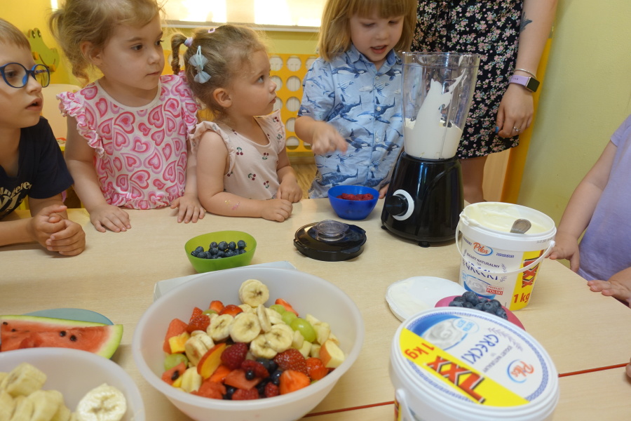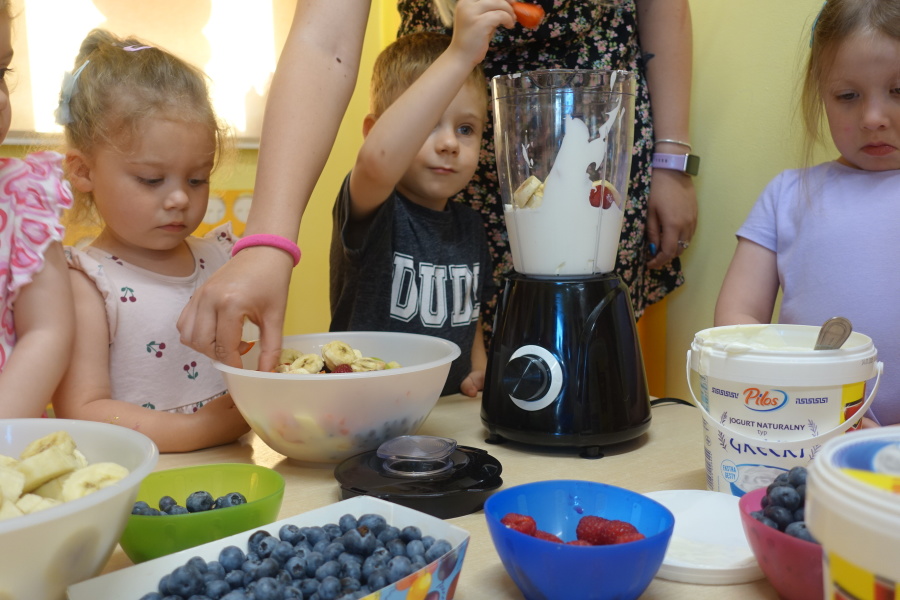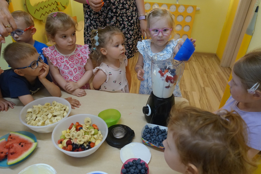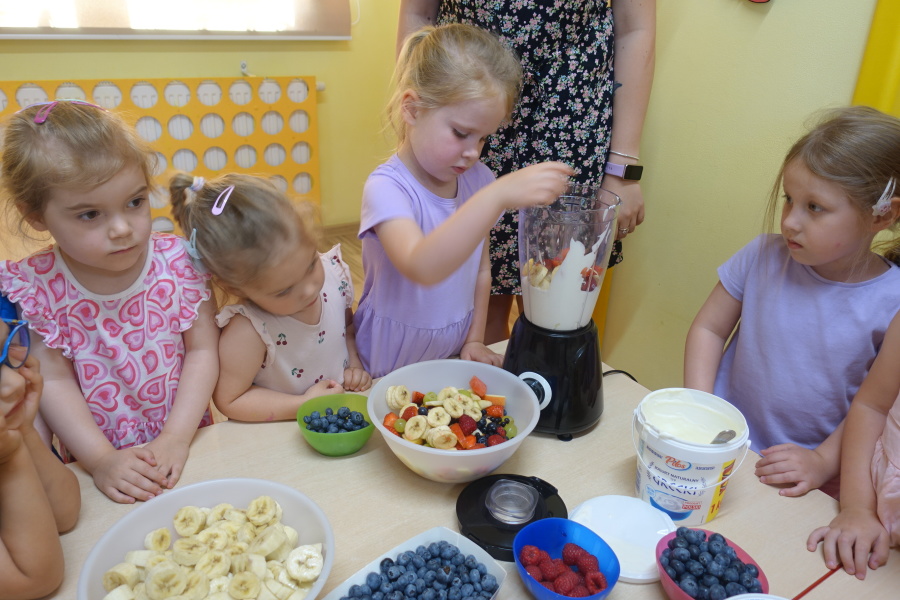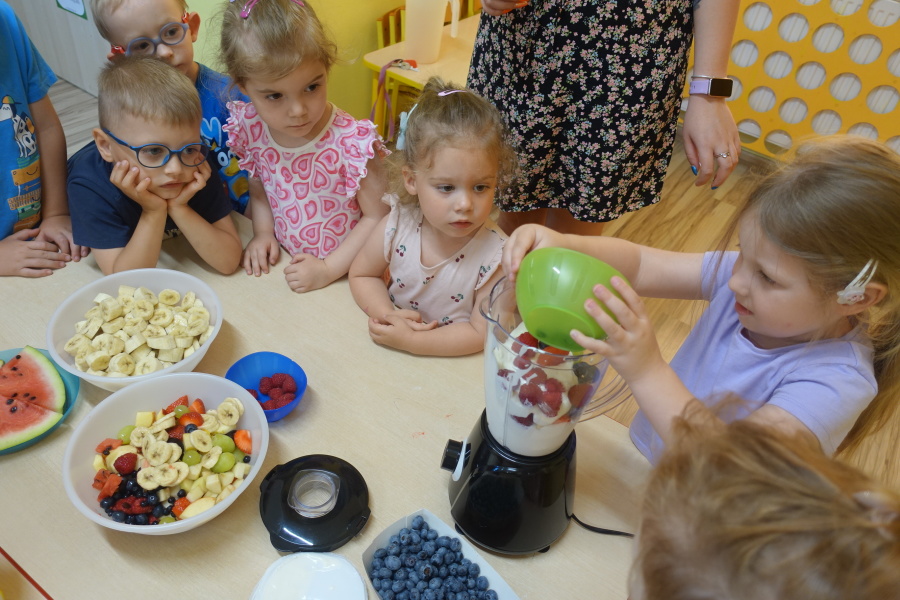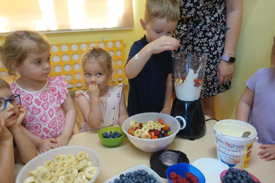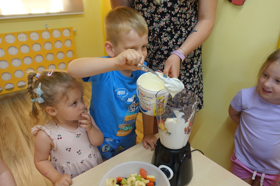 Dziś w naszej grupie Kwiatuszków odbyło się prawdziwe Owocowe Szaleństwo! Dzieci z wielkim entuzjazmem uczestniczyły w zajęciach kulinarnych, podczas których samodzielnie przygotowywały pyszny i zdrowy jogurt owocowy.