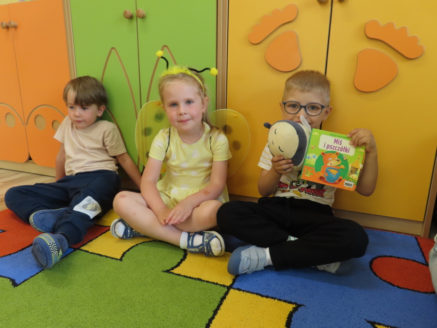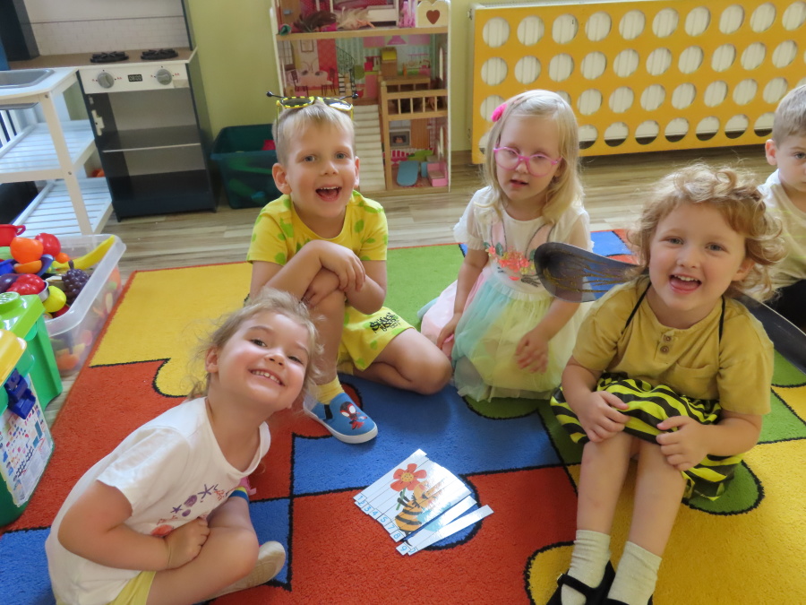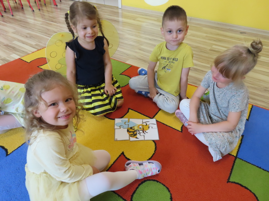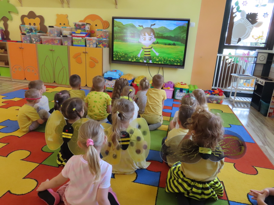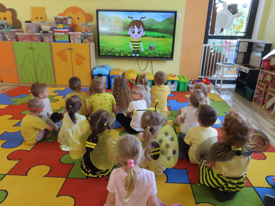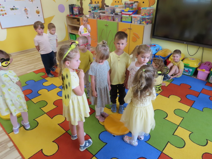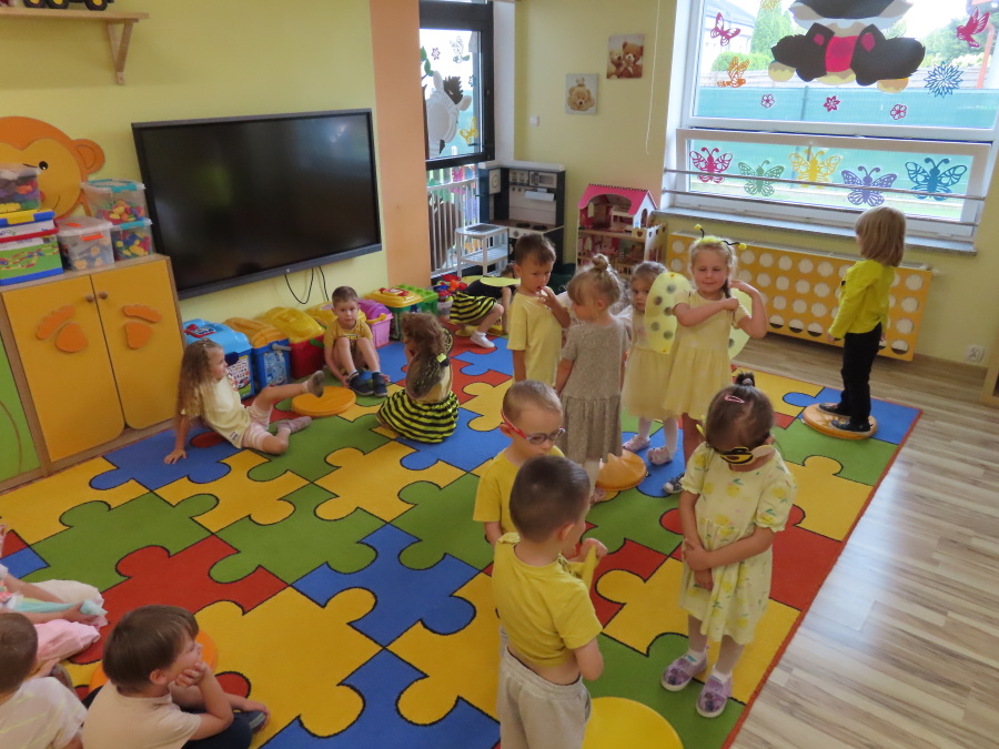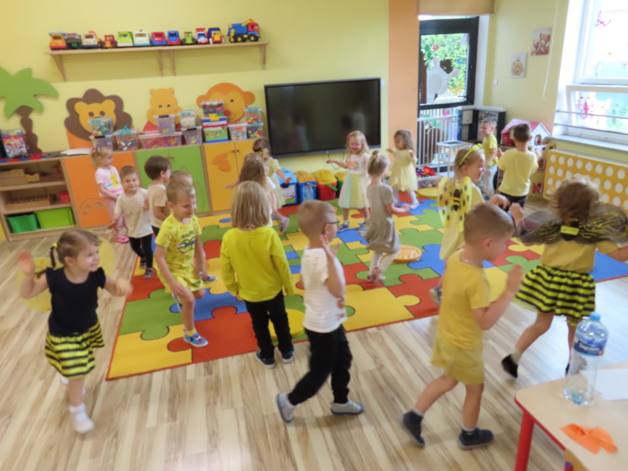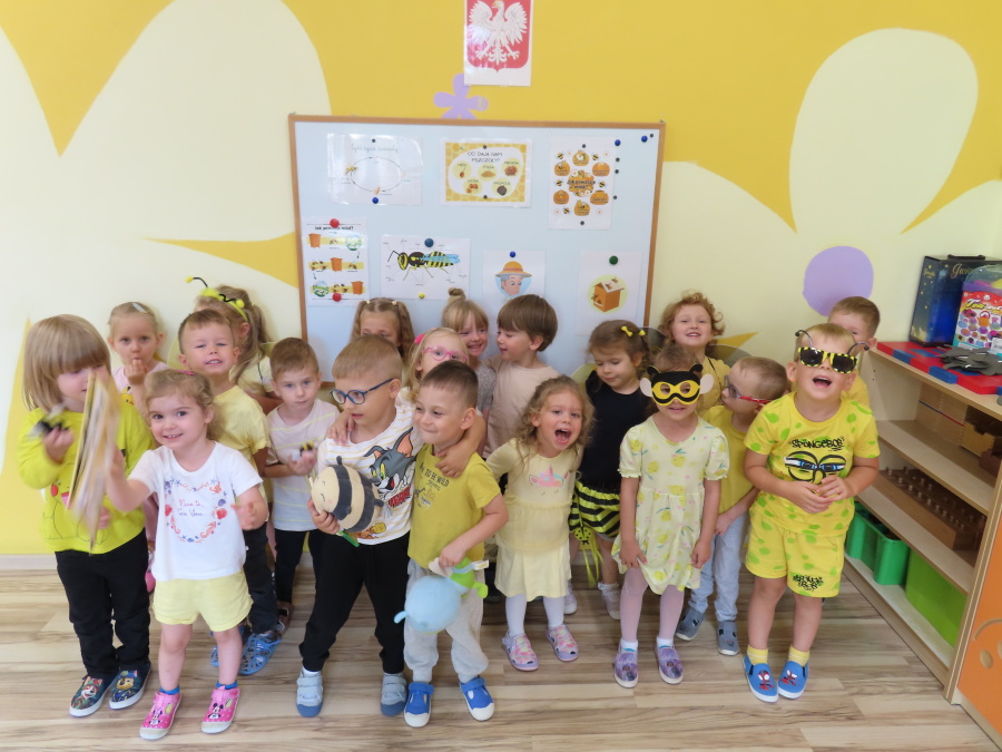 Dziś w naszej grupie świętowaliśmy Dzień Pszczoły. Z tej okazji odbyły się tematyczne zajęcia edukacyjne, podczas których dzieci miały okazję bliżej poznać życie pszczół i ich ogromne znaczenie dla przyrody. Na początku wspólnie rozmawialiśmy o pszczołach, następnie dzieci obejrzały film edukacyjny, który w ciekawy sposób przybliżył im temat życia w ulu. Nie zabrakło również zabaw ruchowych, dzieci wcieliły się w role pszczółek i na hasło \"Pszczółki do ula!\" z radością chowały się do wyznaczonego miejsca. Wspólnymi siłami zbudowaliśmy też plaster miodu, układaliśmy tematyczne puzzle, a dzieci z dumą prezentowały swoje książki i zabawki o pszczołach, które przyniosły z domu.