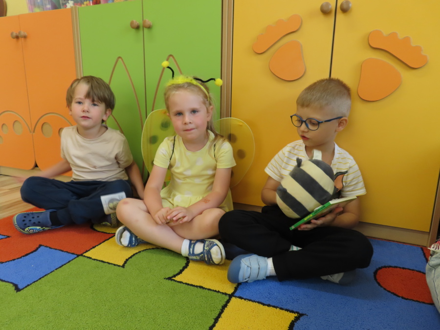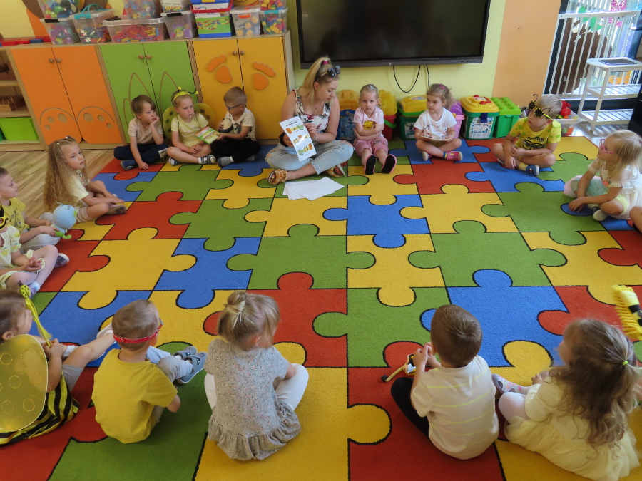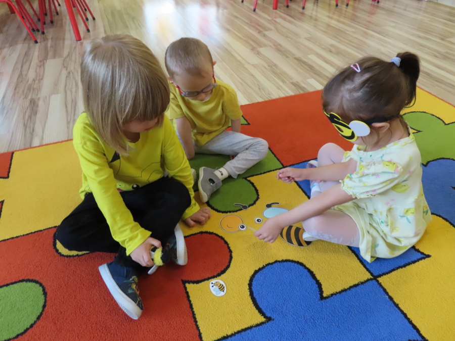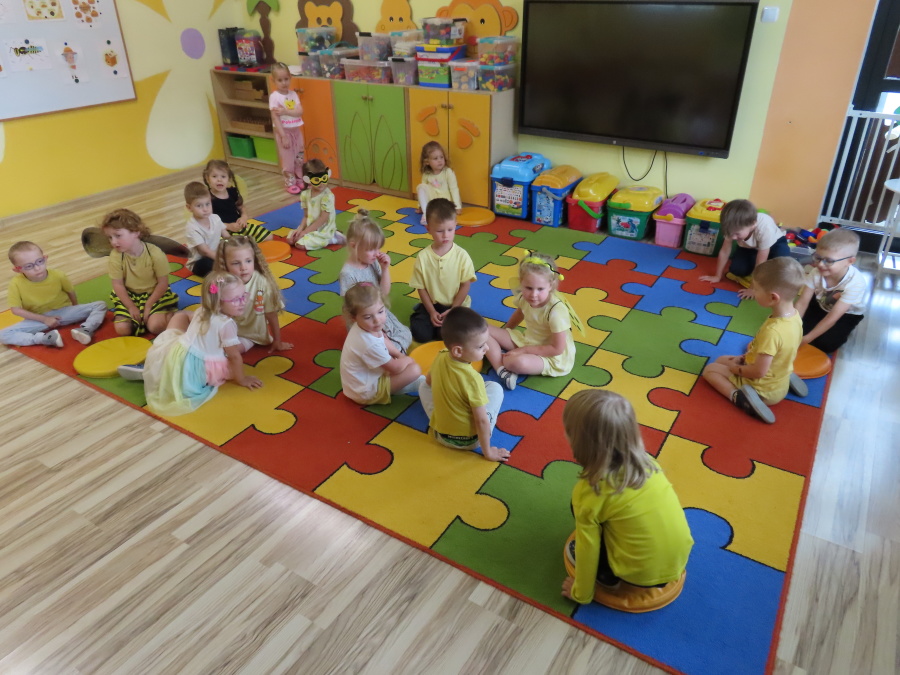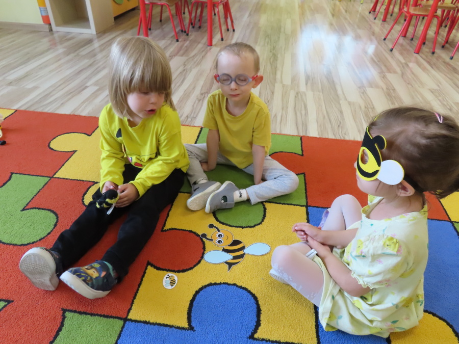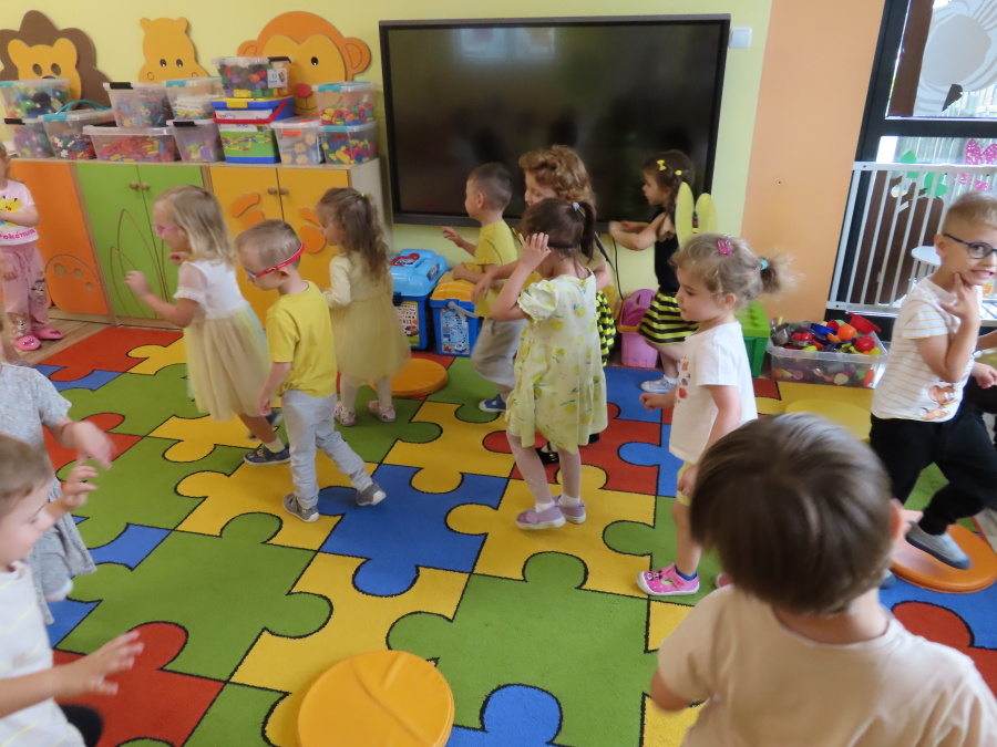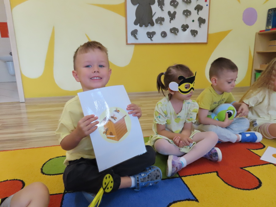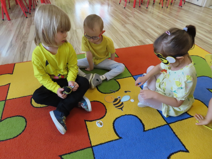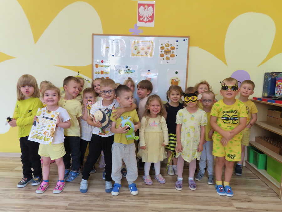 Dziś w naszej grupie świętowaliśmy Dzień Pszczoły. Z tej okazji odbyły się tematyczne zajęcia edukacyjne, podczas których dzieci miały okazję bliżej poznać życie pszczół i ich ogromne znaczenie dla przyrody. Na początku wspólnie rozmawialiśmy o pszczołach, następnie dzieci obejrzały film edukacyjny, który w ciekawy sposób przybliżył im temat życia w ulu. Nie zabrakło również zabaw ruchowych, dzieci wcieliły się w role pszczółek i na hasło \"Pszczółki do ula!\" z radością chowały się do wyznaczonego miejsca. Wspólnymi siłami zbudowaliśmy też plaster miodu, układaliśmy tematyczne puzzle, a dzieci z dumą prezentowały swoje książki i zabawki o pszczołach, które przyniosły z domu.