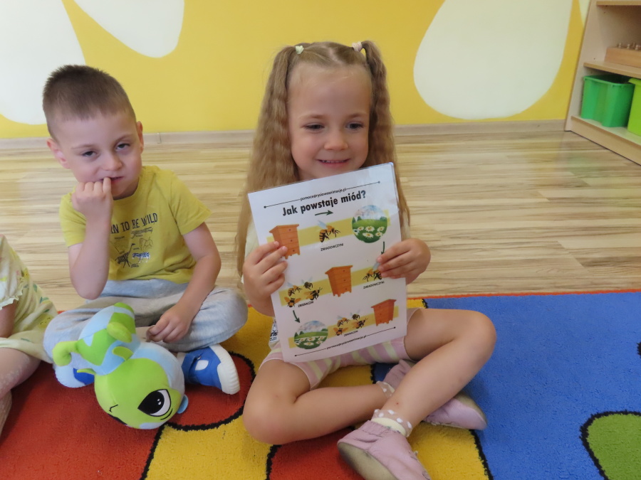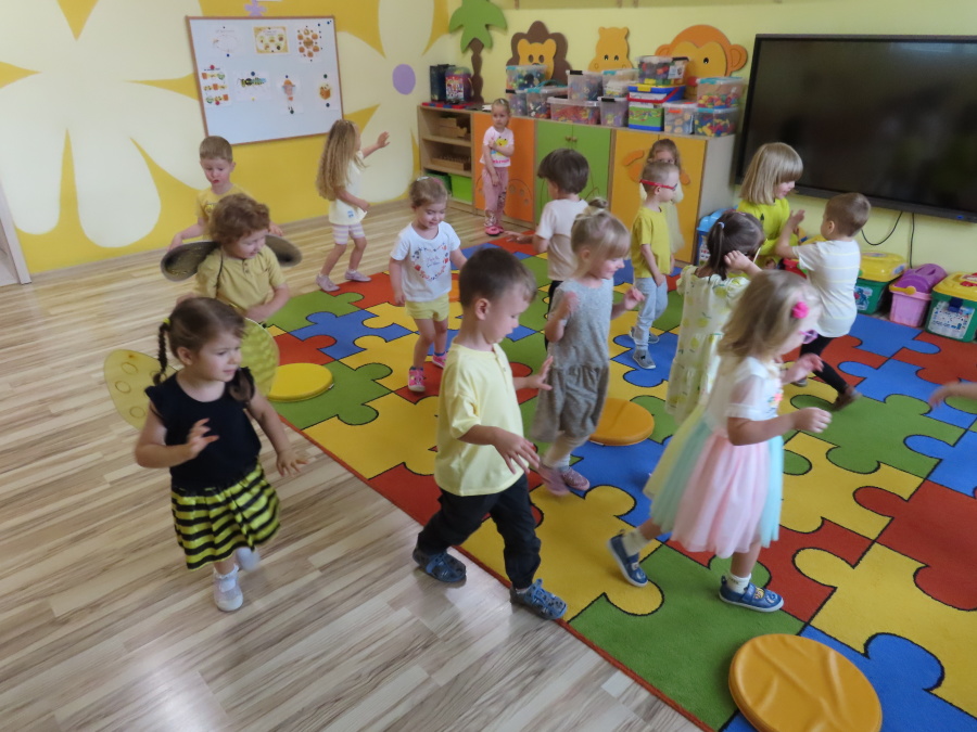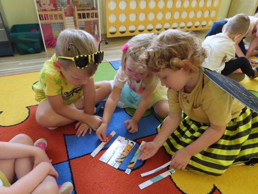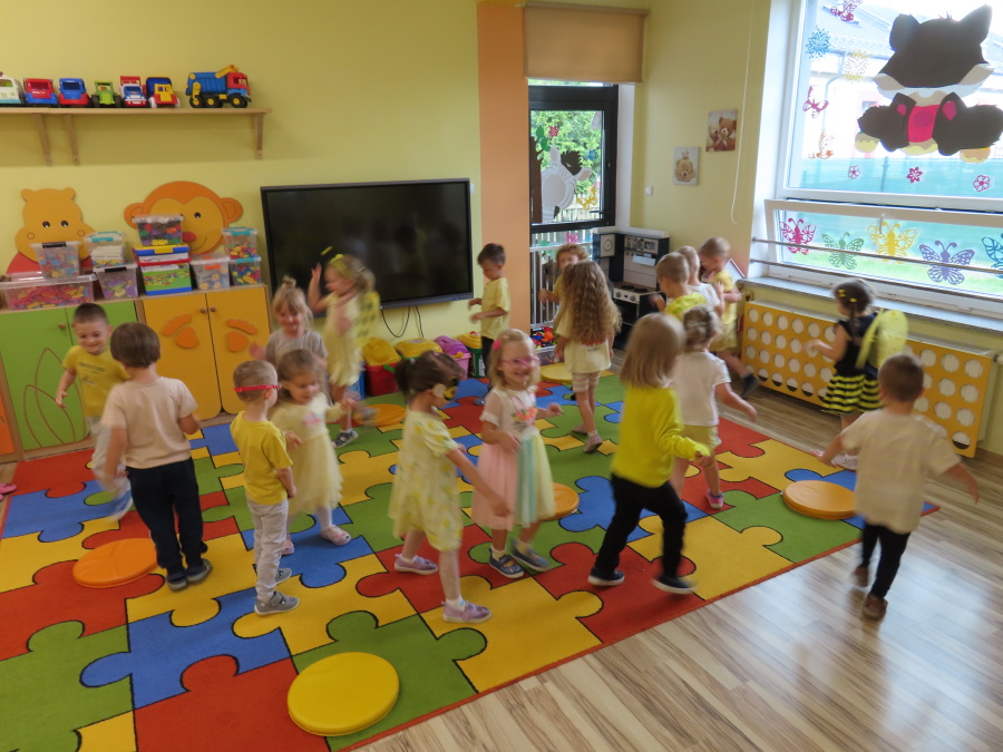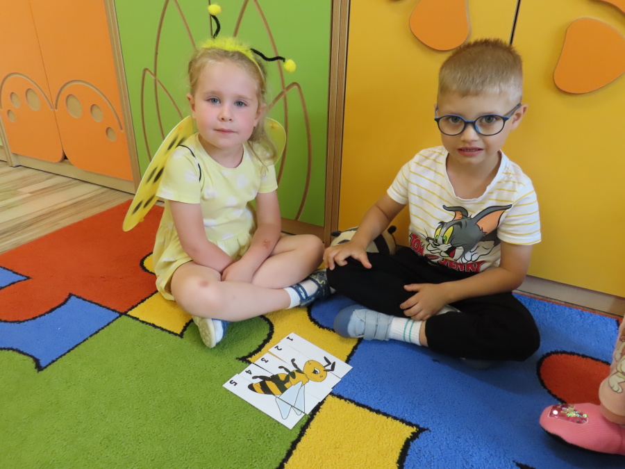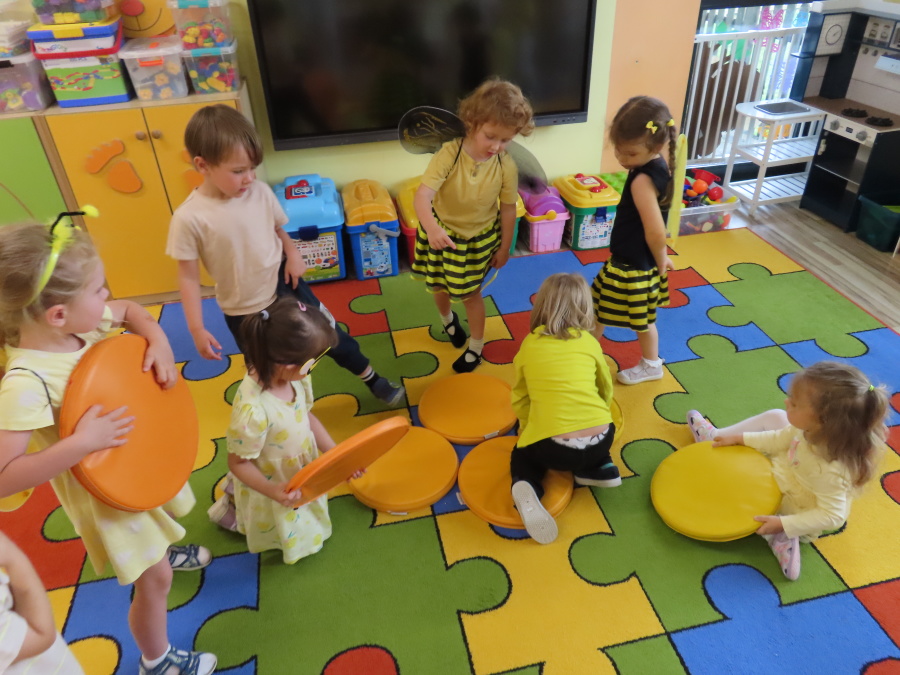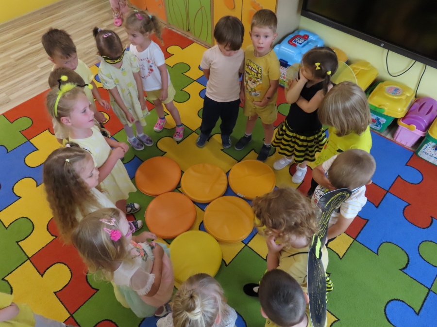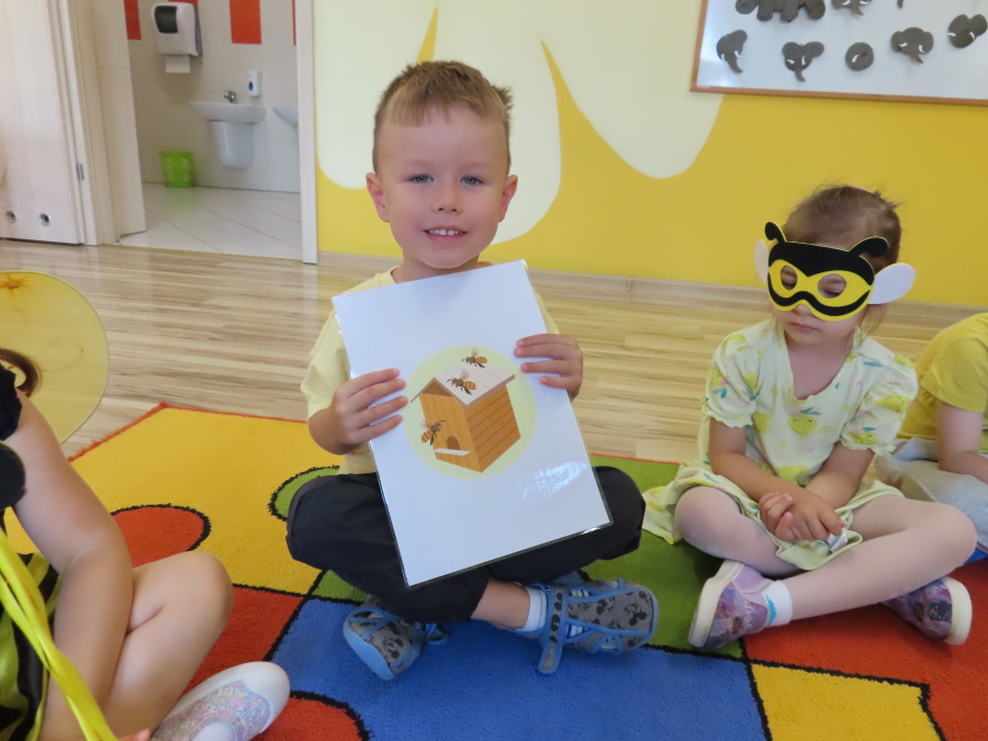 Dziś w naszej grupie świętowaliśmy Dzień Pszczoły. Z tej okazji odbyły się tematyczne zajęcia edukacyjne, podczas których dzieci miały okazję bliżej poznać życie pszczół i ich ogromne znaczenie dla przyrody. Na początku wspólnie rozmawialiśmy o pszczołach, następnie dzieci obejrzały film edukacyjny, który w ciekawy sposób przybliżył im temat życia w ulu. Nie zabrakło również zabaw ruchowych, dzieci wcieliły się w role pszczółek i na hasło \"Pszczółki do ula!\" z radością chowały się do wyznaczonego miejsca. Wspólnymi siłami zbudowaliśmy też plaster miodu, układaliśmy tematyczne puzzle, a dzieci z dumą prezentowały swoje książki i zabawki o pszczołach, które przyniosły z domu.