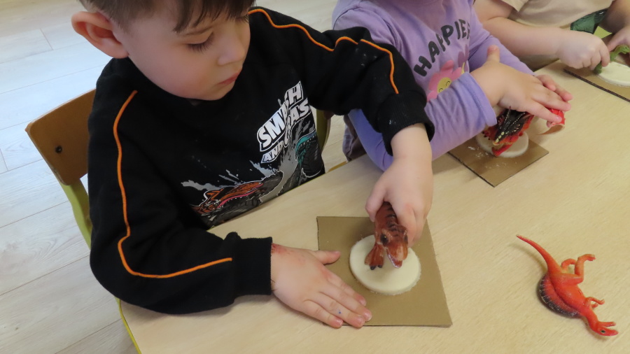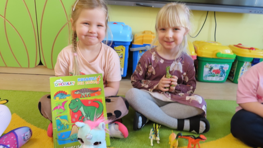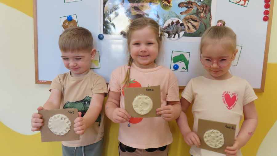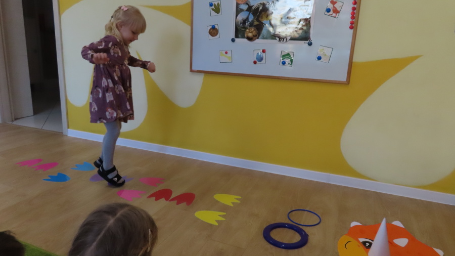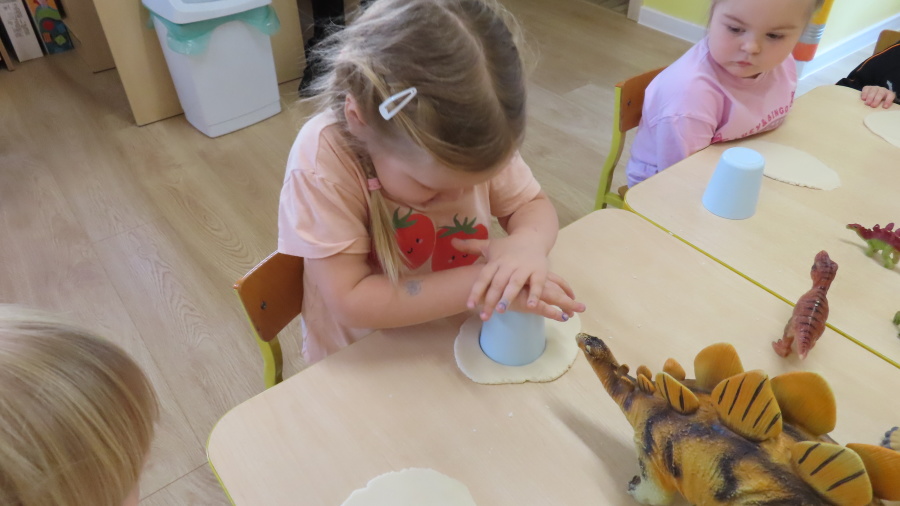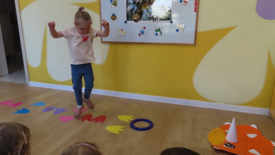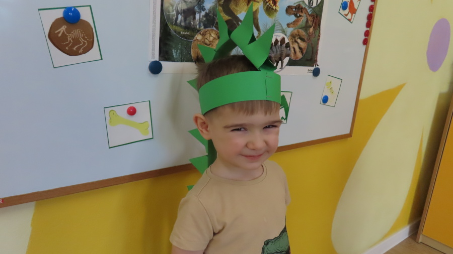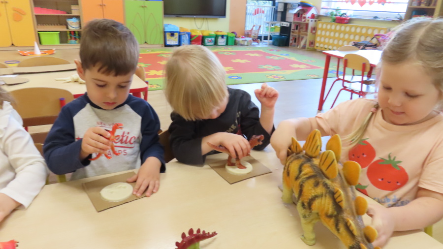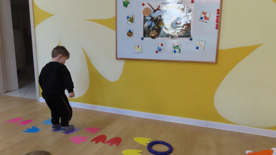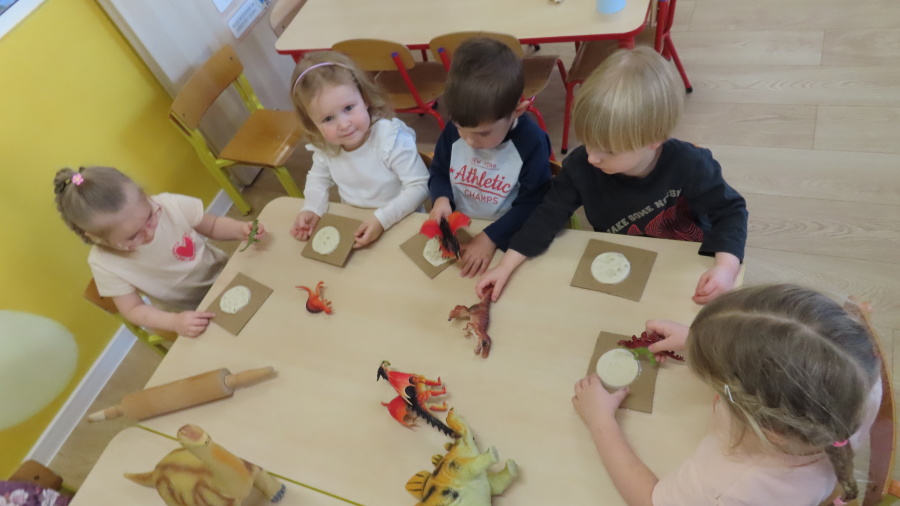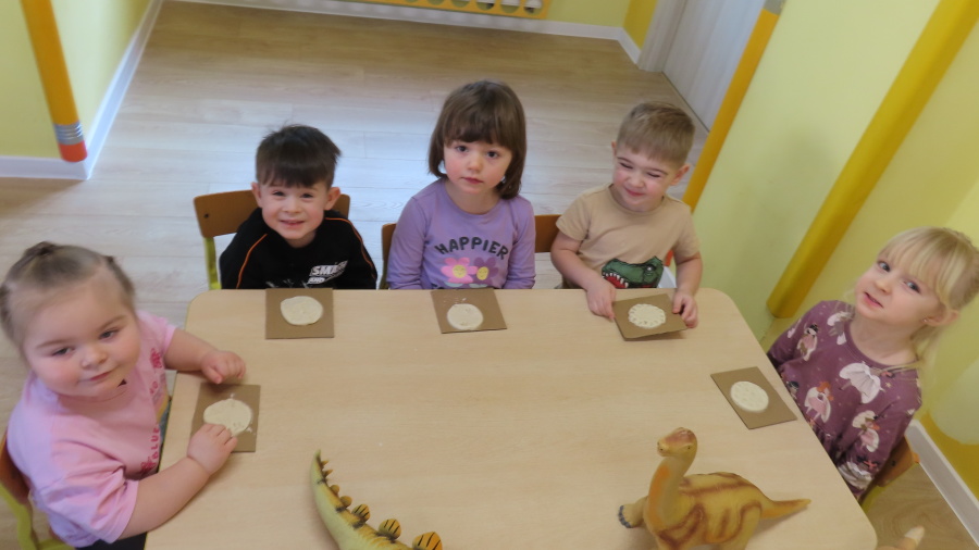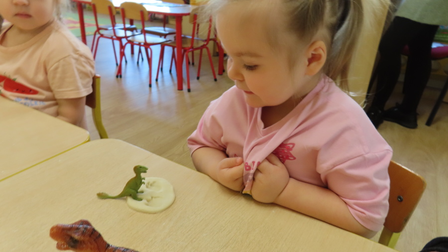 ???? Dzień Dinozaura w naszej grupie ???? Dziś w naszej grupie świętowaliśmy Dzień Dinozaura. Najpierw obejrzeliśmy film edukacyjny, a następnie dzieci skakały po śladach dinozaurów i rzucały obręcz na róg dinozaura. Później paluszkami odszukiwaliśmy ukryte dinozaury oraz z masy solnej wykonywaliśmy ich ślady. Na zakończenie dzieci zaprezentowały przedmioty związane z dinozaurami, które przyniosły z domu. To był bardzo radosny i ciekawy dzień! ????????