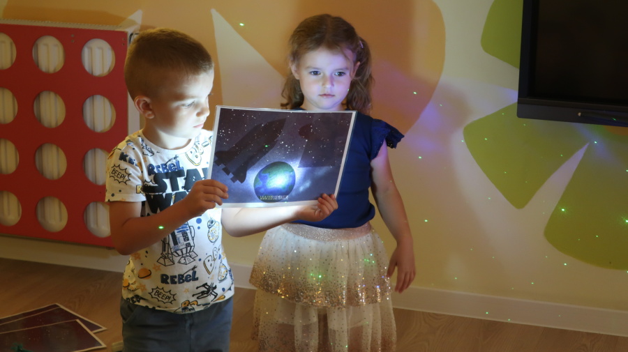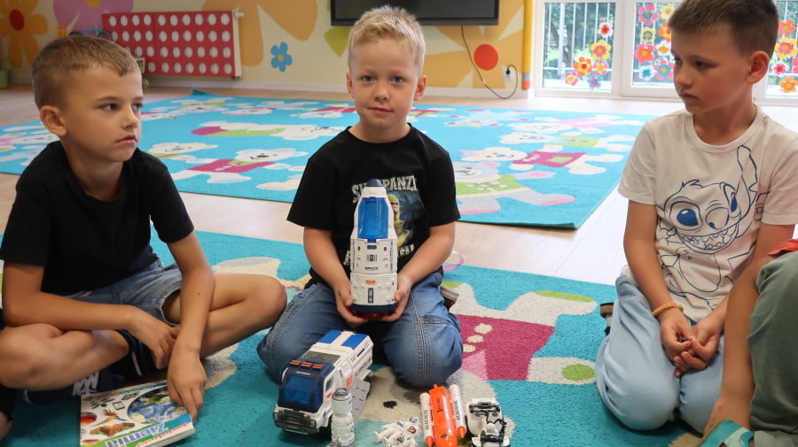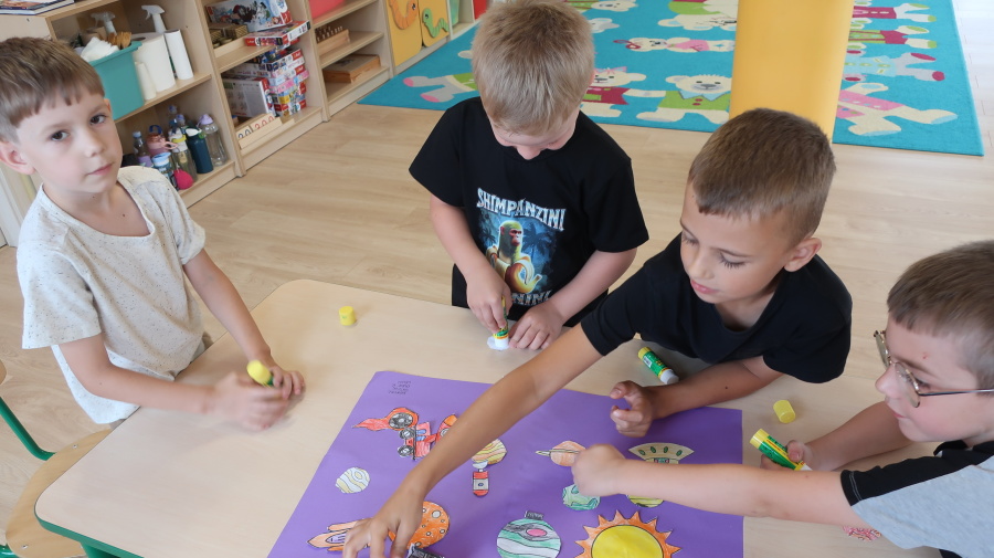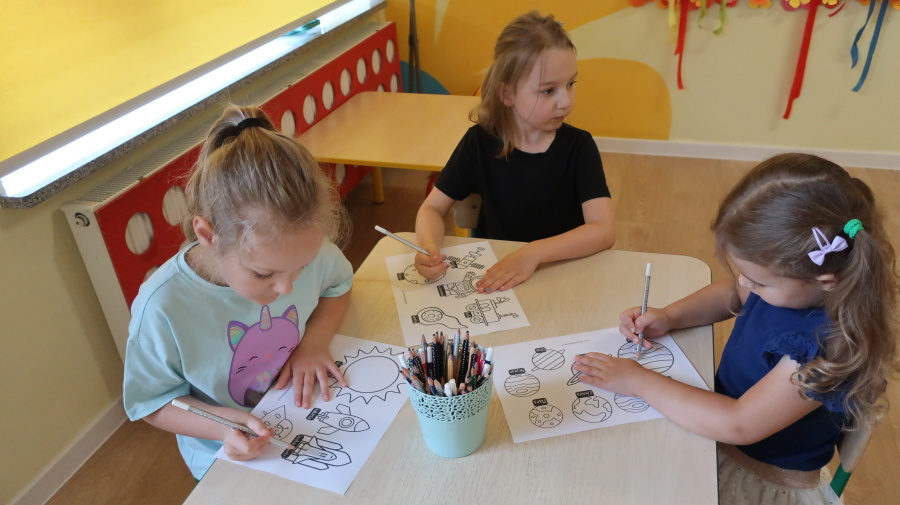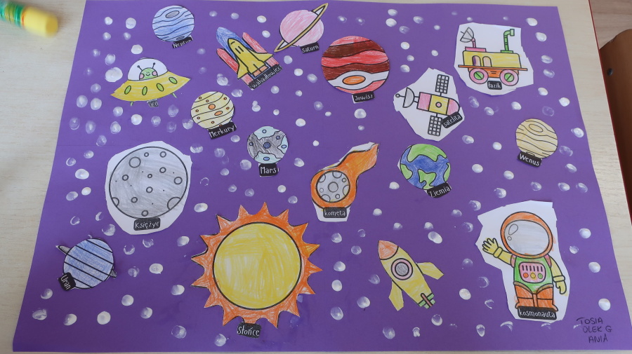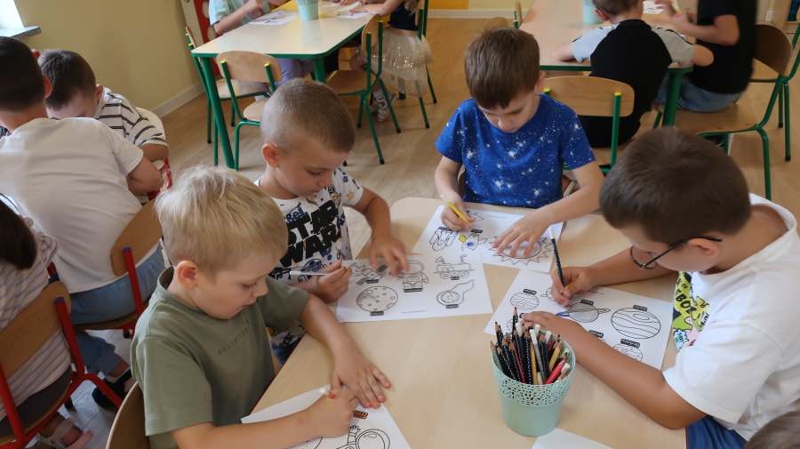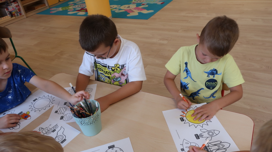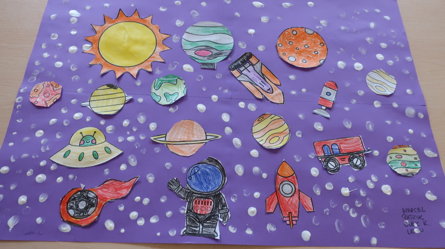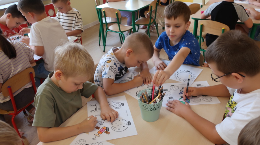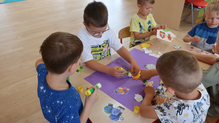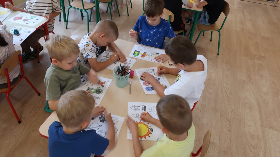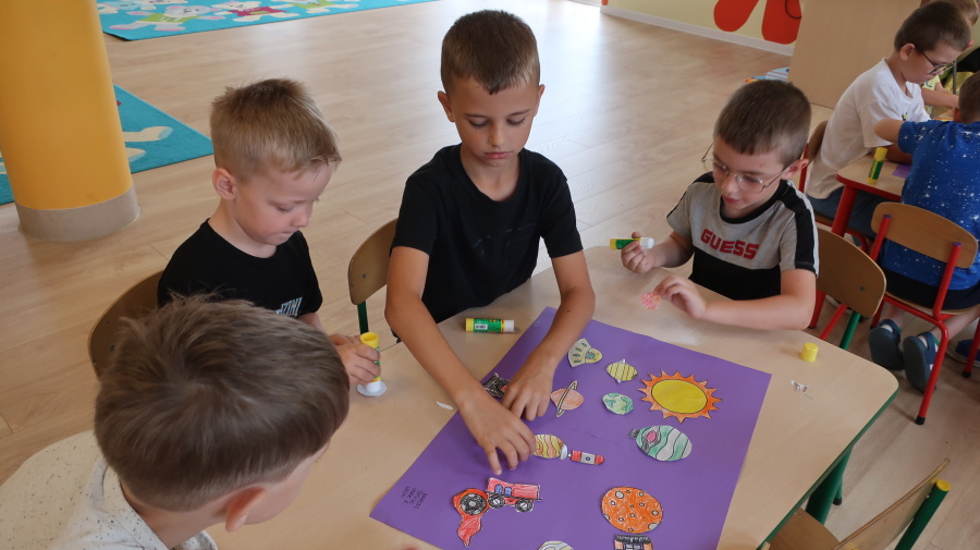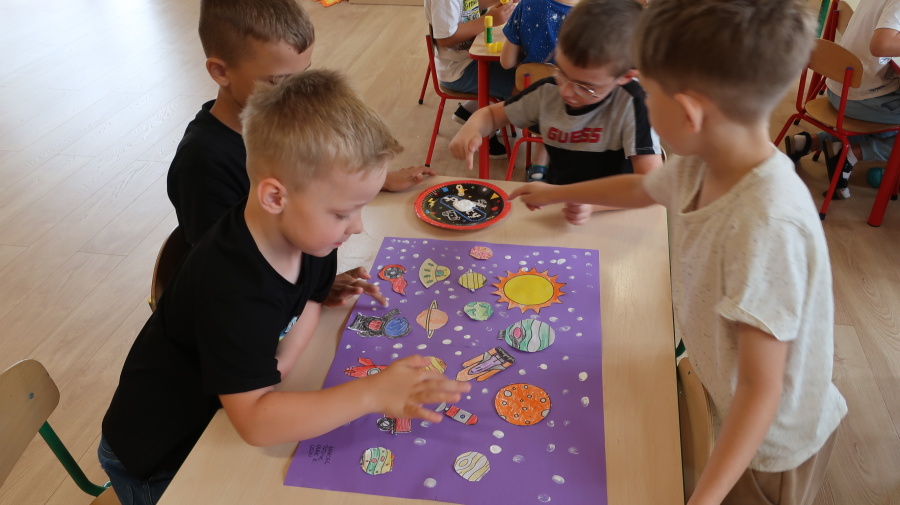 Podczas dzisiejszych zajęć wakacyjnych Misie tajemnice i cuda kosmosu - gwiazdy, planety, rakiety i obiekty kosmiczne.????????????????????????????????????⭐️???? Dzieci układały puzzle związane z kosmosem oraz uczestniczyły w zabawach ruchowych. Wielką radość sprawiło im odszukiwanie obiektów kosmicznych przy użyciu latarki.???? Przedszkolaki podzielone na 3 osobowe grupy wykonywały pracę plastyczną przedstawiającą kosmos oraz obiekty z nimi związane.???? Wszystkie prace można podziwiać w szatni.