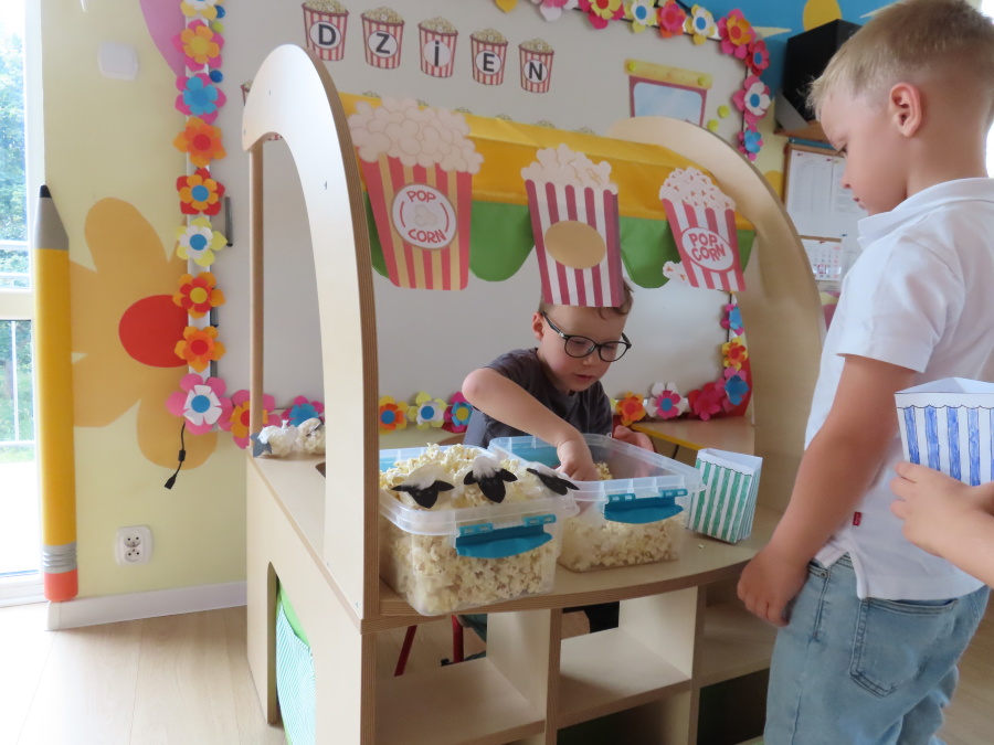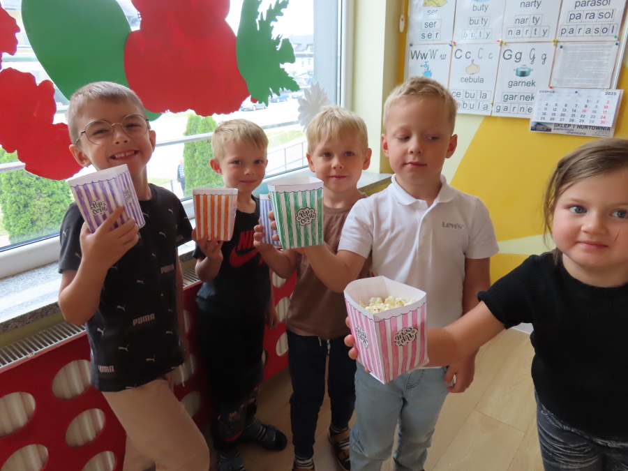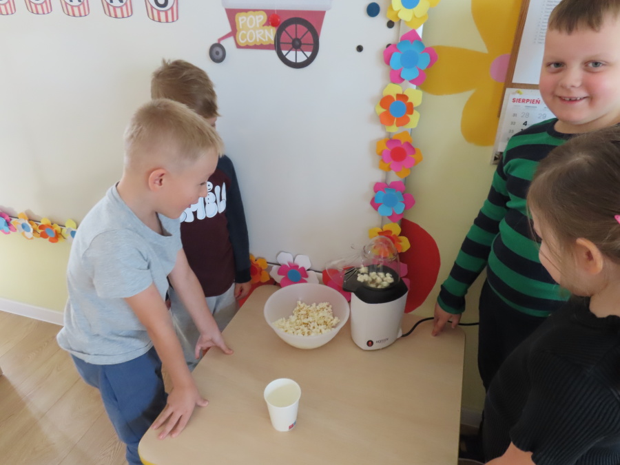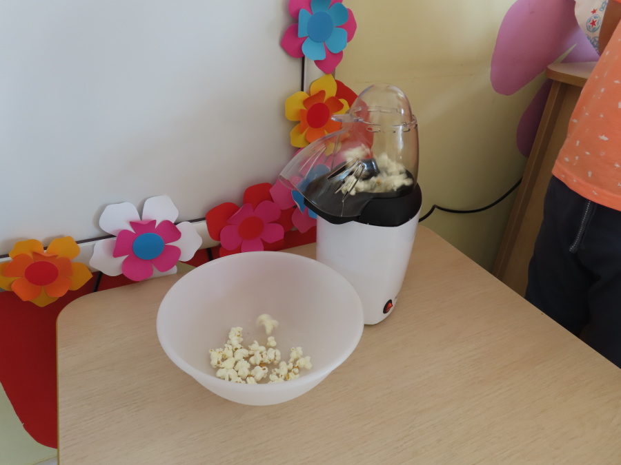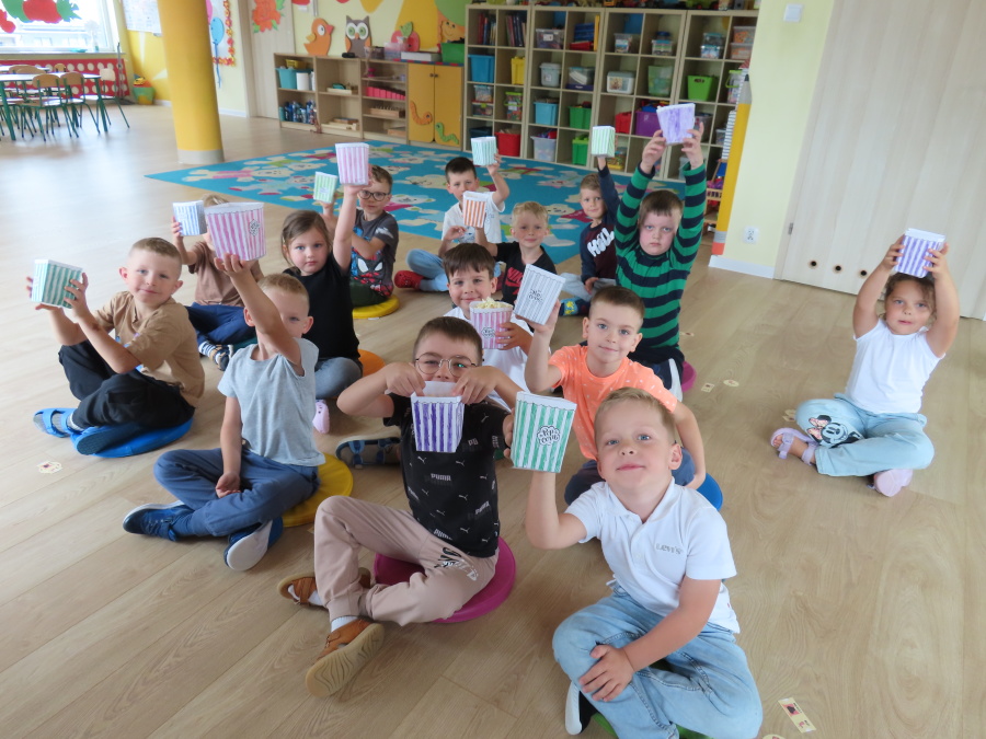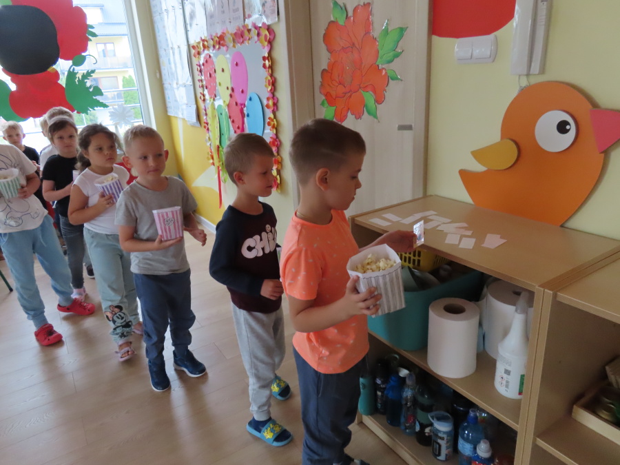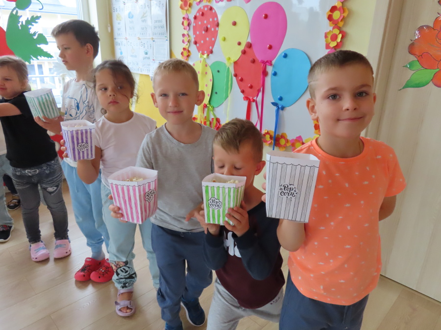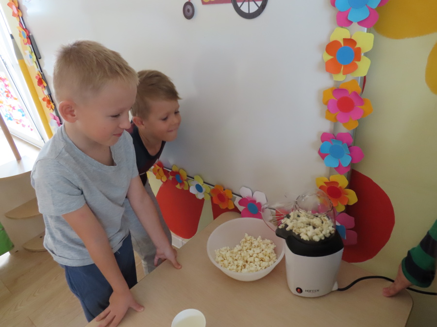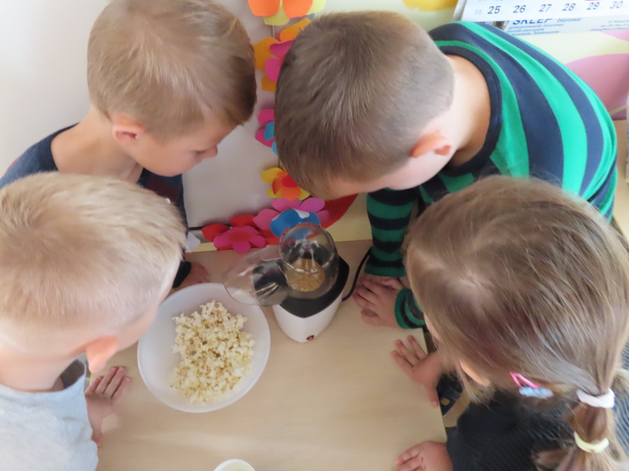 We wtorek obchodziliśmy w przedszkolu nietypowe święto - Dzień popcornu. Dzieci dowiedziały się z czego powstaje popcornu i jak go przygotować. Misie oglądały ziarna popcornu oraz obserwowały proces jego powstawania. Przedszkolaki wykonały także pojemniki do popcornu oraz miały możliwość wcielenia się w osobę sprzedającą. Na zakończenie oczywiście nie mogło zabraknąć seansu kinowego z tą pyszna przekąską.