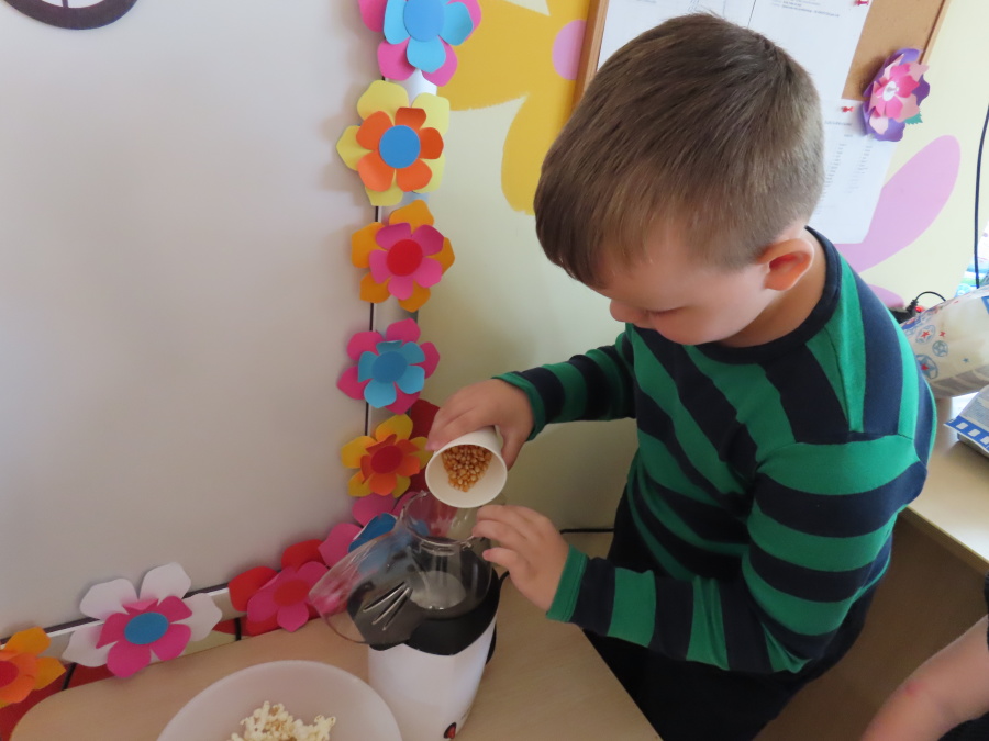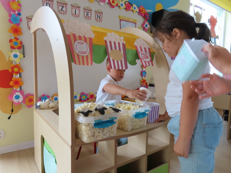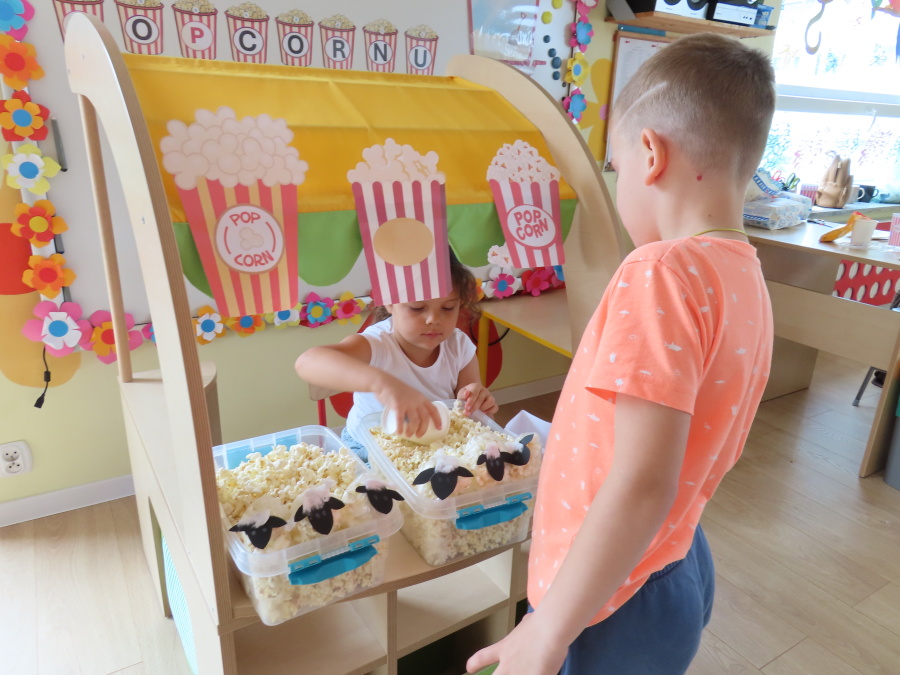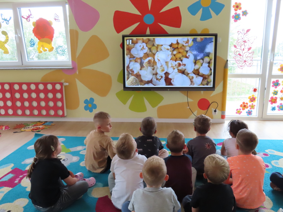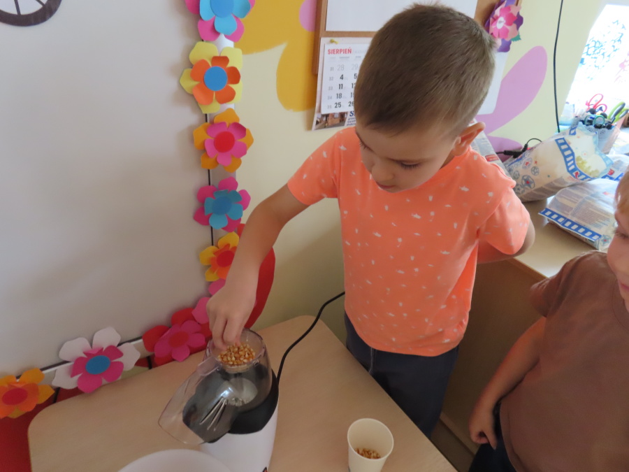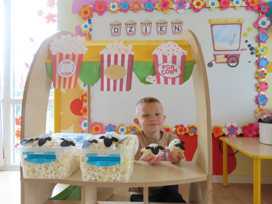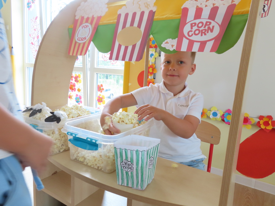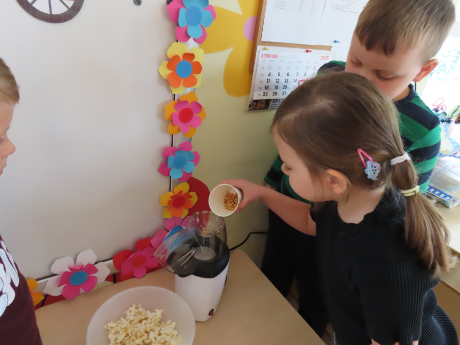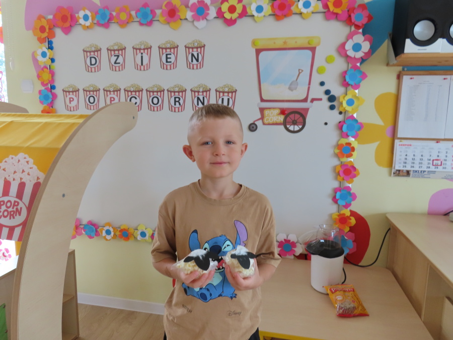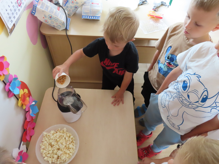 We wtorek obchodziliśmy w przedszkolu nietypowe święto - Dzień popcornu. Dzieci dowiedziały się z czego powstaje popcornu i jak go przygotować. Misie oglądały ziarna popcornu oraz obserwowały proces jego powstawania. Przedszkolaki wykonały także pojemniki do popcornu oraz miały możliwość wcielenia się w osobę sprzedającą. Na zakończenie oczywiście nie mogło zabraknąć seansu kinowego z tą pyszna przekąską.
