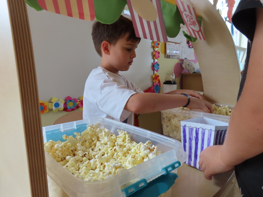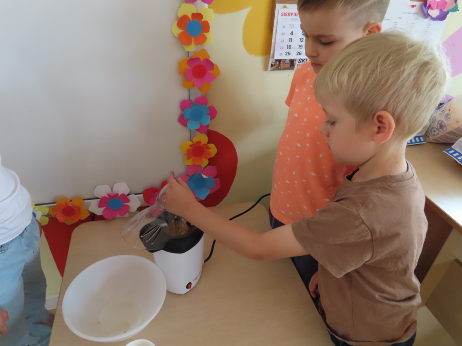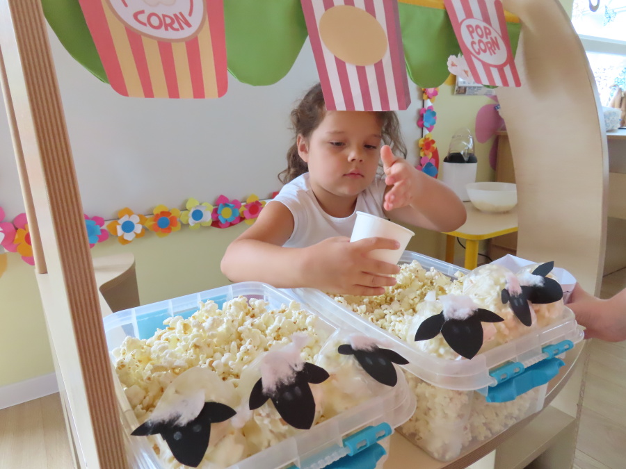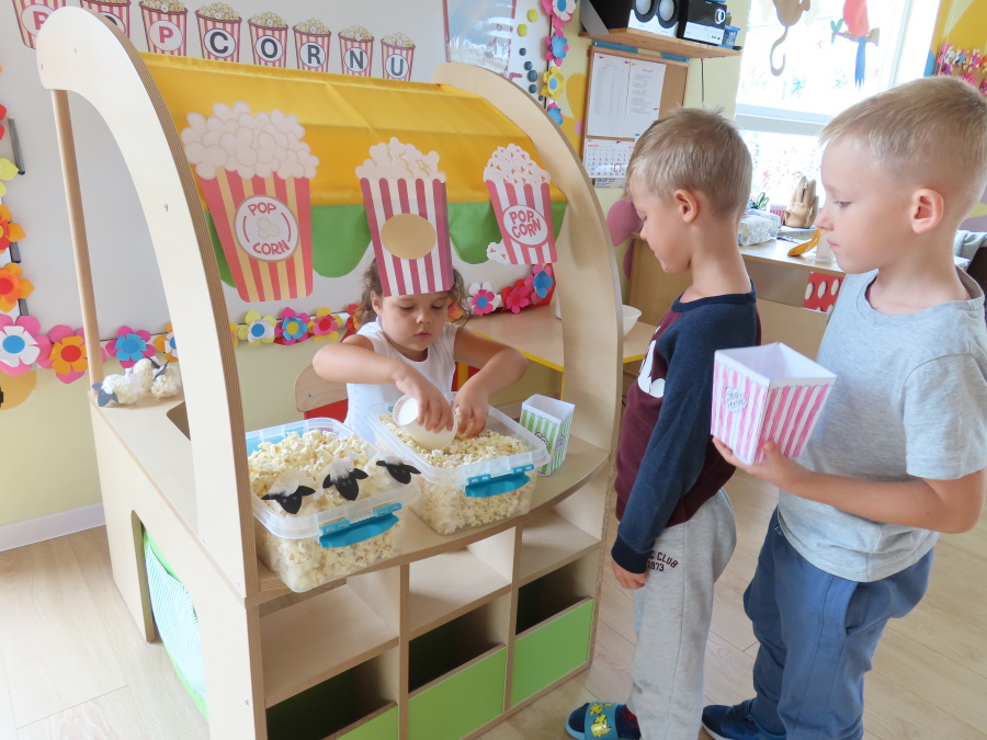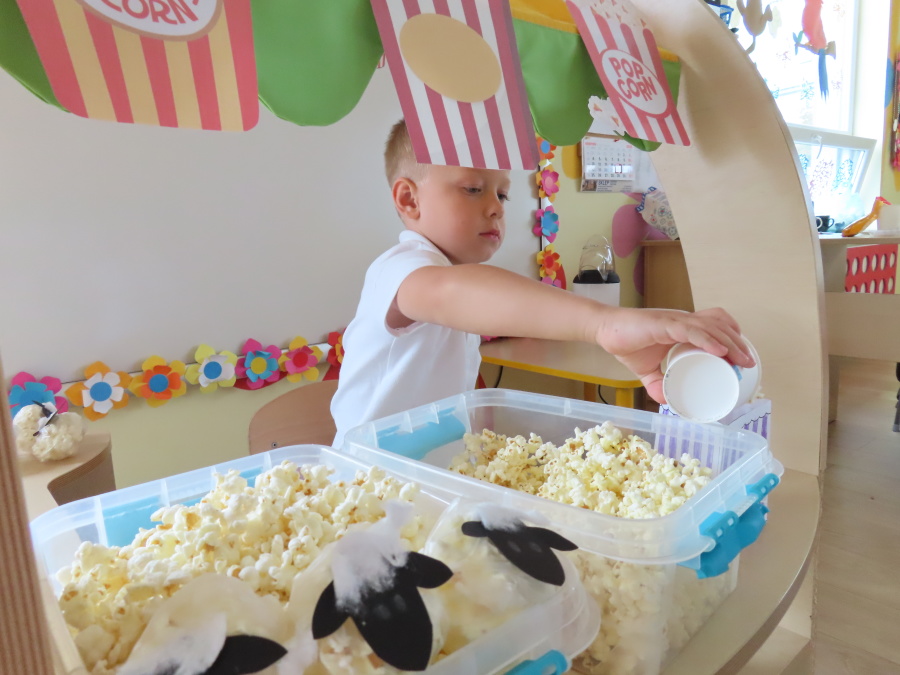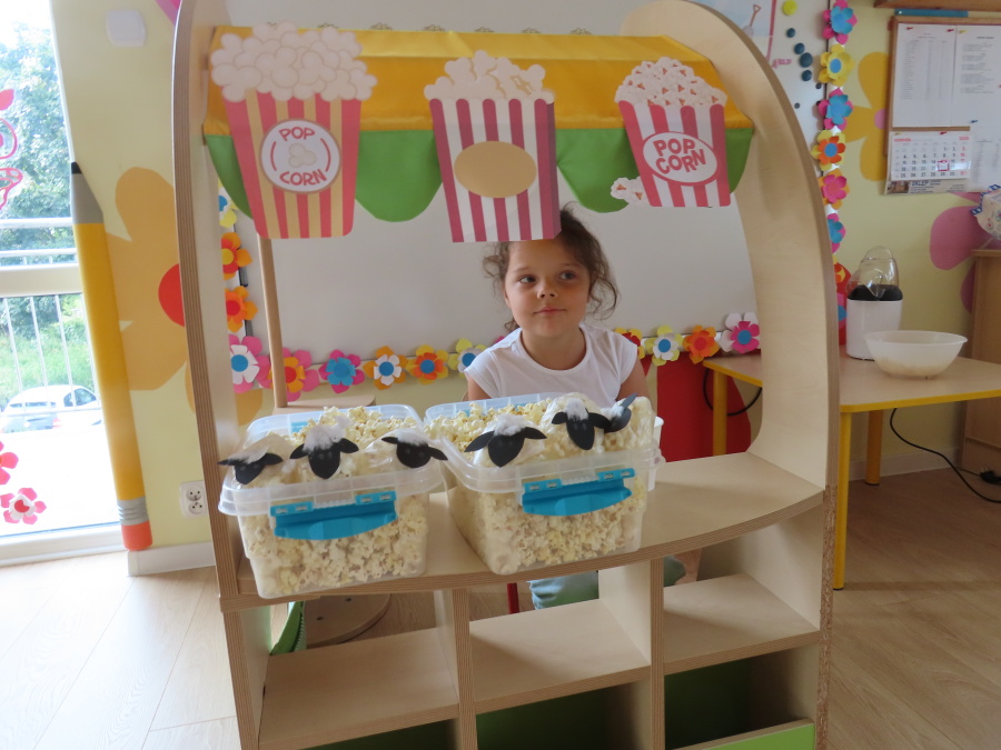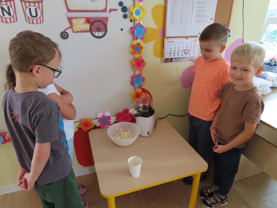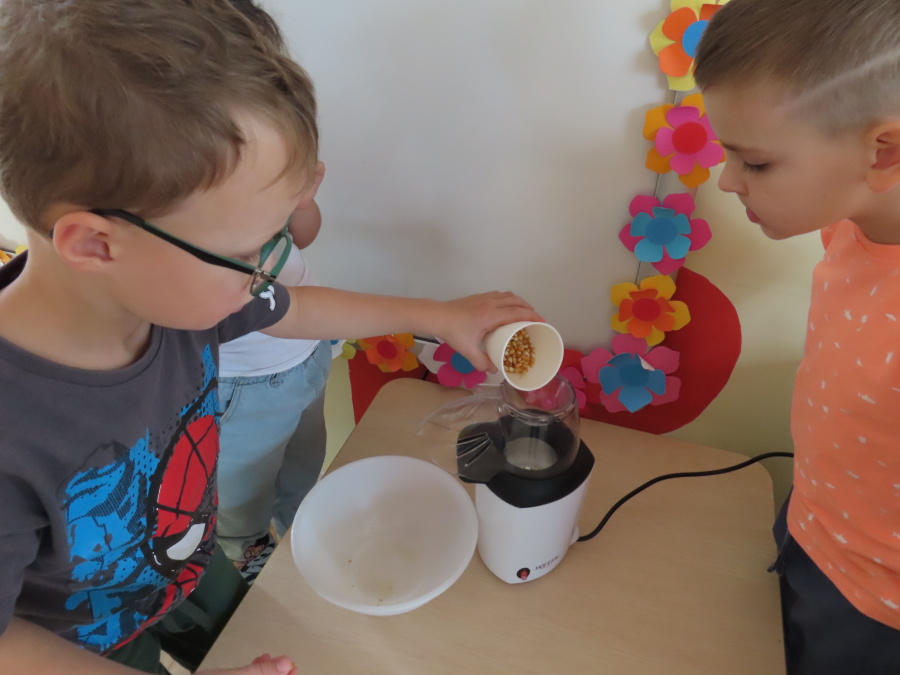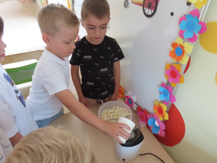 We wtorek obchodziliśmy w przedszkolu nietypowe święto - Dzień popcornu. Dzieci dowiedziały się z czego powstaje popcornu i jak go przygotować. Misie oglądały ziarna popcornu oraz obserwowały proces jego powstawania. Przedszkolaki wykonały także pojemniki do popcornu oraz miały możliwość wcielenia się w osobę sprzedającą. Na zakończenie oczywiście nie mogło zabraknąć seansu kinowego z tą pyszna przekąską.