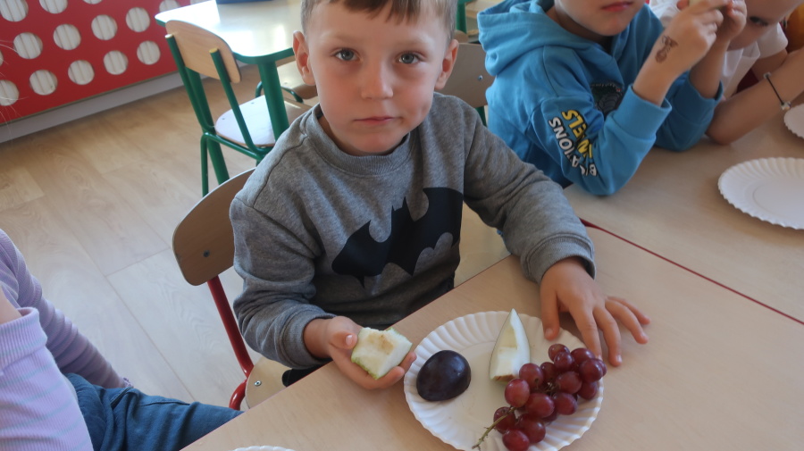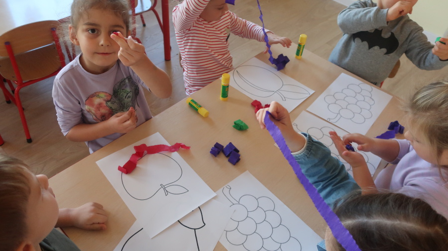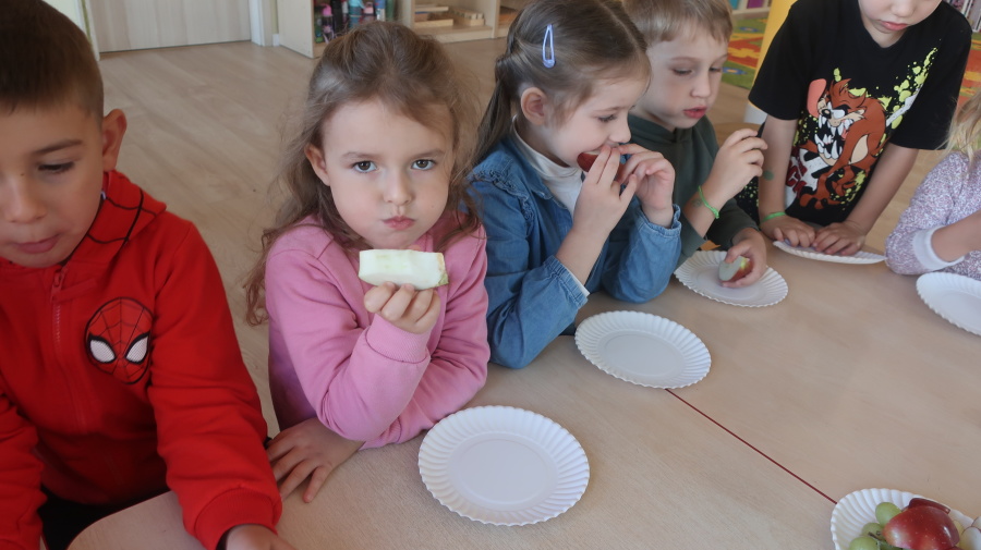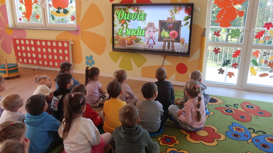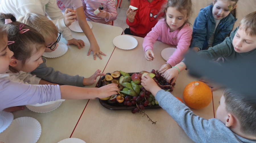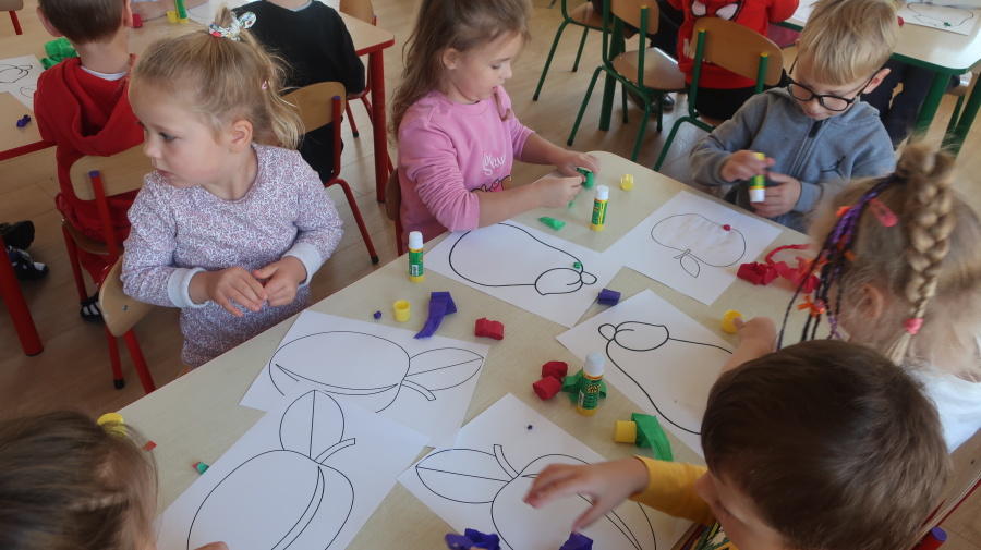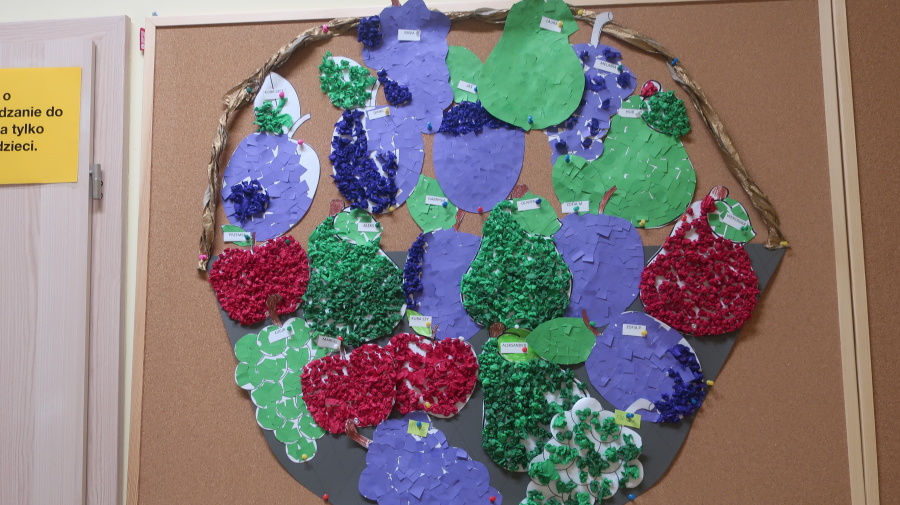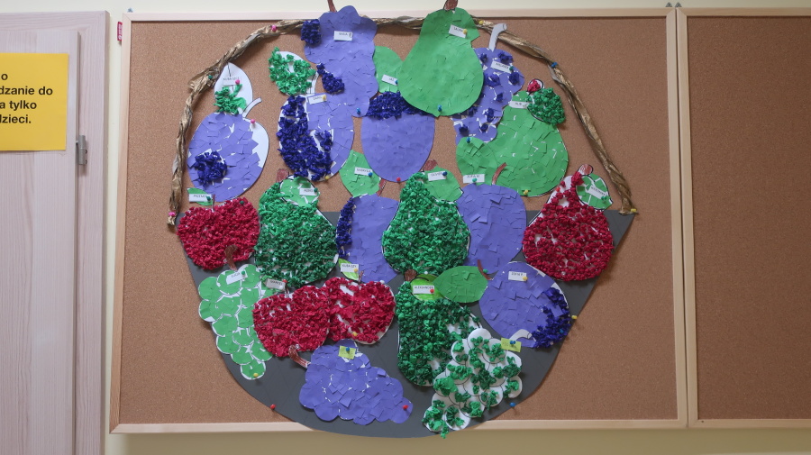 Dziś Misie wybrały się na jesienną wyprawę do sadu! Dzieci dowiedziały się, jakie owoce rosną jesienią w sadzie – jabłka, gruszki, śliwki, a nawet pachnące winogrona. Obejrzały krótki filmik edukacyjny, który pokazał im, jak kolorowo i smacznie jest w sadzie o tej porze roku. Potem przyszedł czas na ucztę – Misie chrupały owoce, które same przyniosły do przedszkola. Było zdrowo, pysznie i bardzo wesoło! ???? Na zakończenie każdy Misiaczek wykonał pracę plastyczną – wyklejanie owoców karteczkami i bibułą. Powstał piękny, kolorowy kosz pełen witamin, który można podziwiać na tablicy przed salą. ????????????
