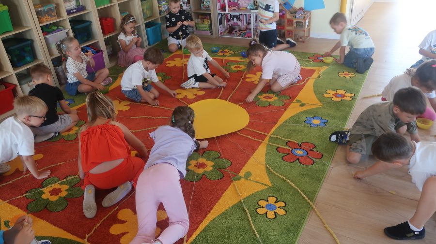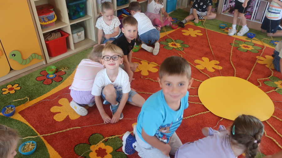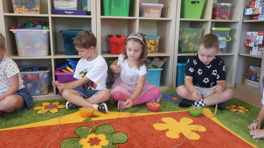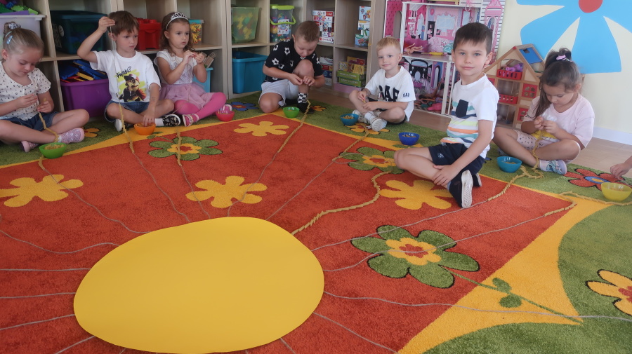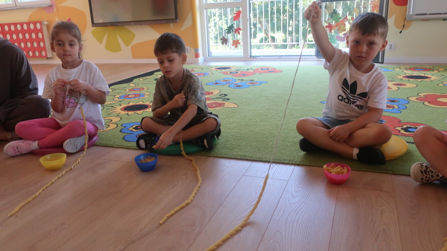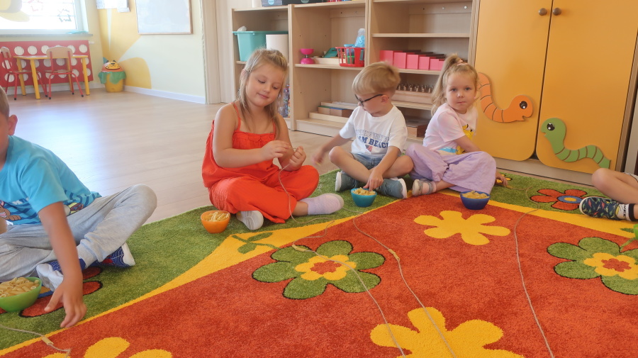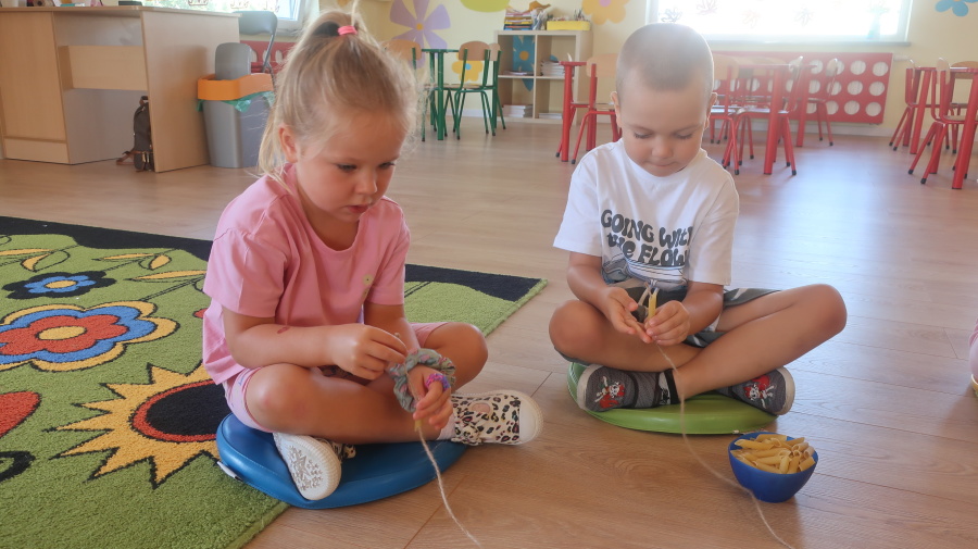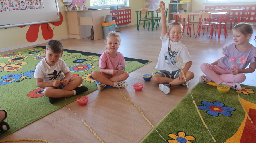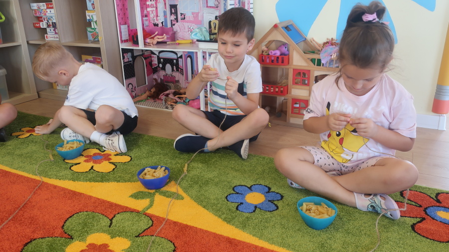 Podczas dzisiejszych zajęć sensorycznych Misie zamieniły się w małych odkrywców słońca. Dzieci nawlekały na sznurki makaronowe rurki, tworząc promyki. Ćwiczenie to rozwijało sprawność rączek, koncentrację oraz koordynację wzrokowo–ruchową. Zabawa dostarczyła dzieciom wiele radości i satysfakcji z samodzielnie wykonanej pracy.