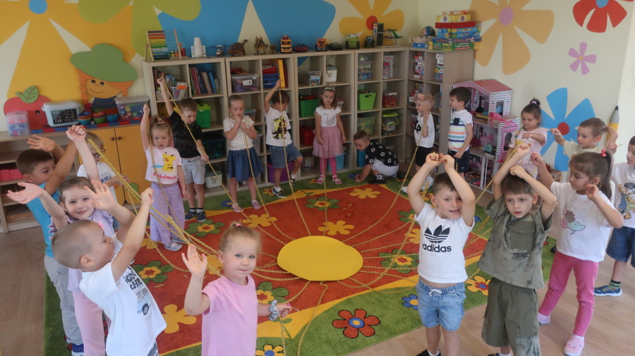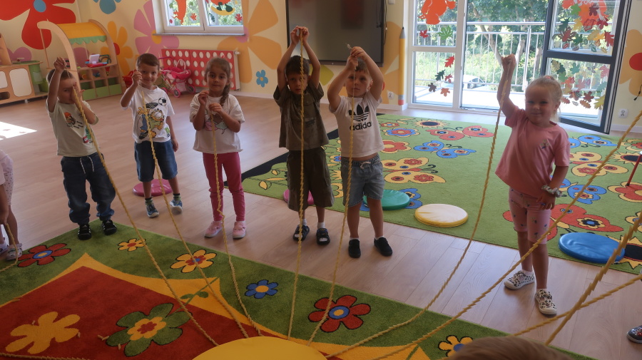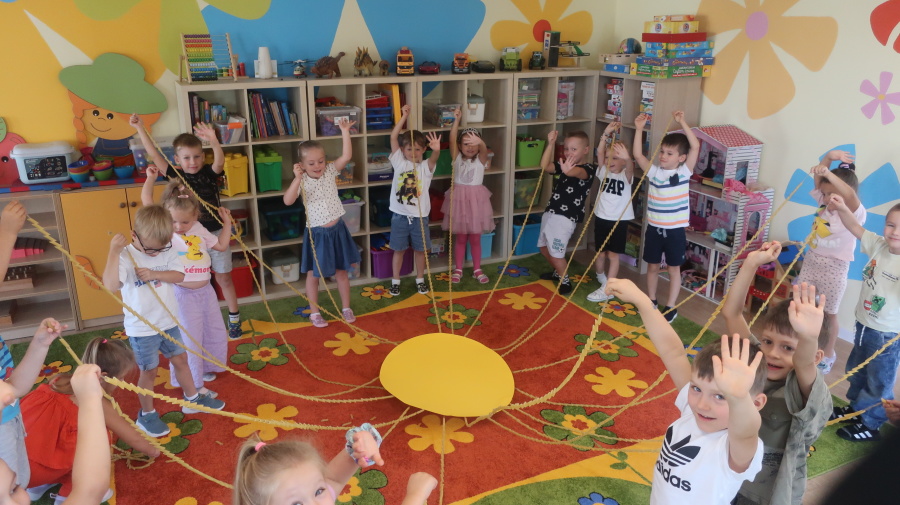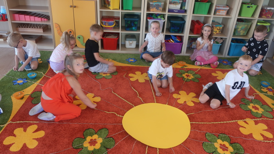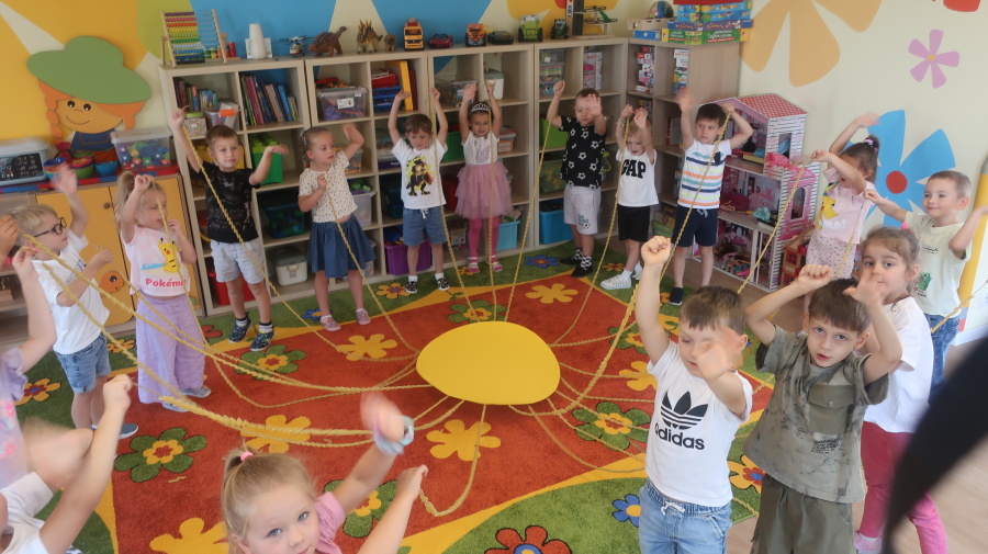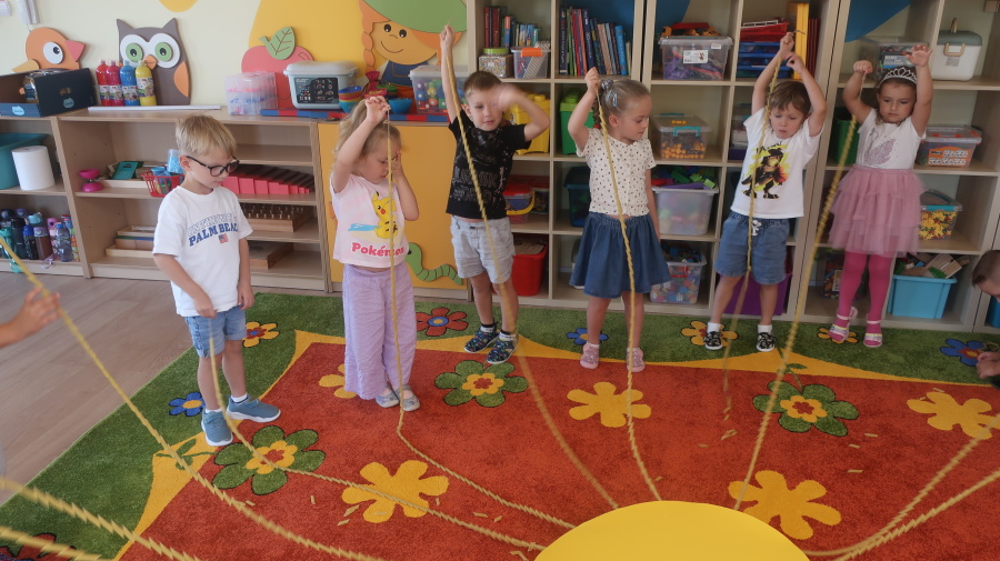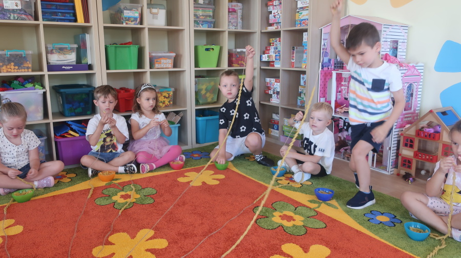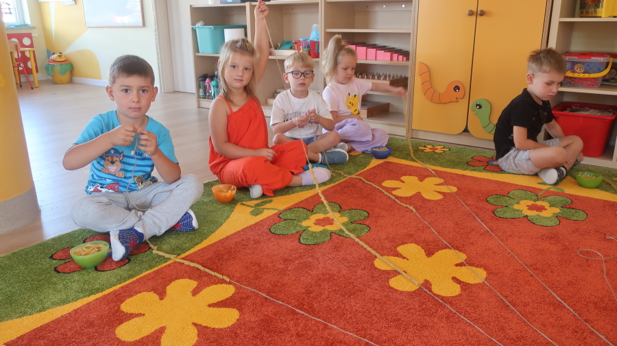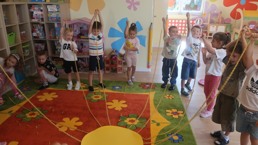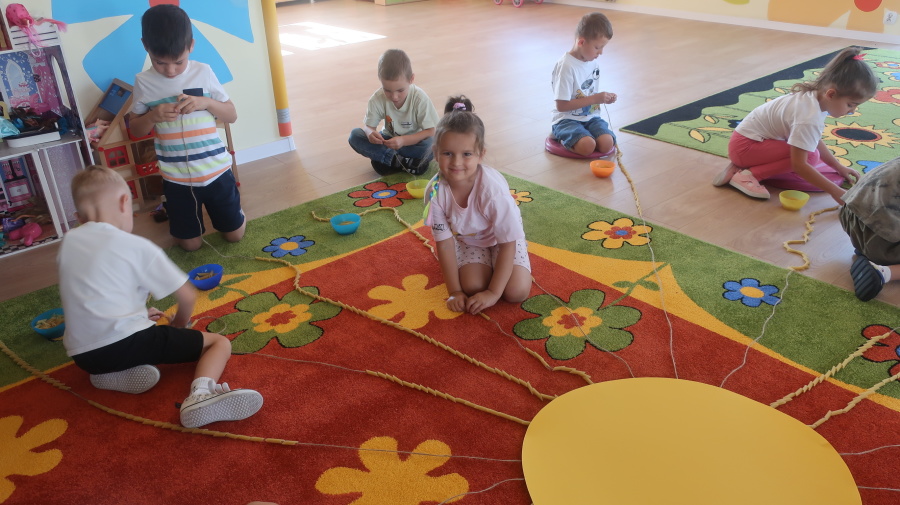 Podczas dzisiejszych zajęć sensorycznych Misie zamieniły się w małych odkrywców słońca. Dzieci nawlekały na sznurki makaronowe rurki, tworząc promyki. Ćwiczenie to rozwijało sprawność rączek, koncentrację oraz koordynację wzrokowo–ruchową. Zabawa dostarczyła dzieciom wiele radości i satysfakcji z samodzielnie wykonanej pracy.