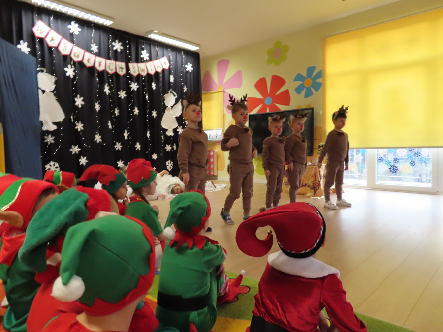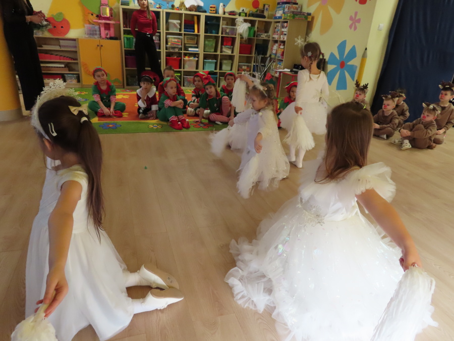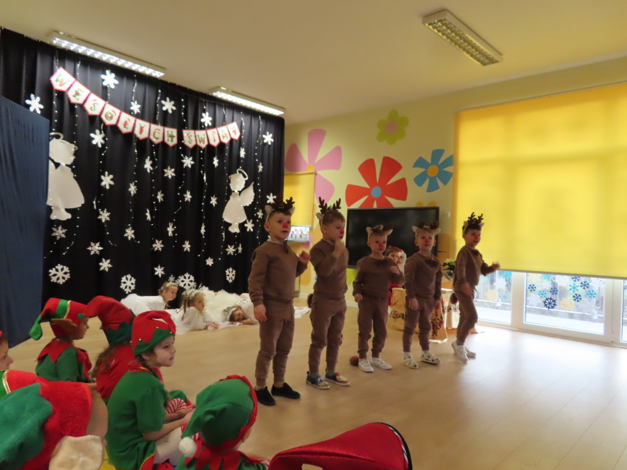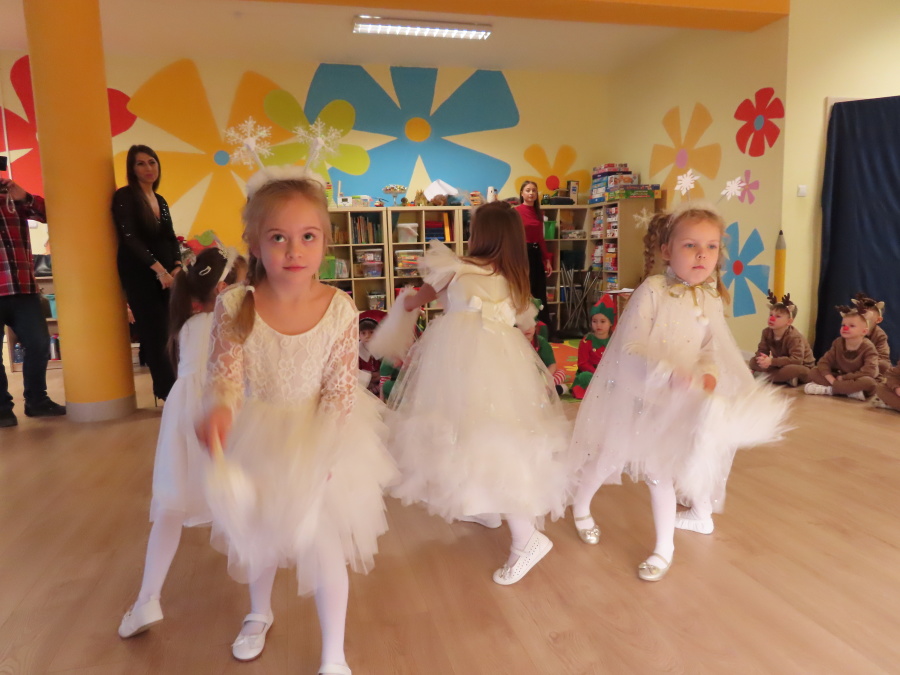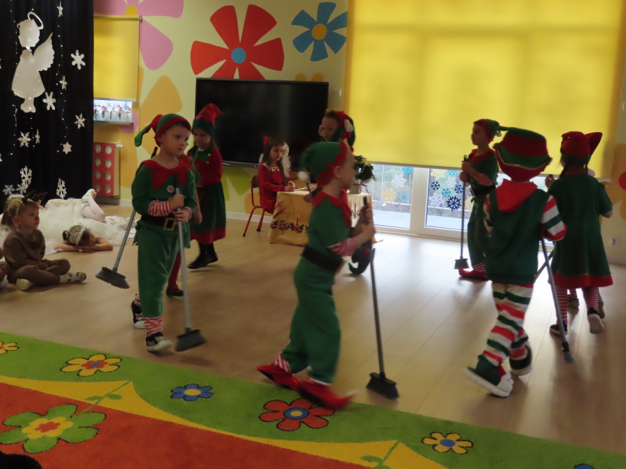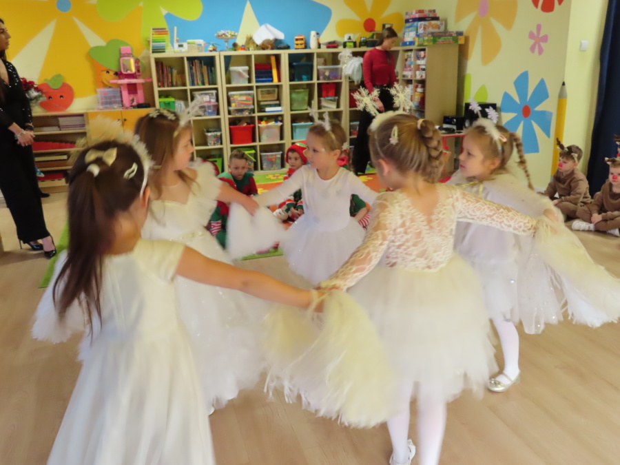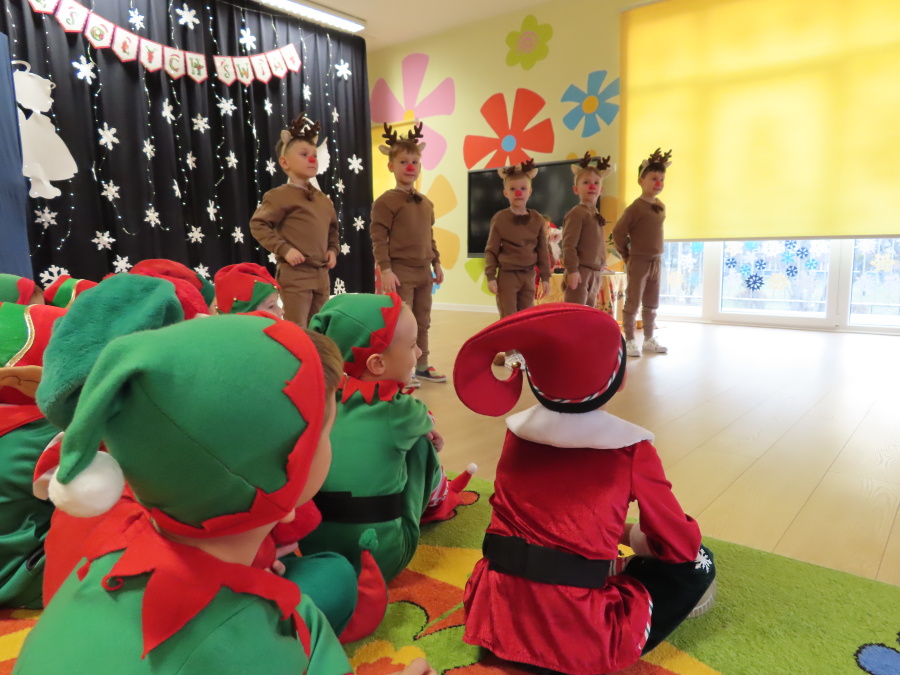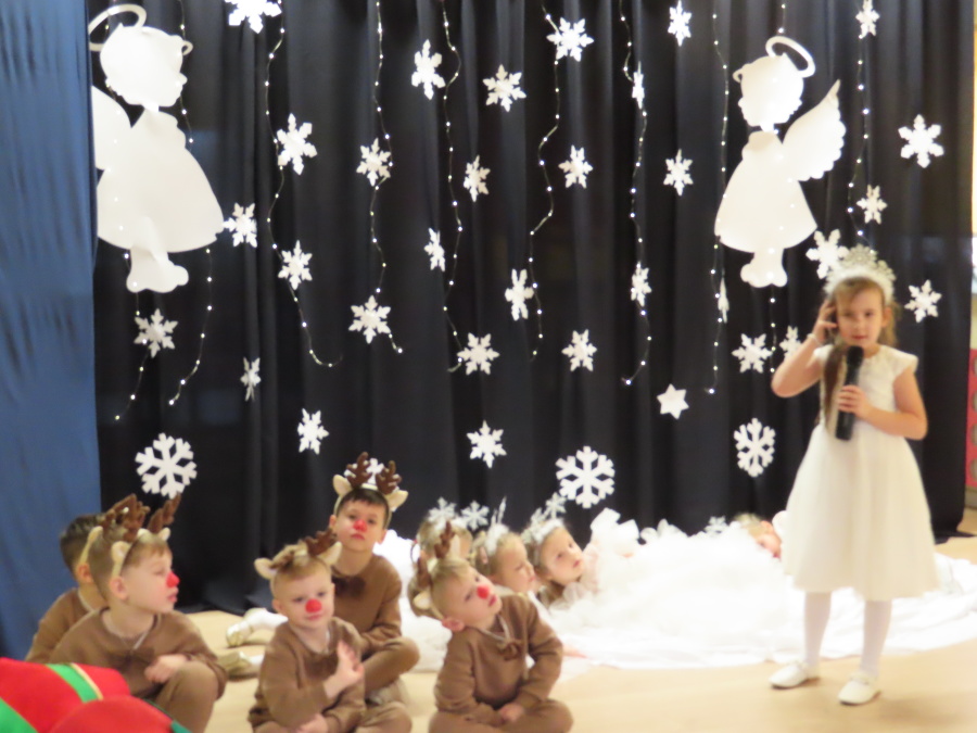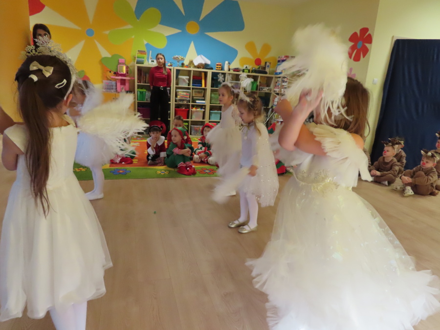 W dniu dzisiejszym Misie wystawiły dla rodziców wyjątkowe jasełka pt. ,, Zapominalskie Śnieżynki”. Na scenie pojawiły się śnieżynki, renifery, elfy oraz Mikołaj ze swoją żoną, którzy wspólnie wprowadzili wszystkich w świąteczny nastrój. Mali artyści z wielkim zaangażowaniem zaprezentowali swoje rolę, a występ został nagrodzony gromkimi brawami i uśmiechami wzruszonych rodziców.