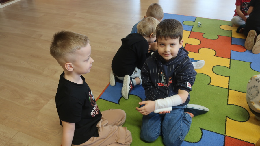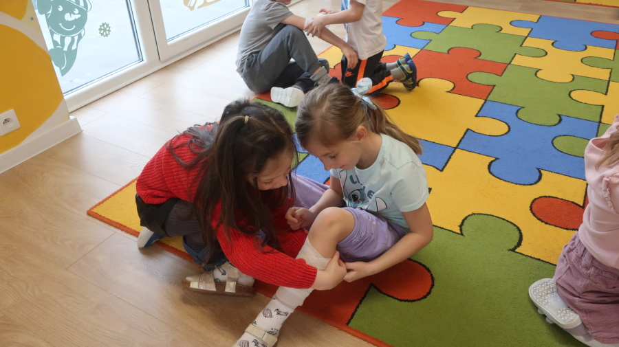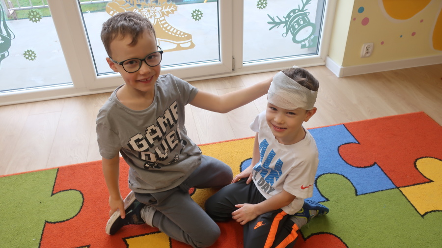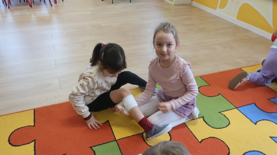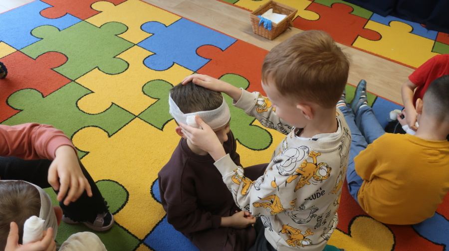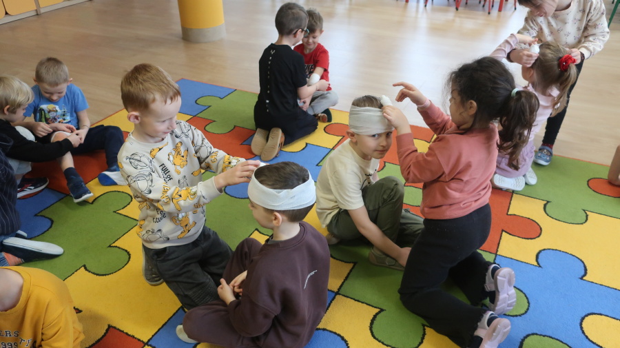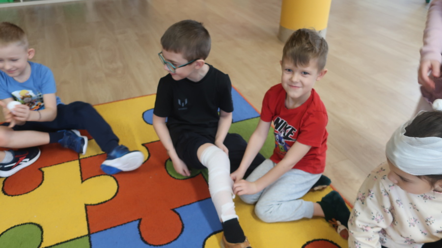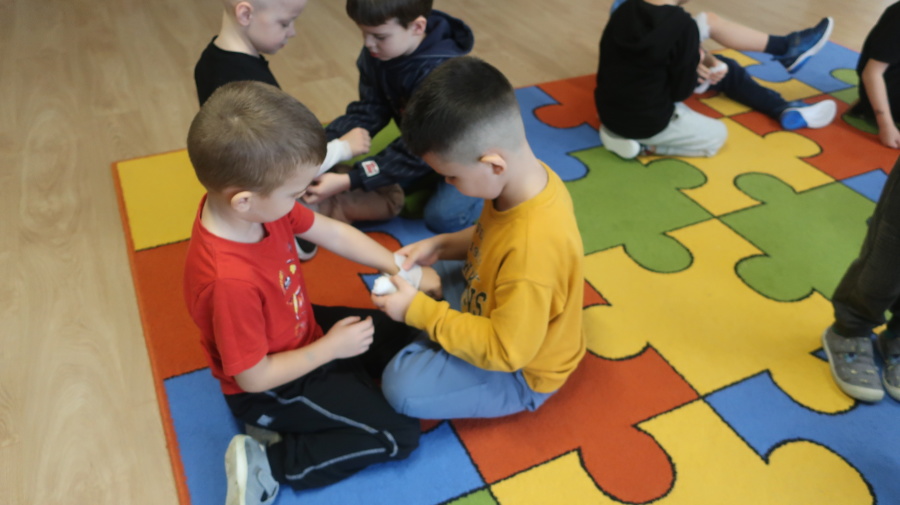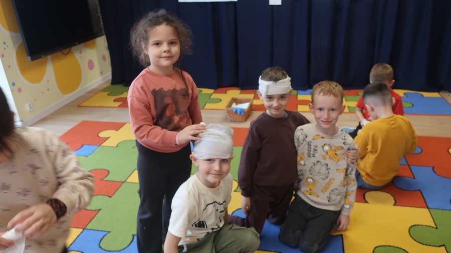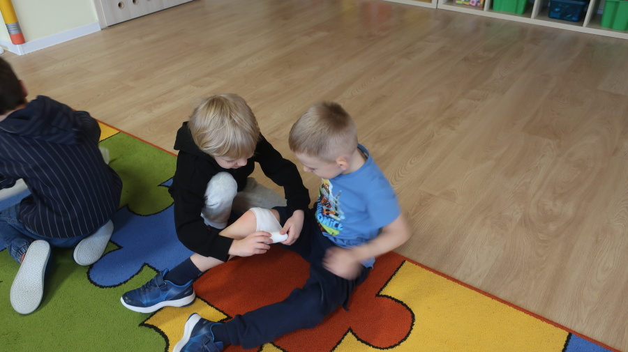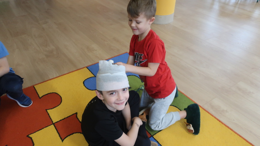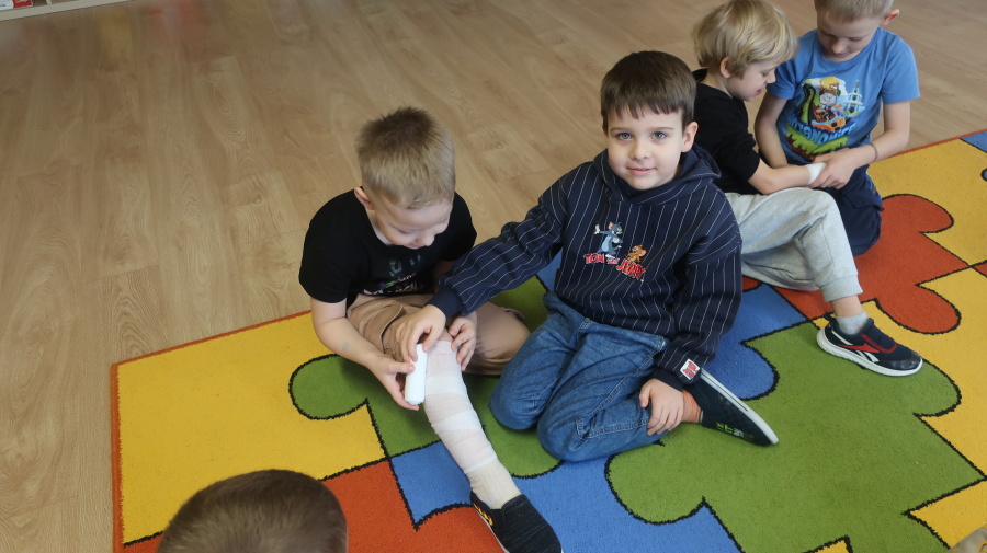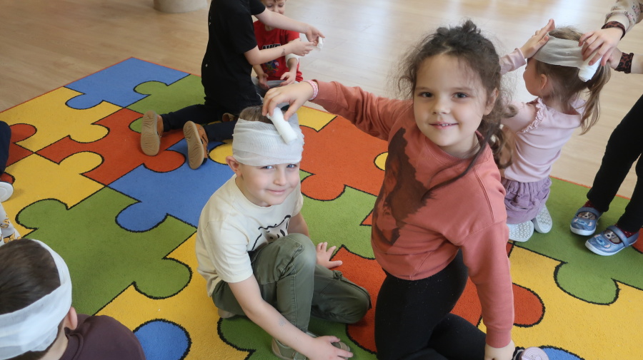 Dzisiaj w grupie Kropeczek odbyły się comiesięczne zajęcia z pierwszej pomocy. Dzieci w tym miesiącu uczyły się, w jaki sposób pomóc osobie, która oddycha ale jest nieprzytomna. Na początku przedszkolaki obserwowały, w jaki sposób krok po kroku ułożyć poszkodowanego w pozycji bocznej ustalonej. Następnie dzieci ćwiczyły w ustalonych w parach. Na zajęciach tych rozmawialiśmy też o urazach i skaleczeniach. Dzieci ćwiczyły również bandażowanie siebie nawzajem.