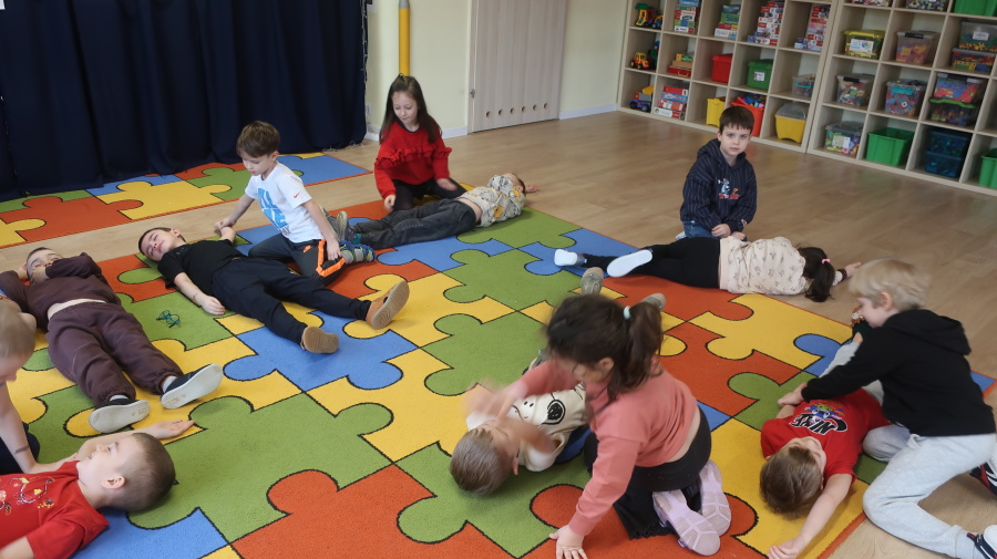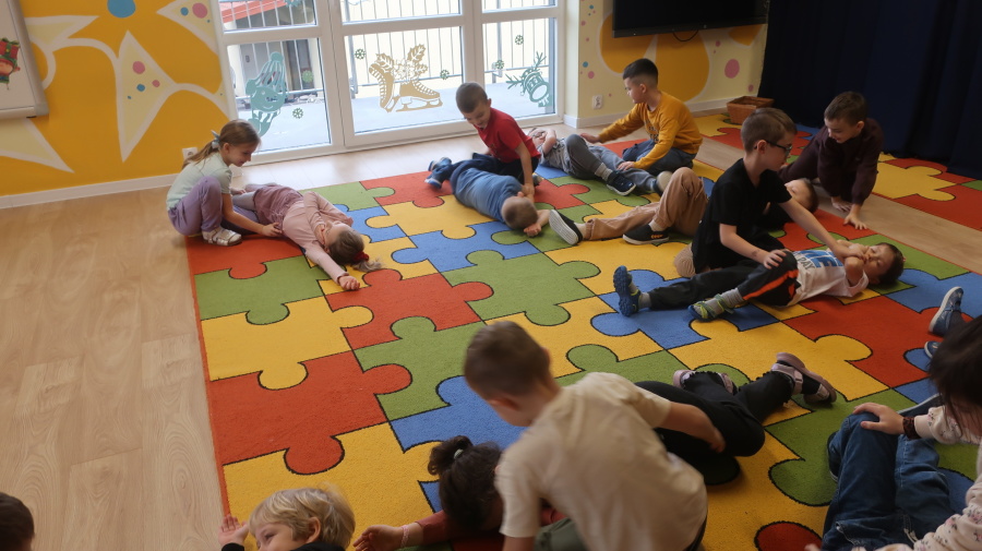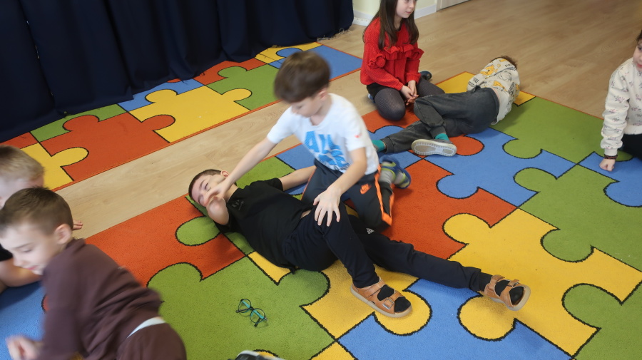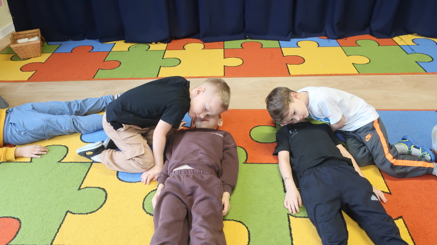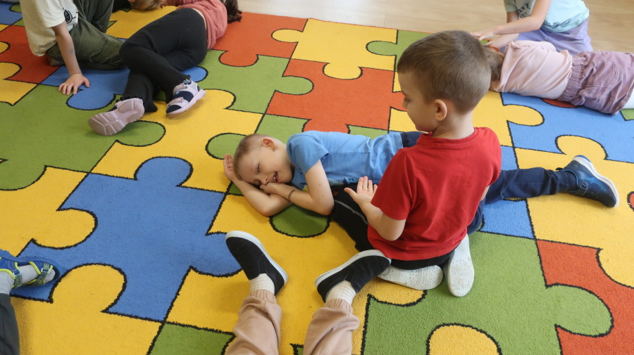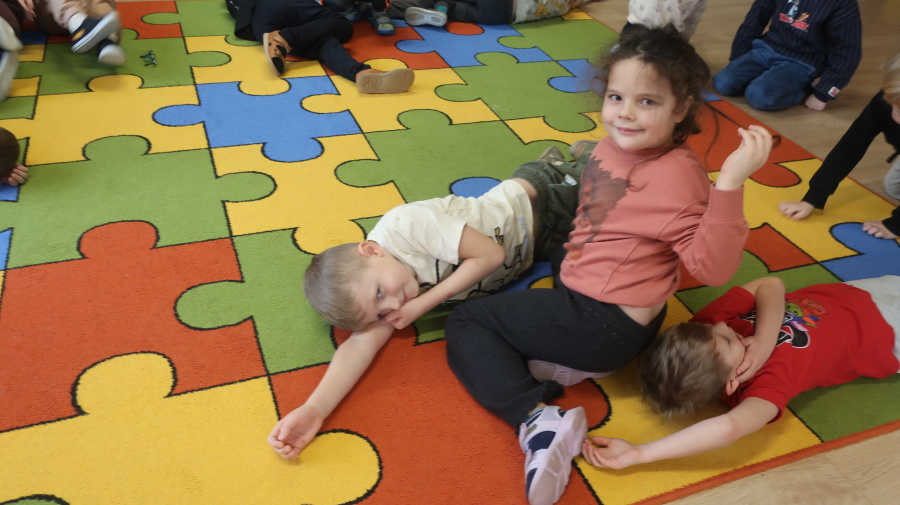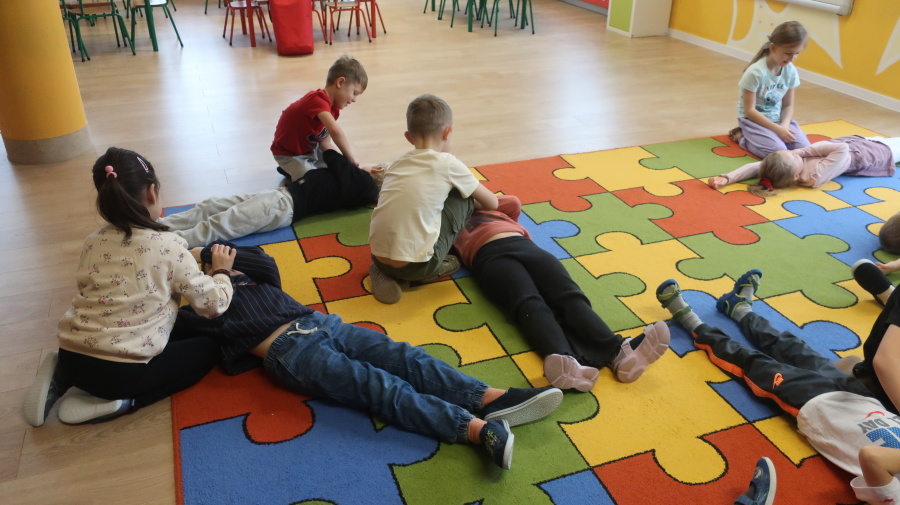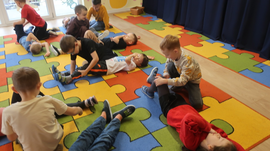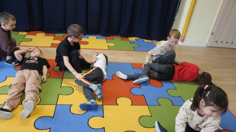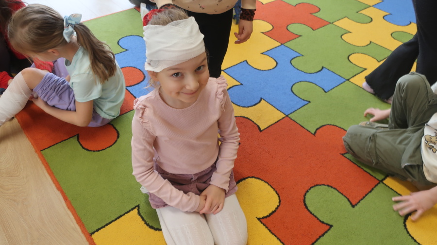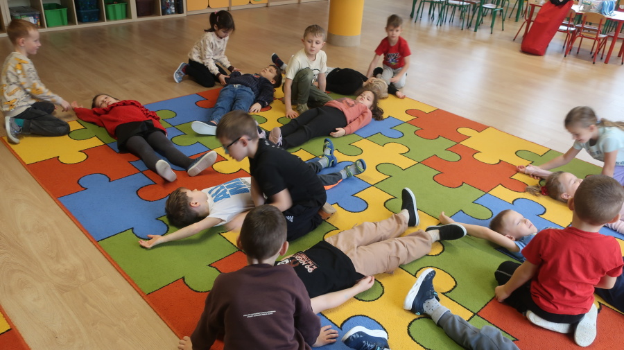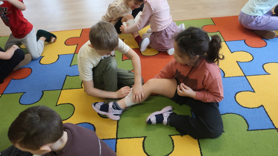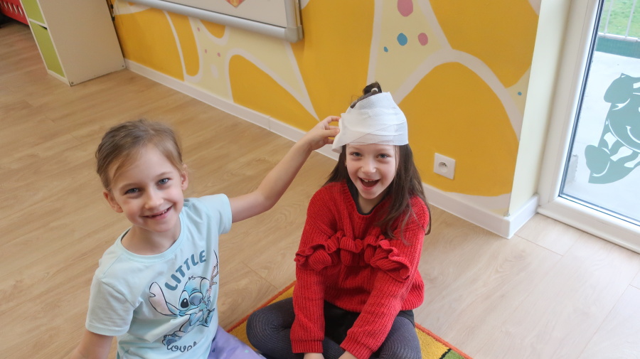 Dzisiaj w grupie Kropeczek odbyły się comiesięczne zajęcia z pierwszej pomocy. Dzieci w tym miesiącu uczyły się, w jaki sposób pomóc osobie, która oddycha ale jest nieprzytomna. Na początku przedszkolaki obserwowały, w jaki sposób krok po kroku ułożyć poszkodowanego w pozycji bocznej ustalonej. Następnie dzieci ćwiczyły w ustalonych w parach. Na zajęciach tych rozmawialiśmy też o urazach i skaleczeniach. Dzieci ćwiczyły również bandażowanie siebie nawzajem.