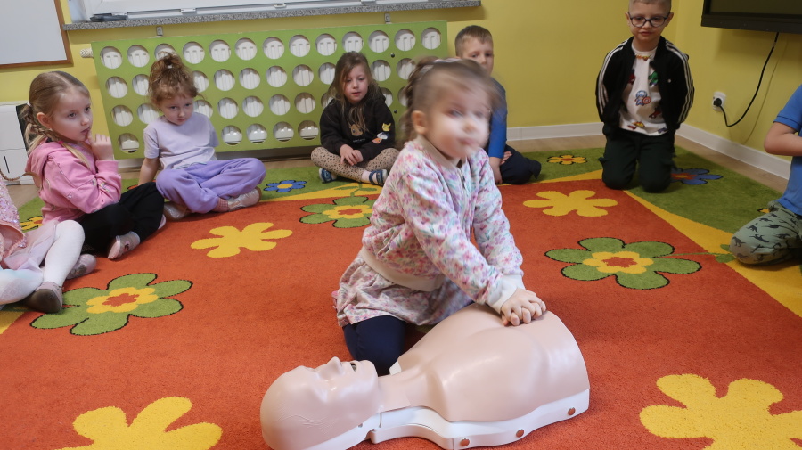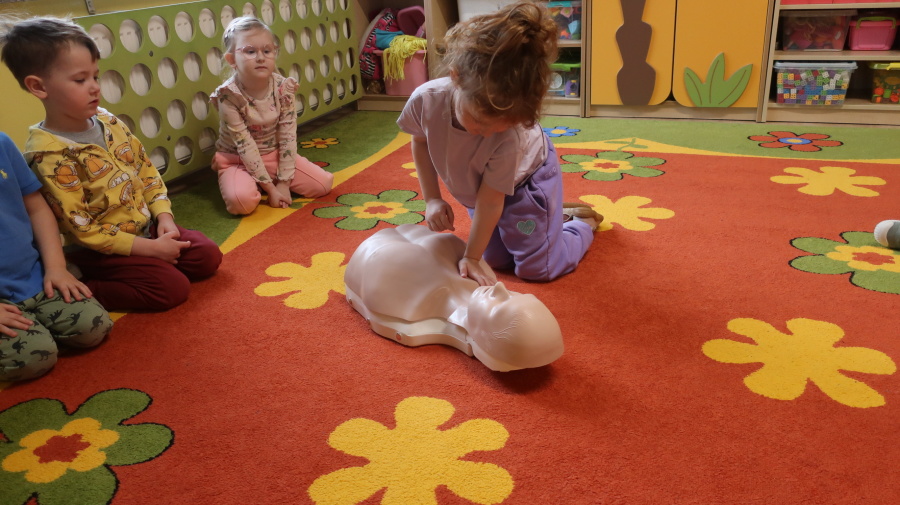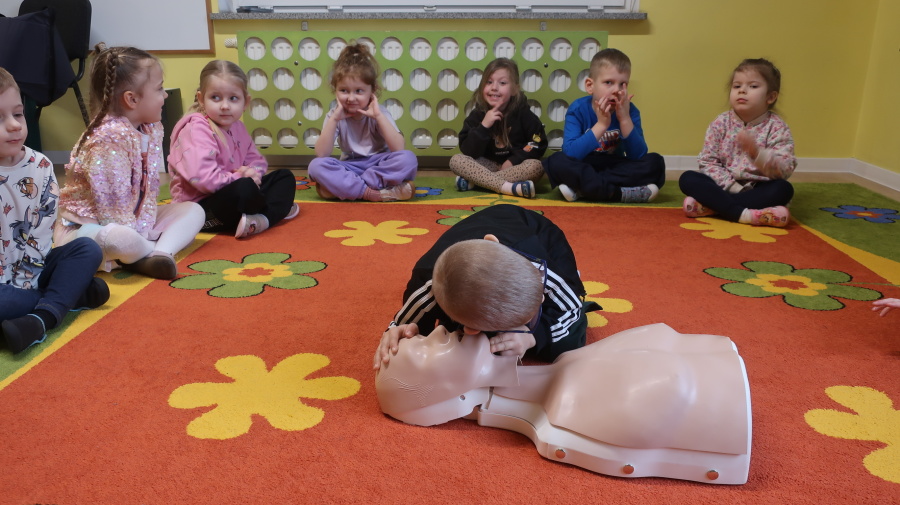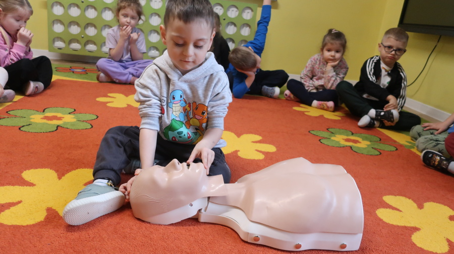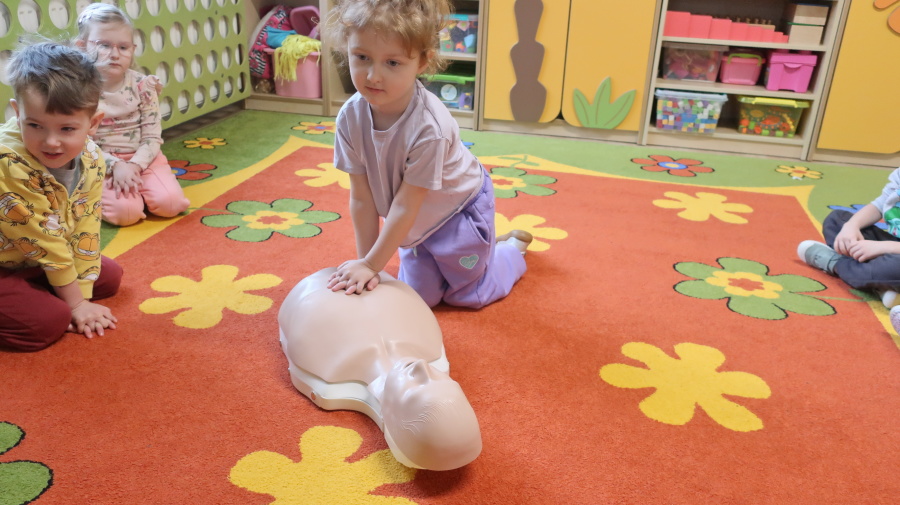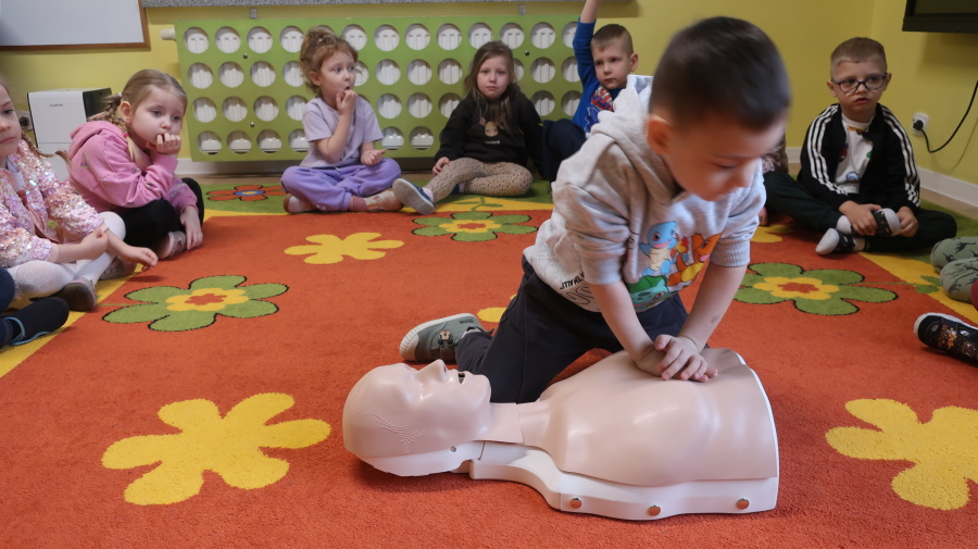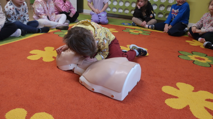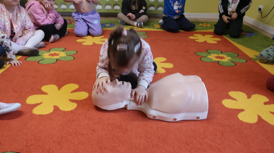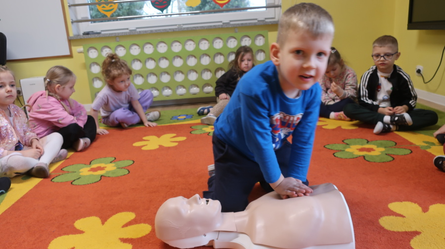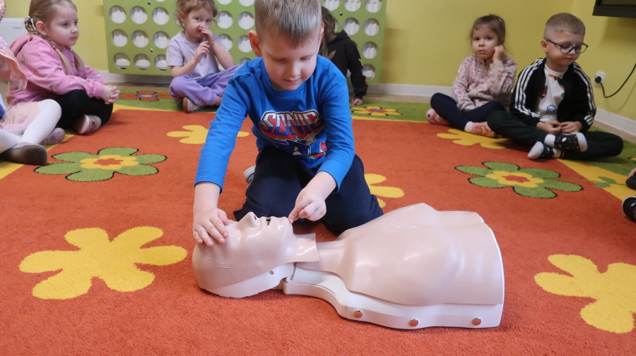 Dzisiejszy dzień w grupie Tygrysków poświęcony był zajęciom z zakresu pierwszej pomocy. Dzieci przypomniały sobie podstawowe zasady udzielania pomocy osobie poszkodowanej – jak prawidłowo wezwać pomoc, sprawdzić przytomność oraz ułożyć osobę w pozycji bezpiecznej. Podczas zajęć dzieci miały możliwość pracy z fantomem szkoleniowym. Każde dziecko mogło przećwiczyć uciski klatki piersiowej, utrwalając prawidłowy rytm i kolejność czynności ratunkowych. Ćwiczenia praktyczne wzbudziły duże zainteresowanie i pozwoliły w bezpieczny sposób oswoić temat udzielania pierwszej pomocy.
