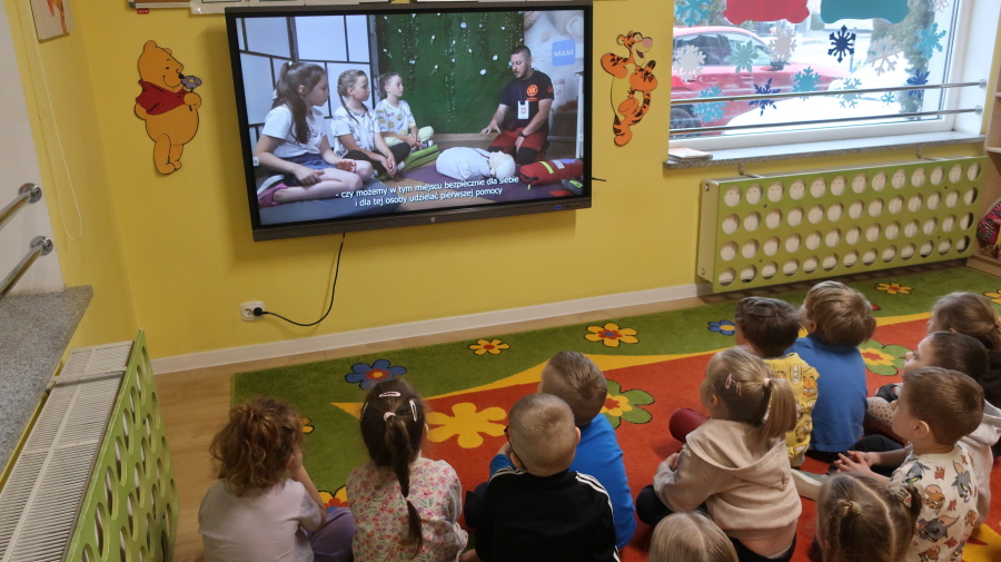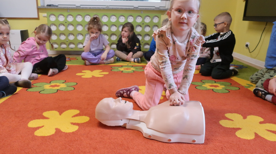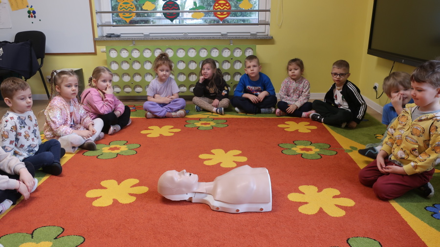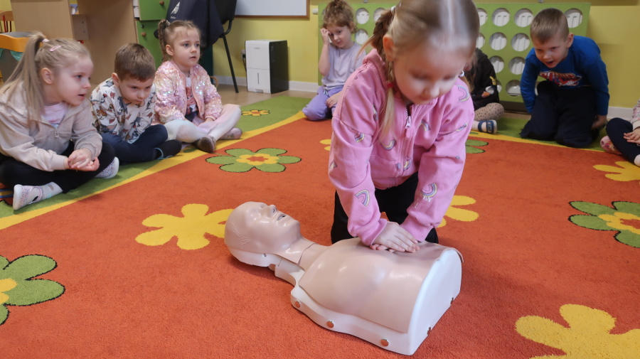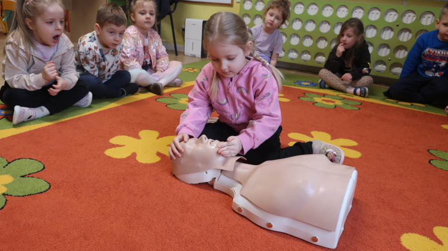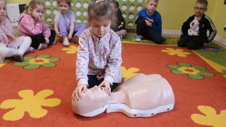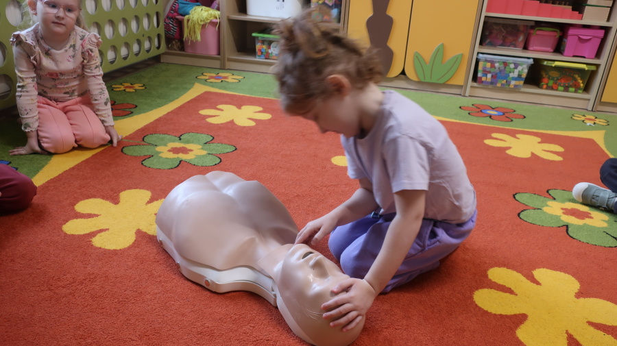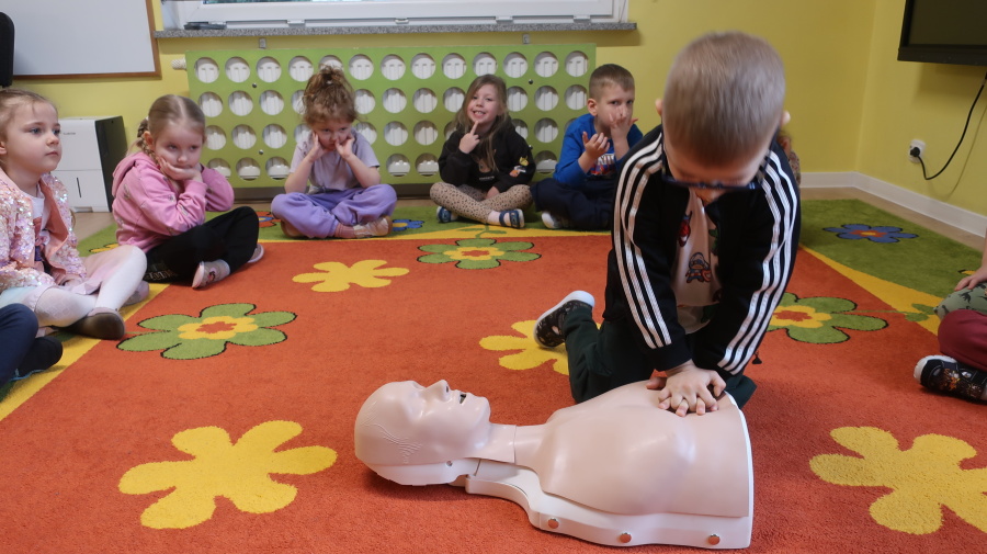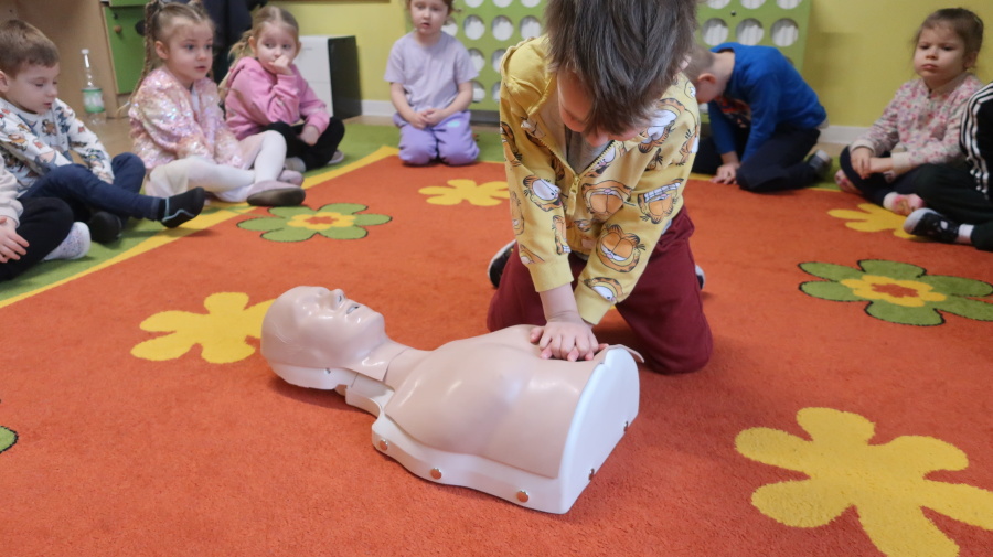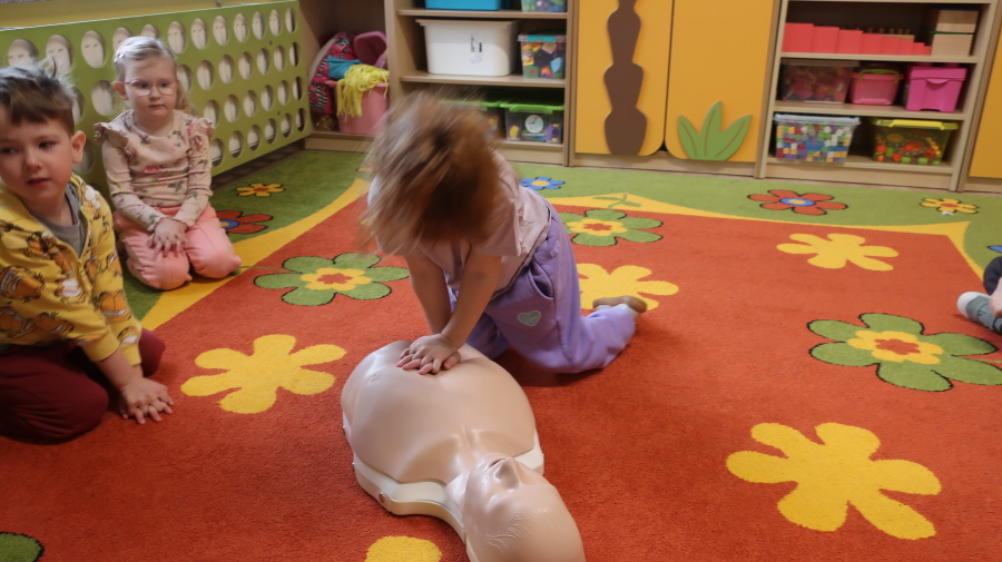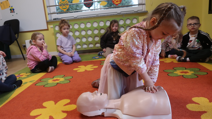 Dzisiejszy dzień w grupie Tygrysków poświęcony był zajęciom z zakresu pierwszej pomocy. Dzieci przypomniały sobie podstawowe zasady udzielania pomocy osobie poszkodowanej – jak prawidłowo wezwać pomoc, sprawdzić przytomność oraz ułożyć osobę w pozycji bezpiecznej. Podczas zajęć dzieci miały możliwość pracy z fantomem szkoleniowym. Każde dziecko mogło przećwiczyć uciski klatki piersiowej, utrwalając prawidłowy rytm i kolejność czynności ratunkowych. Ćwiczenia praktyczne wzbudziły duże zainteresowanie i pozwoliły w bezpieczny sposób oswoić temat udzielania pierwszej pomocy.