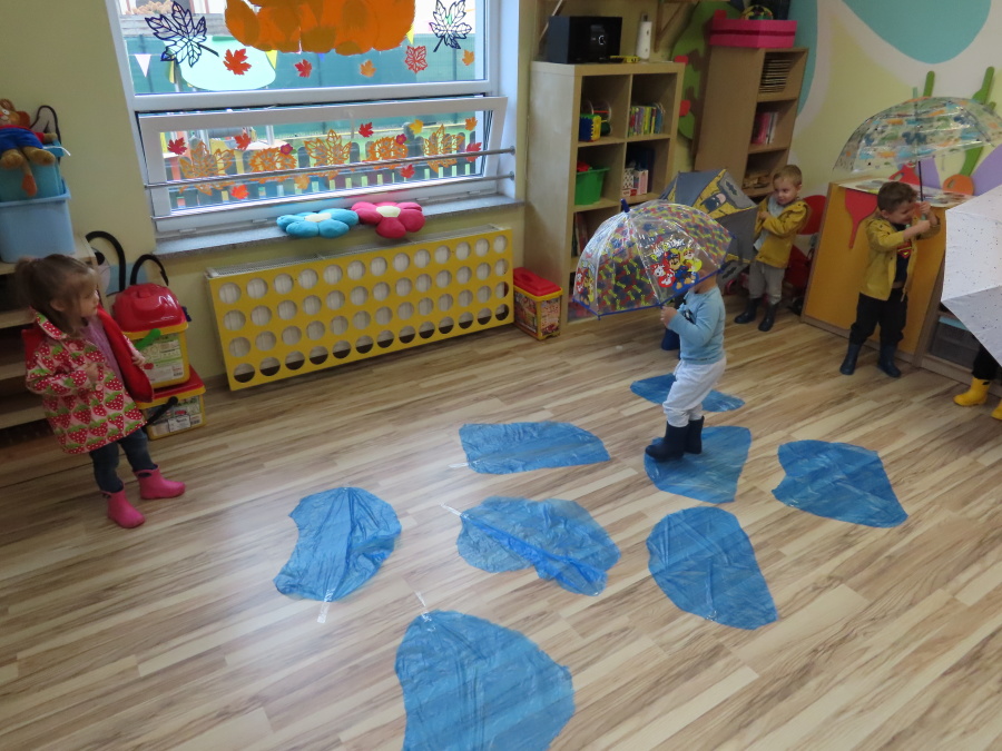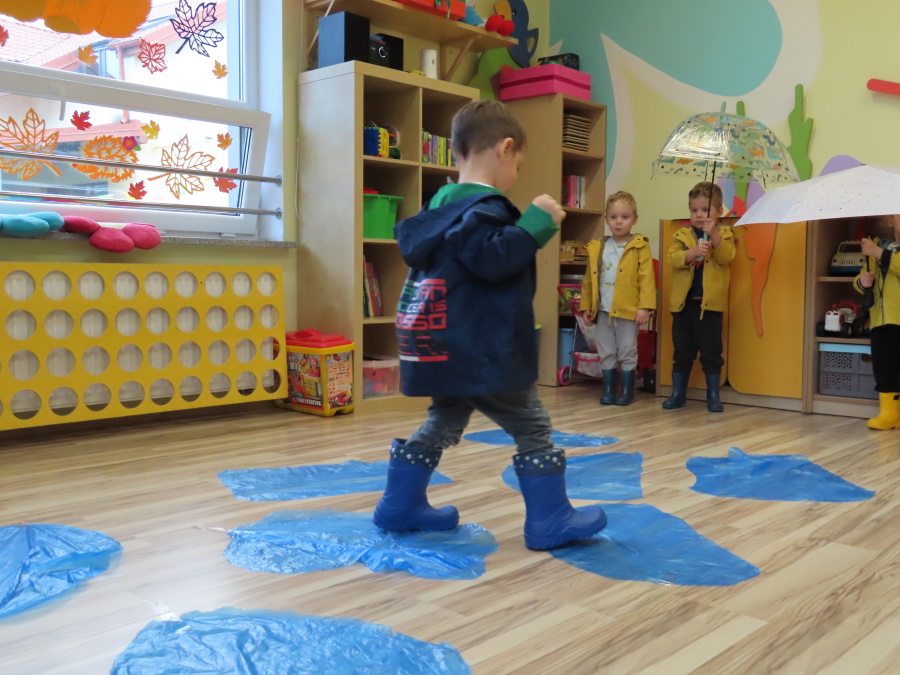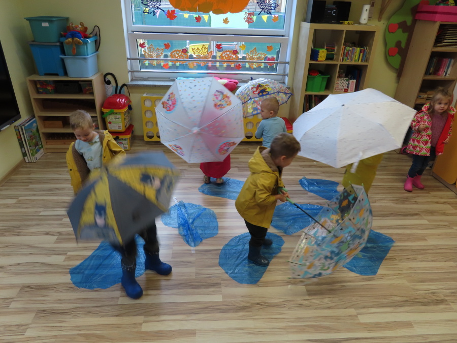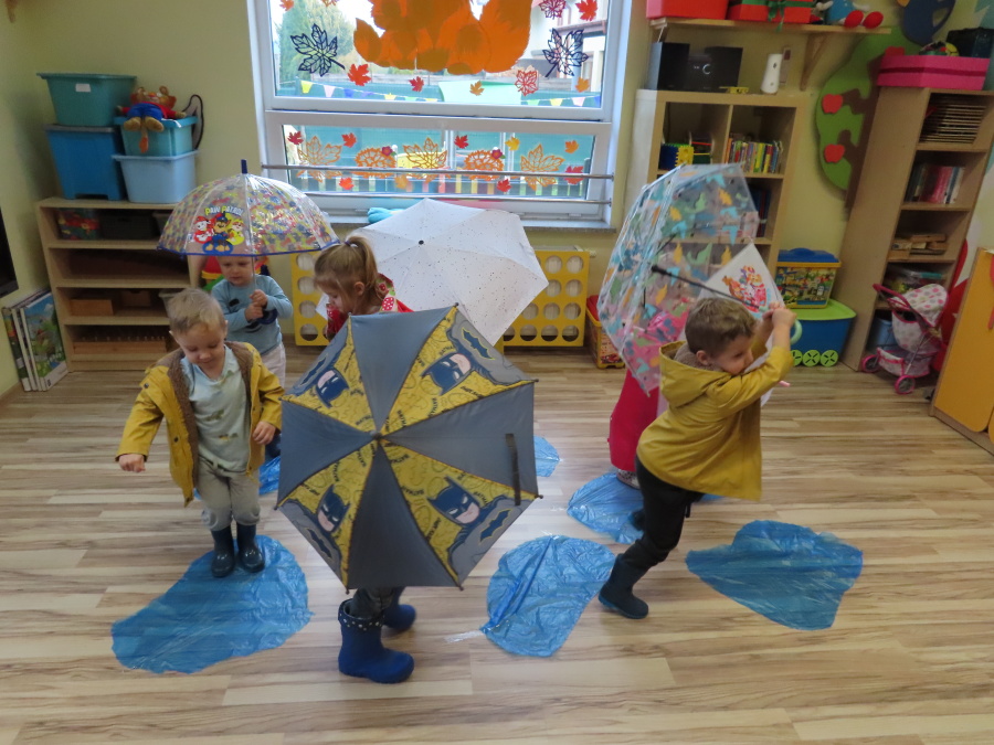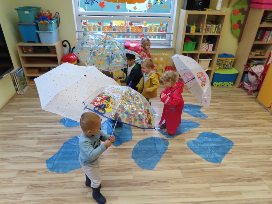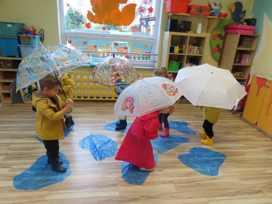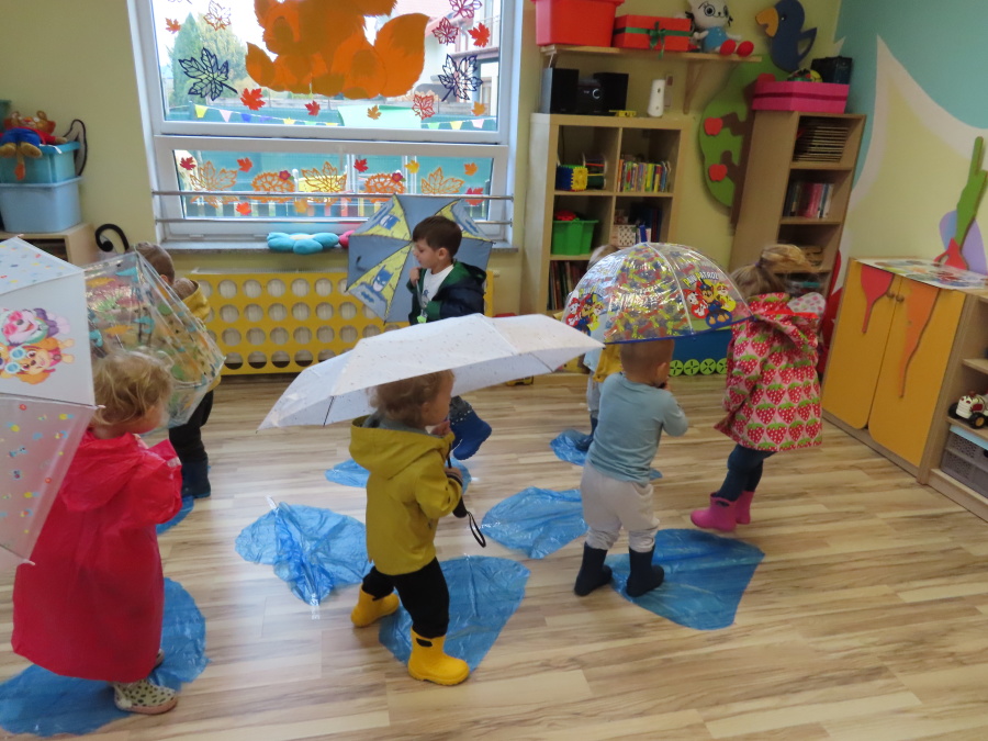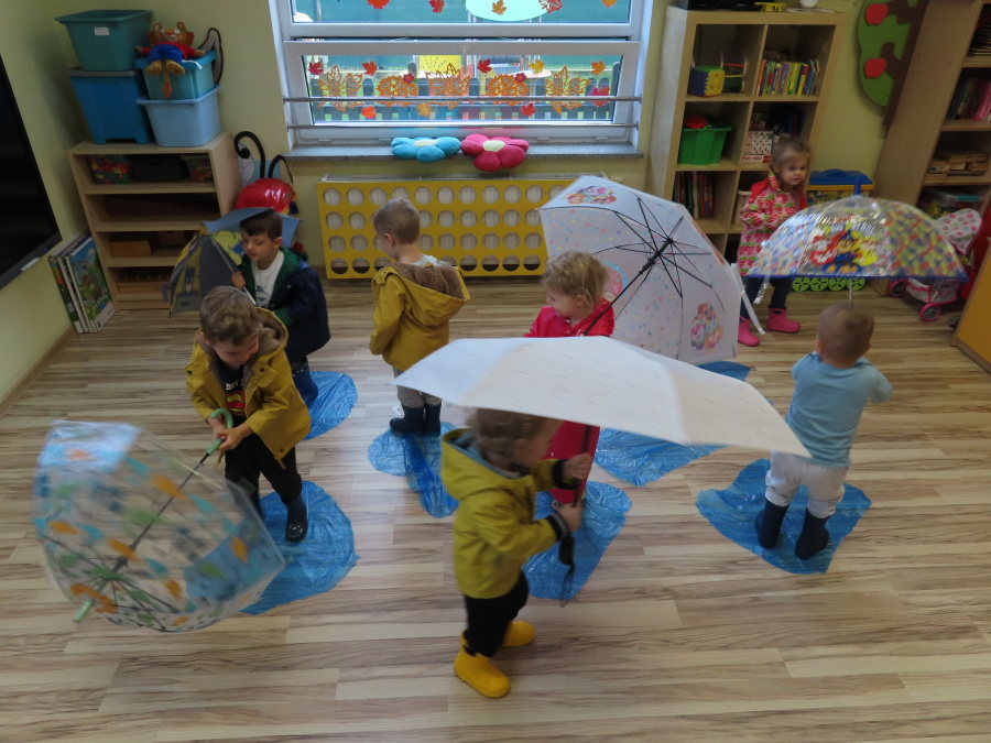 Dzisiejsze zajęcia przebiegły w radosnej i aktywnej atmosferze. ???? Dzieci z dużym zaangażowaniem brały udział w rozmowie, zabawach i pracy plastycznej. Chętnie ubierały kalosze, płaszcze przeciwdeszczowe oraz brały do rąk parasolki, wcielając się w rolę spacerowiczów w deszczowy dzień. ☔️????️Podczas zajęć utrwaliliśmy wiedzę na temat odpowiedniego ubioru na deszczową pogodę. Zabawa w „skakanie po kałużach” dostarczyła im wiele radości, a jednocześnie rozwijała ich sprawność fizyczną i koordynację ruchową. ????️
