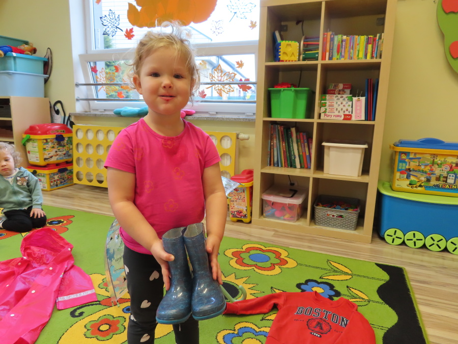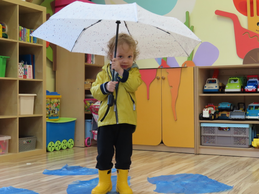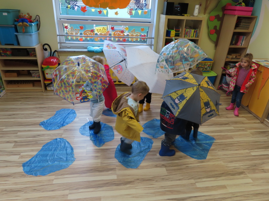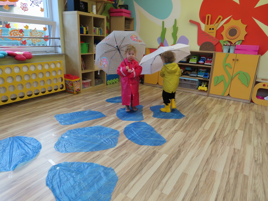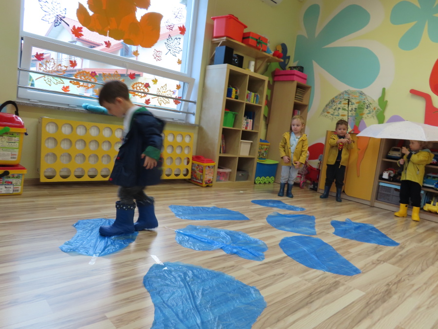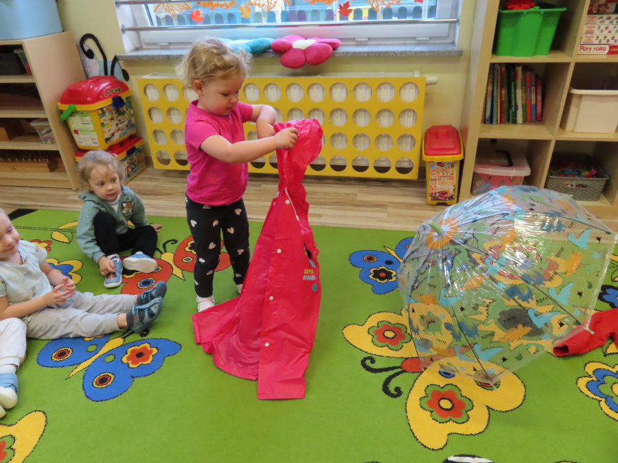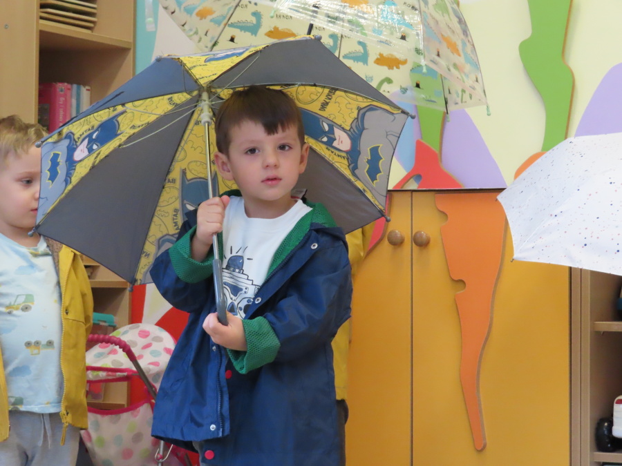 Dzisiejsze zajęcia przebiegły w radosnej i aktywnej atmosferze. ???? Dzieci z dużym zaangażowaniem brały udział w rozmowie, zabawach i pracy plastycznej. Chętnie ubierały kalosze, płaszcze przeciwdeszczowe oraz brały do rąk parasolki, wcielając się w rolę spacerowiczów w deszczowy dzień. ☔️????️Podczas zajęć utrwaliliśmy wiedzę na temat odpowiedniego ubioru na deszczową pogodę. Zabawa w „skakanie po kałużach” dostarczyła im wiele radości, a jednocześnie rozwijała ich sprawność fizyczną i koordynację ruchową. ????️