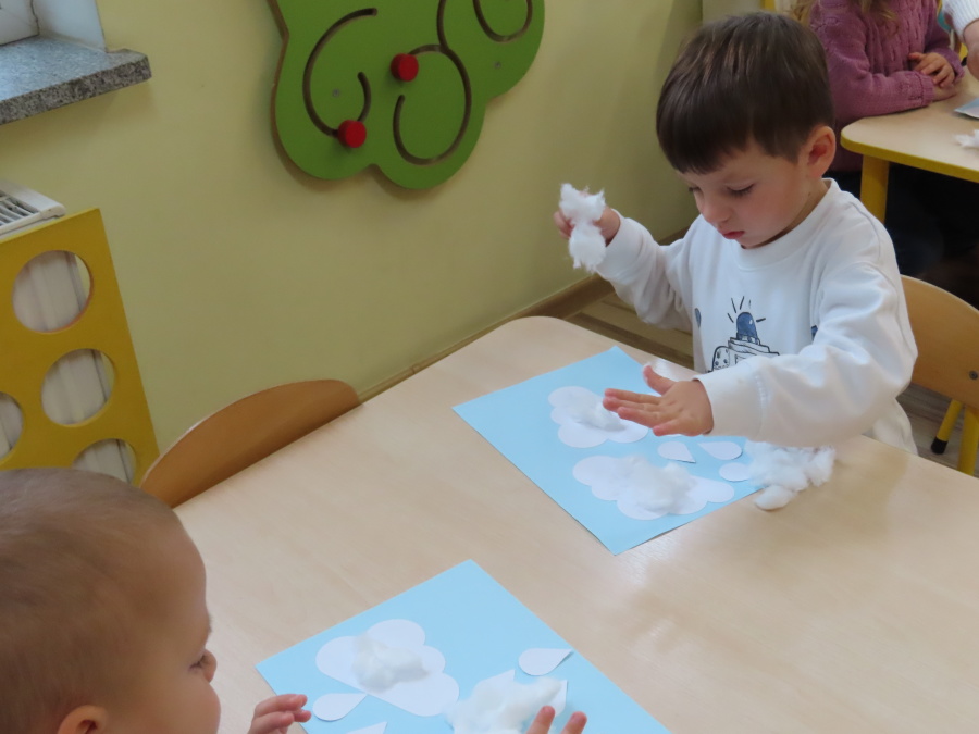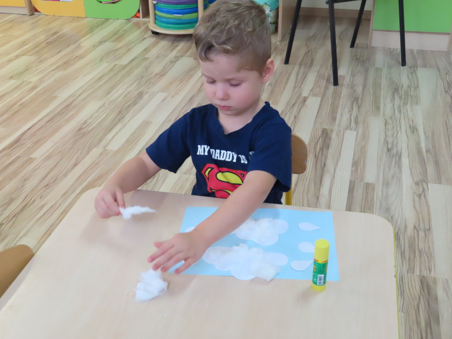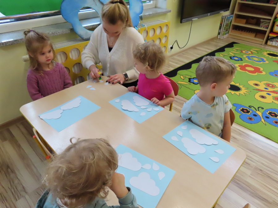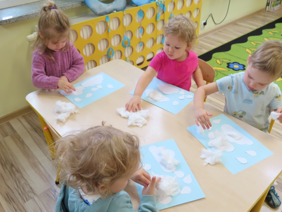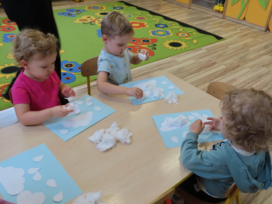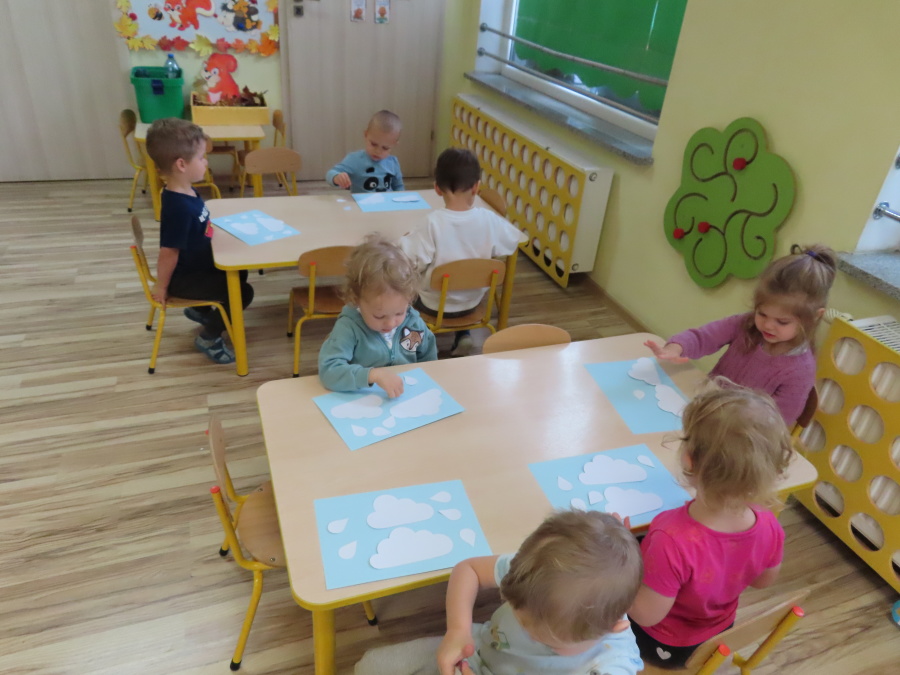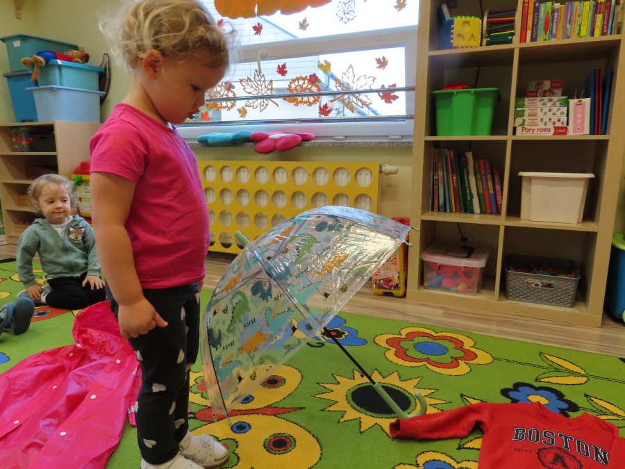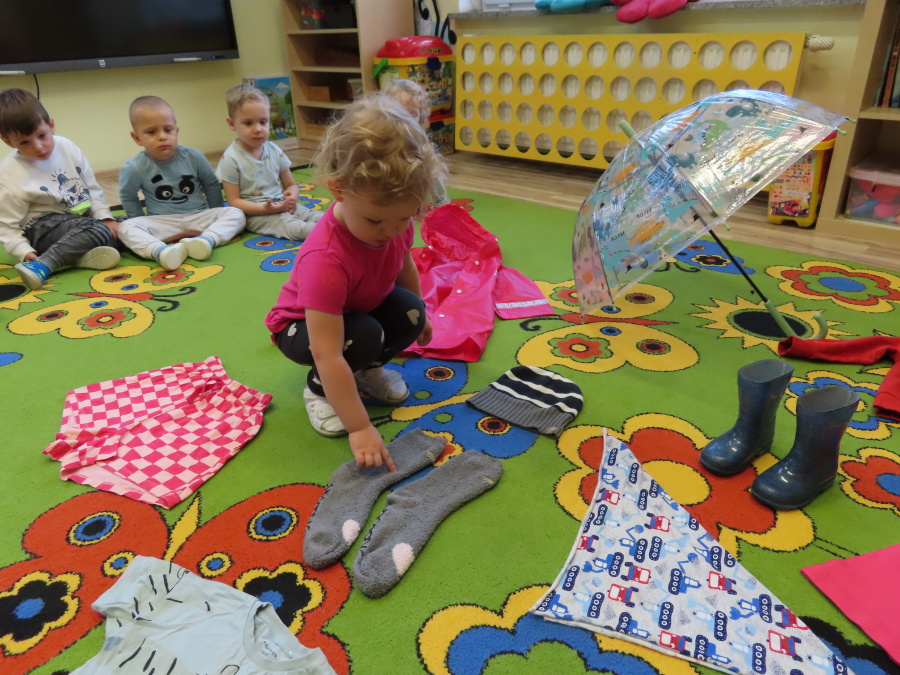 Dzisiejsze zajęcia przebiegły w radosnej i aktywnej atmosferze. ???? Dzieci z dużym zaangażowaniem brały udział w rozmowie, zabawach i pracy plastycznej. Chętnie ubierały kalosze, płaszcze przeciwdeszczowe oraz brały do rąk parasolki, wcielając się w rolę spacerowiczów w deszczowy dzień. ☔️????️Podczas zajęć utrwaliliśmy wiedzę na temat odpowiedniego ubioru na deszczową pogodę. Zabawa w „skakanie po kałużach” dostarczyła im wiele radości, a jednocześnie rozwijała ich sprawność fizyczną i koordynację ruchową. ????️