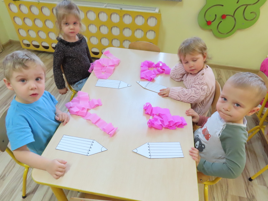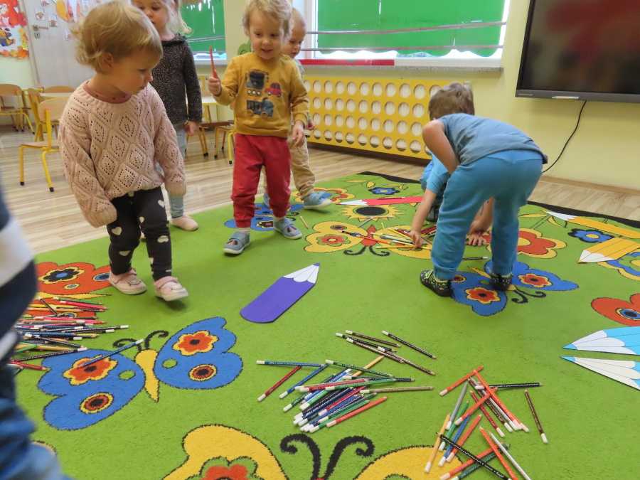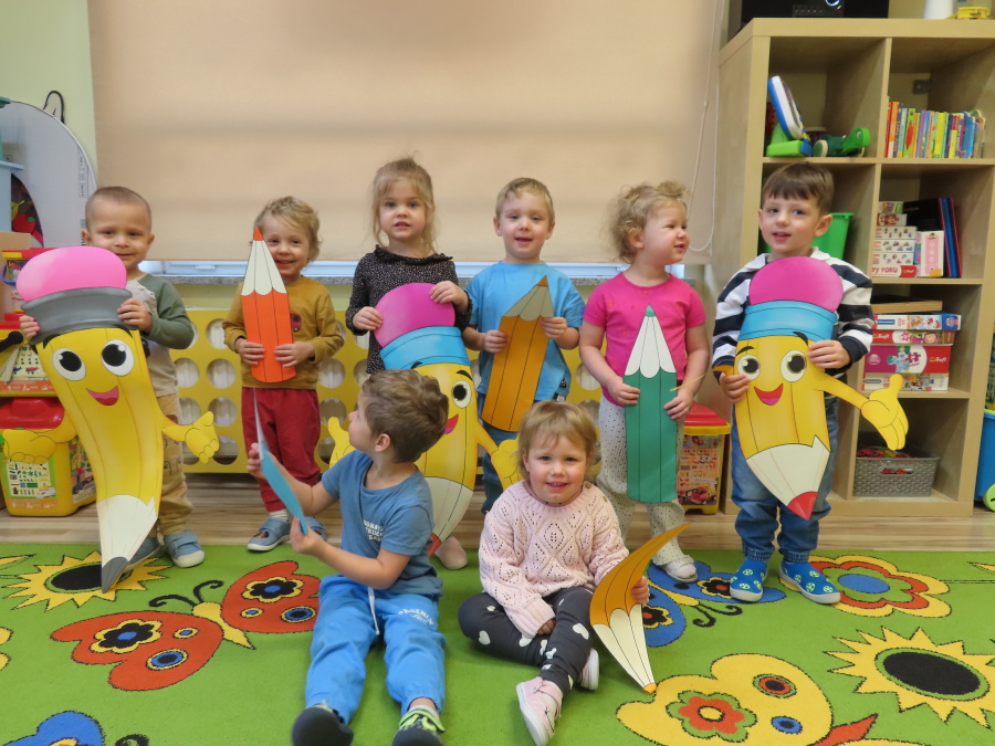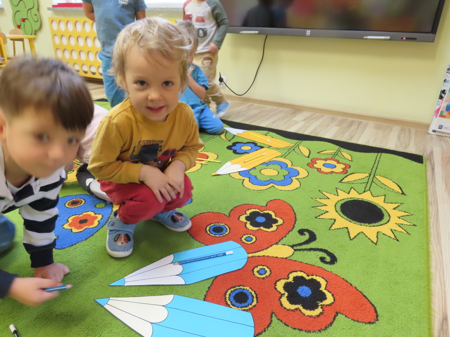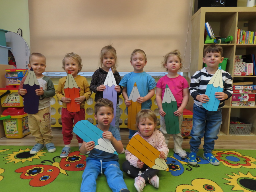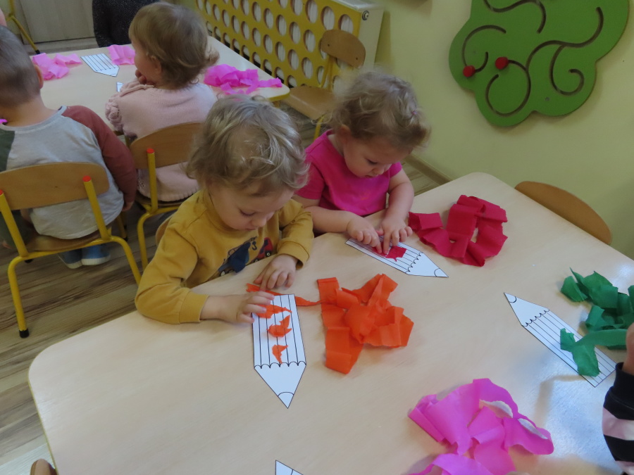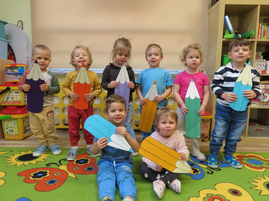 Dziś w grupie Pszczółek obchodziliśmy „Dzień Kredki”. Z tej okazji u maluszków odbywały się zabawy z kredkami w roli głównej. Dzieci porządkowały wymieszane kredki, ćwicząc klasyfikowanie i nazywanie barw. Następnie stworzyliśmy wspólną kredkę, którą wypełniliśmy ścinkami papieru, pracując nad sprawnością manualną i współpracą. Na koniec każde dziecko ozdobiło własny szablon kredki, przyklejając kawałki bibuły. Dzień był bardzo udany i pełen twórczej zabawy.