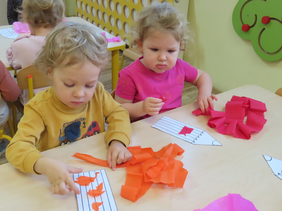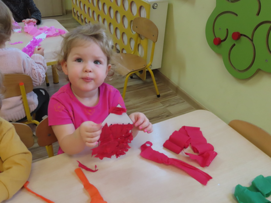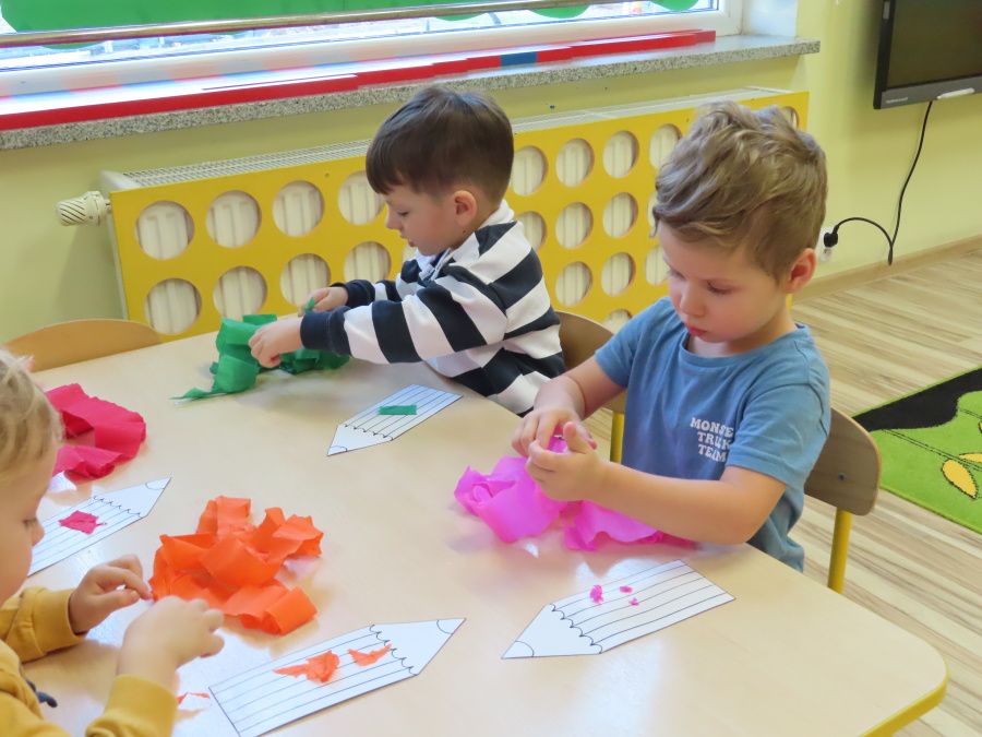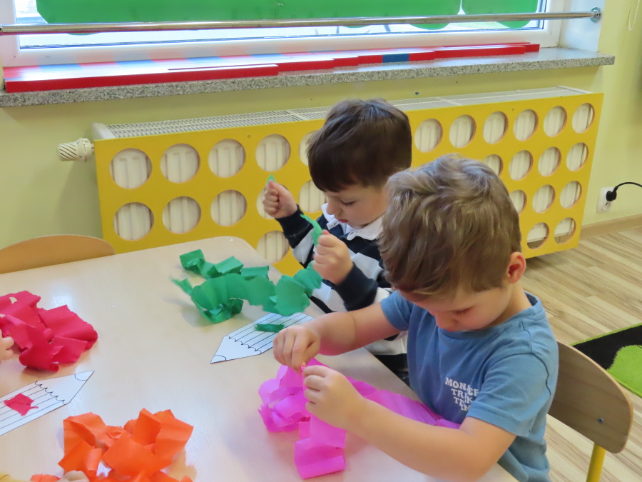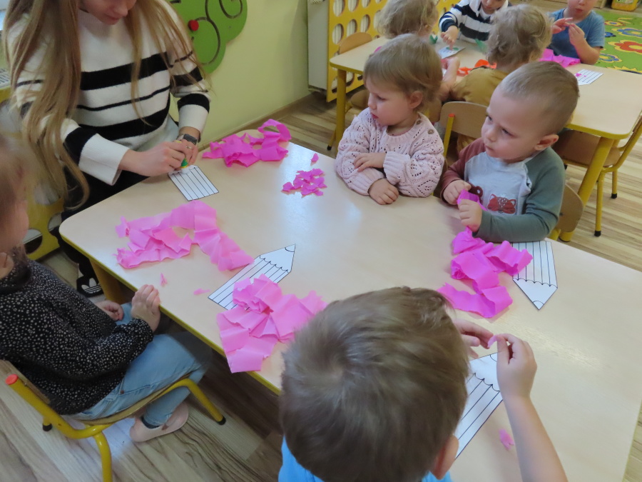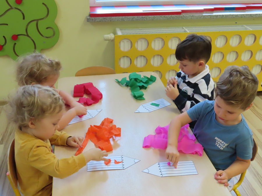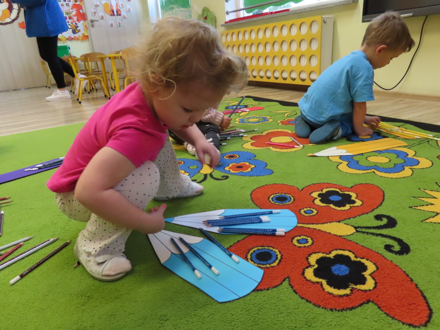 Dziś w grupie Pszczółek obchodziliśmy „Dzień Kredki”. Z tej okazji u maluszków odbywały się zabawy z kredkami w roli głównej. Dzieci porządkowały wymieszane kredki, ćwicząc klasyfikowanie i nazywanie barw. Następnie stworzyliśmy wspólną kredkę, którą wypełniliśmy ścinkami papieru, pracując nad sprawnością manualną i współpracą. Na koniec każde dziecko ozdobiło własny szablon kredki, przyklejając kawałki bibuły. Dzień był bardzo udany i pełen twórczej zabawy.