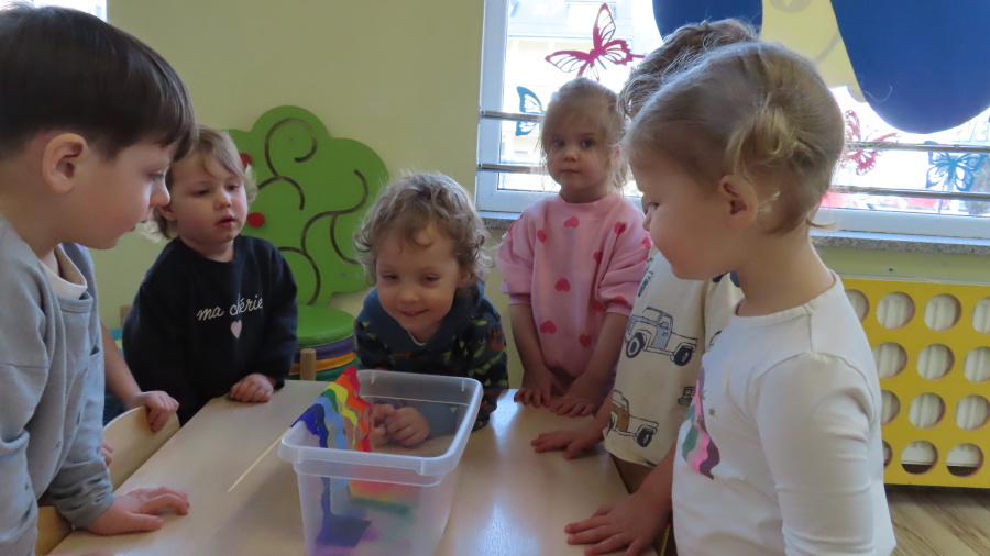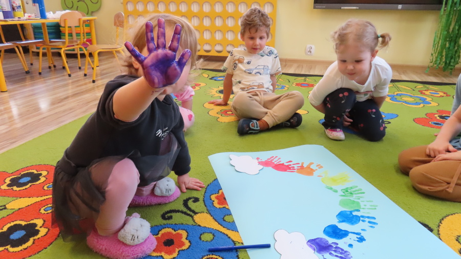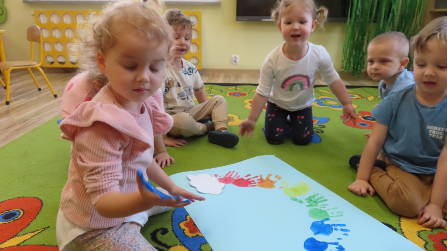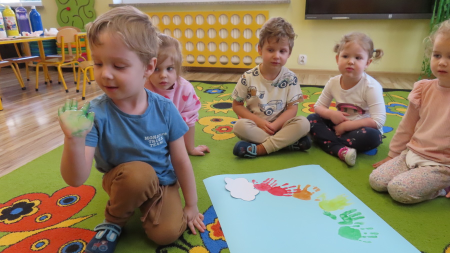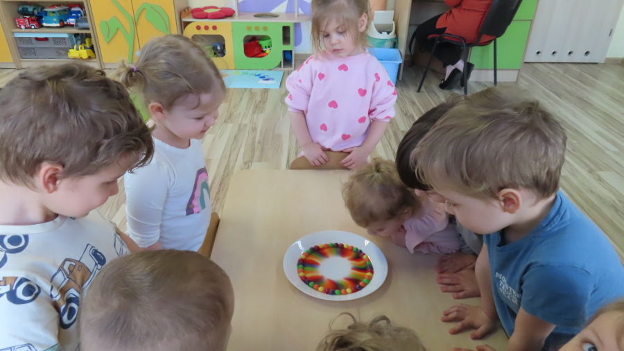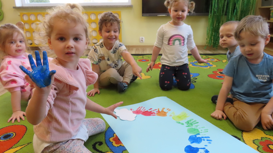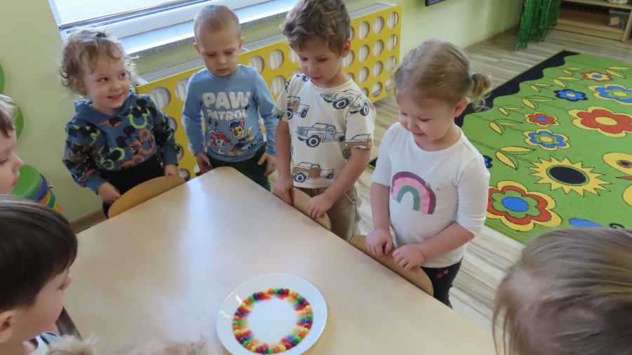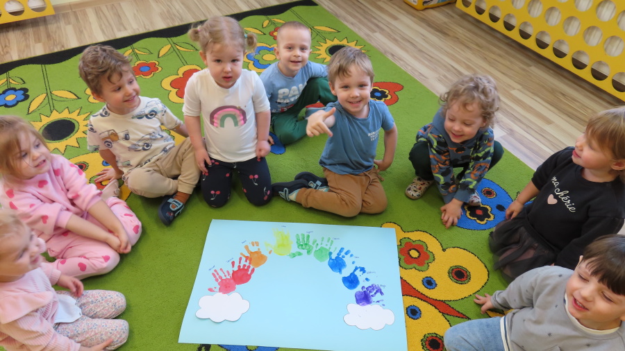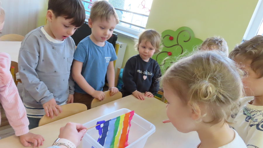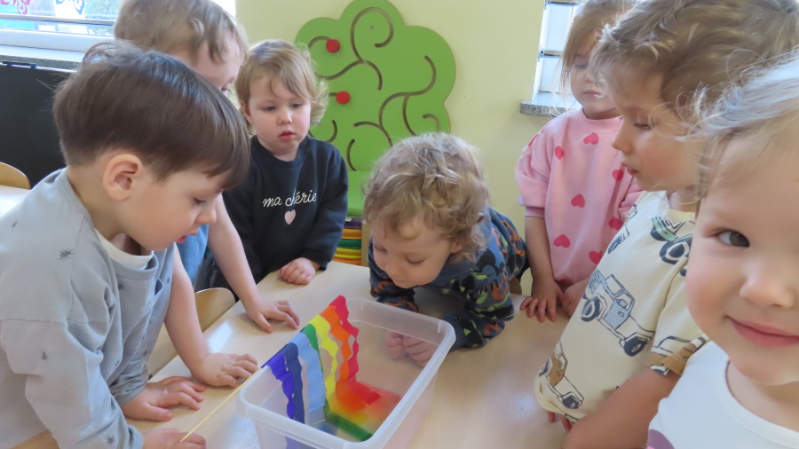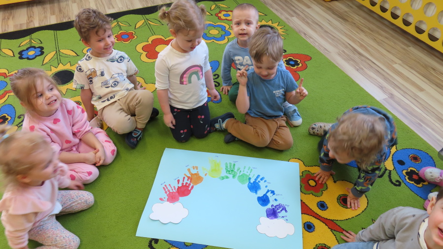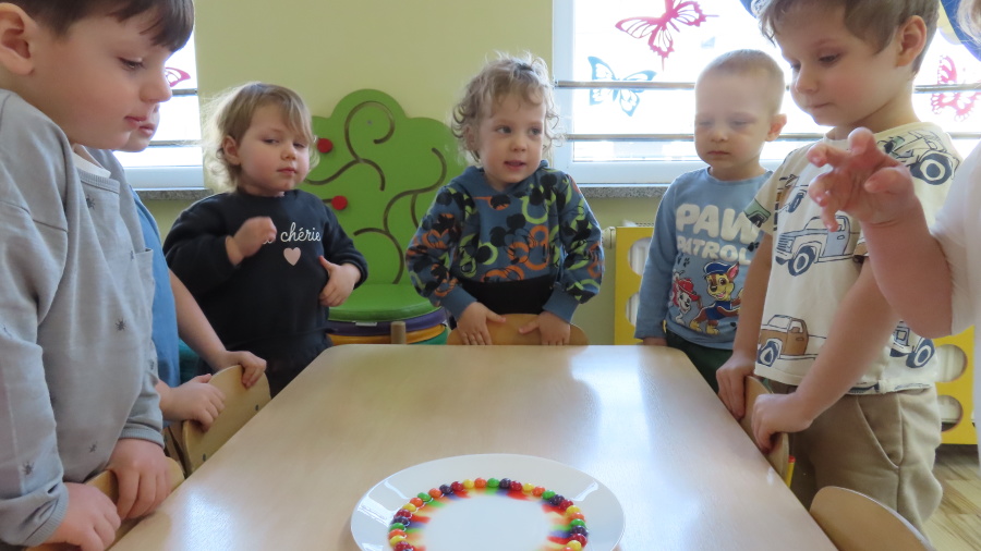 Dzisiejszy dzień w naszym przedszkolu mienił się wszystkimi barwami! Dzieci zamieniły się w małych odkrywców, aby poznać tajemnice jednego z najpiękniejszych zjawisk przyrody. Dowiedzieliśmy się, że do powstania tęczy potrzebne są dwa składniki: słońce i deszcz. ???? Przeprowadziliśmy doświadczenie z kolorowymi cukiereczkami, obserwując, jak pod wpływem wody tworzą na talerzyku barwny krąg. Na wielkim arkuszu brystolu powstała nasza grupowa tęcza. Dzieci z ogromnym entuzjazmem odciskały swoje dłonie zamoczone w farbach, tworząc unikalny, wielobarwny łuk. ????????