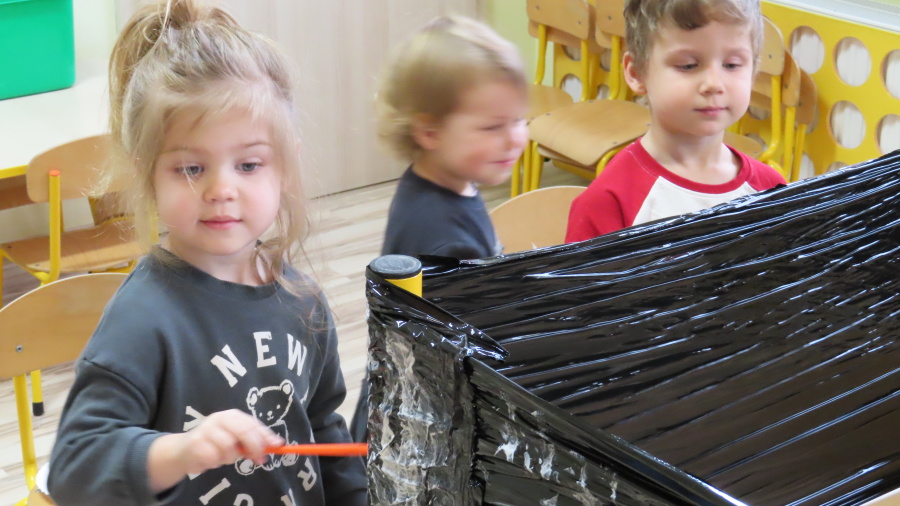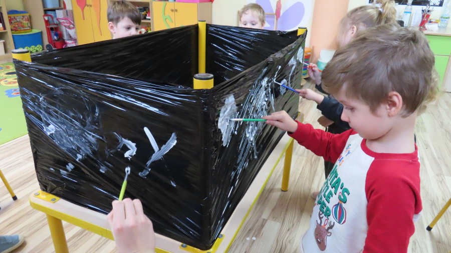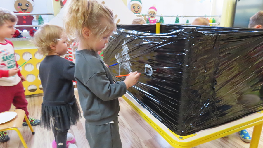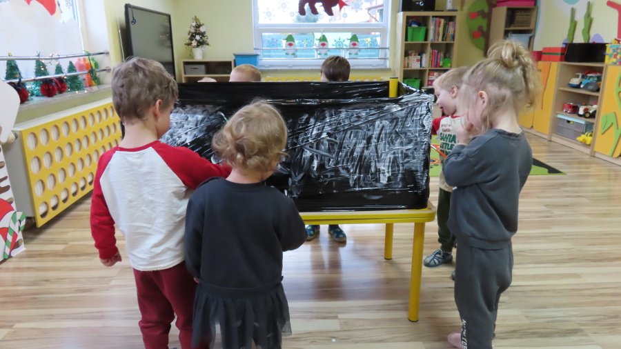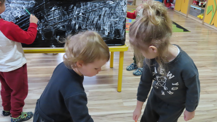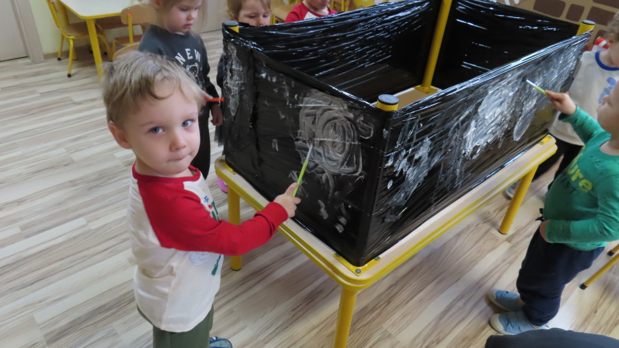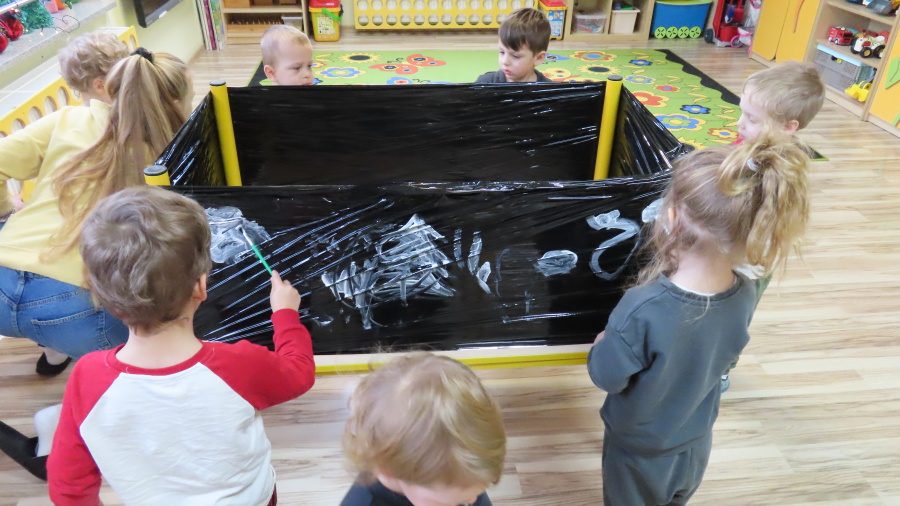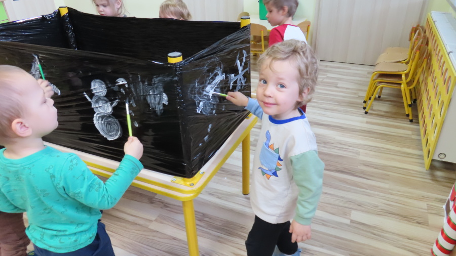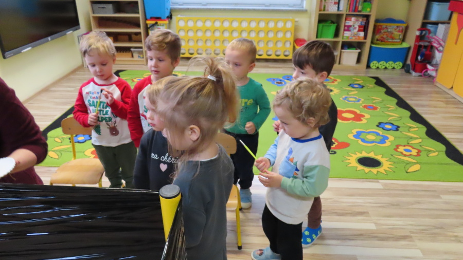 Dziś w grupie Pszczółek odbyły się zajęcia z arteterapii. Głównym celem było rozwijanie wyobraźni oraz eksperymentowanie z nietypowymi technikami plastycznymi. Zamiast tradycyjnego papieru, dzieci wykorzystały jako tło czarną folię streczową, co pozwoliło na uzyskanie wyjątkowego efektu głębi i kontrastu. Dzięki tej technice dzieci nie tylko ćwiczyły małą motorykę, ale także przekonały się, że do stworzenia pięknego obrazu wystarczy minimum środków, by uzyskać maksimum efektu.