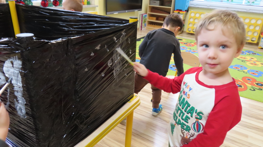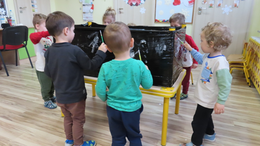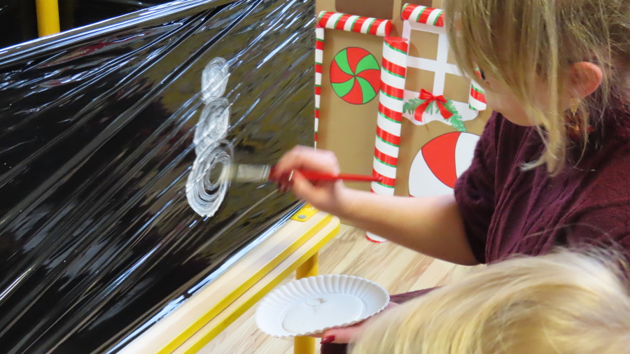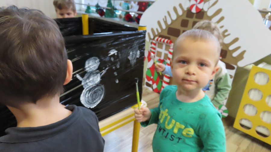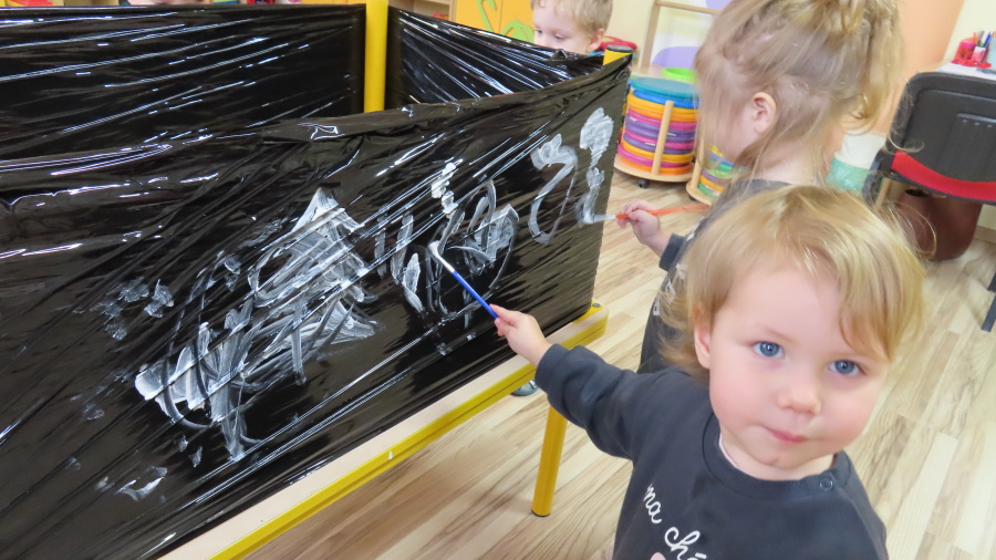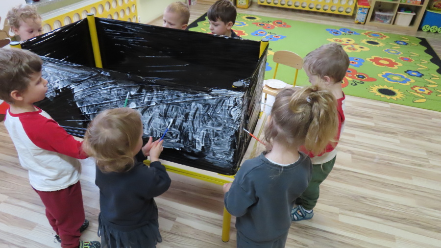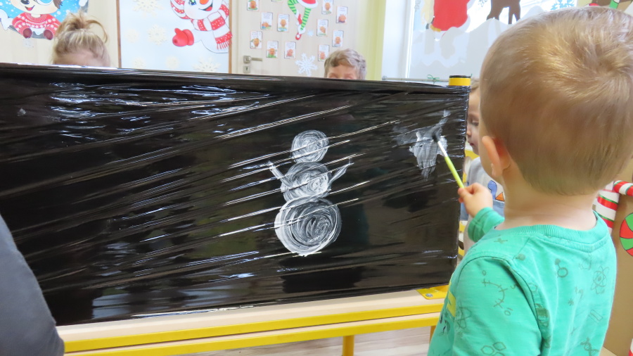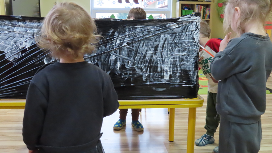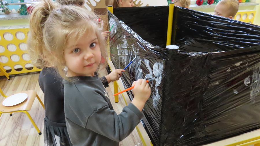 Dziś w grupie Pszczółek odbyły się zajęcia z arteterapii. Głównym celem było rozwijanie wyobraźni oraz eksperymentowanie z nietypowymi technikami plastycznymi. Zamiast tradycyjnego papieru, dzieci wykorzystały jako tło czarną folię streczową, co pozwoliło na uzyskanie wyjątkowego efektu głębi i kontrastu. Dzięki tej technice dzieci nie tylko ćwiczyły małą motorykę, ale także przekonały się, że do stworzenia pięknego obrazu wystarczy minimum środków, by uzyskać maksimum efektu.