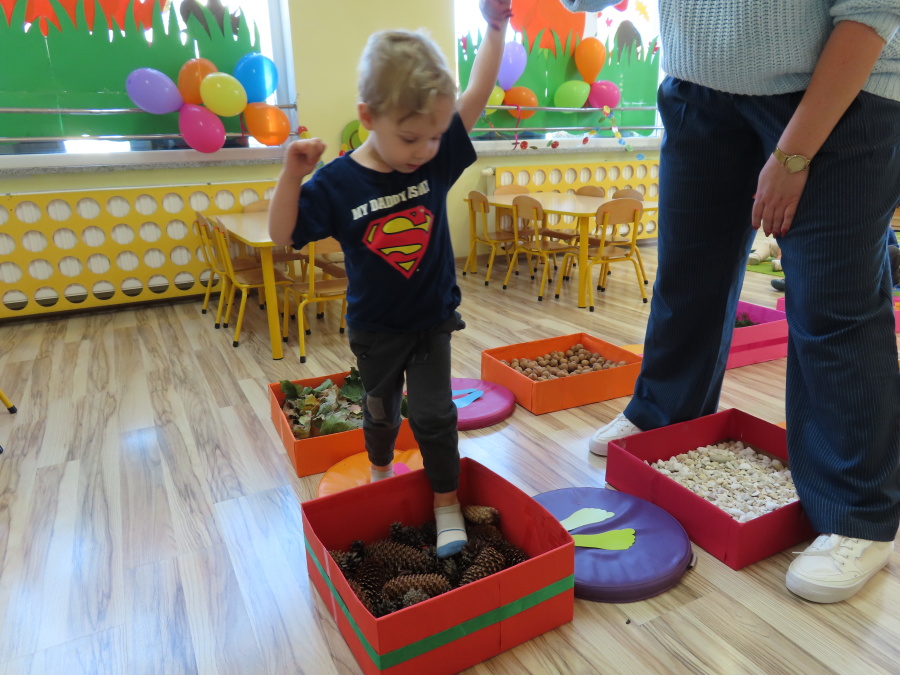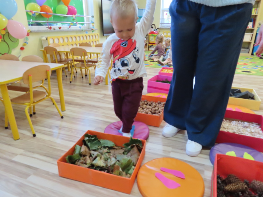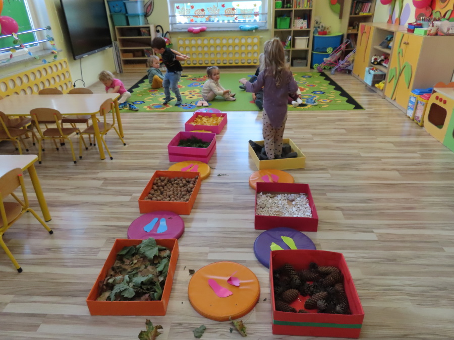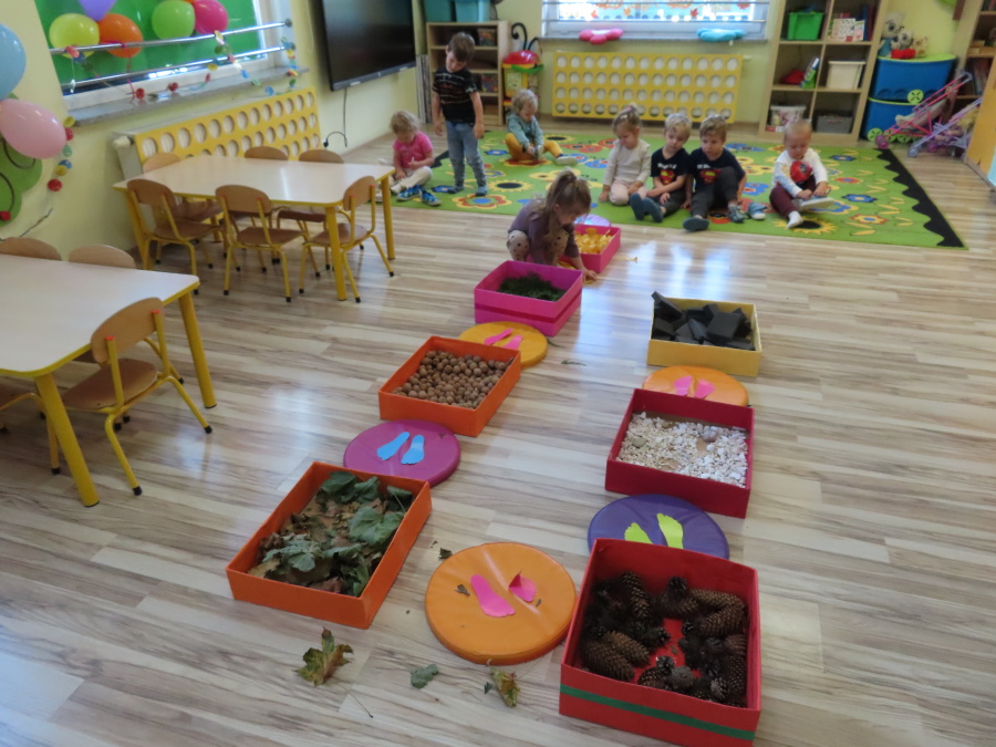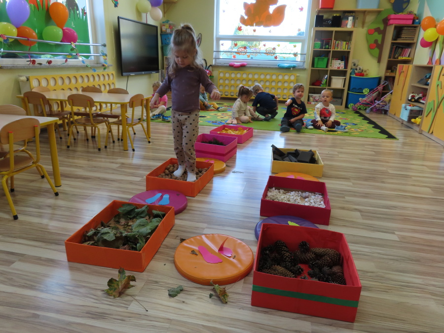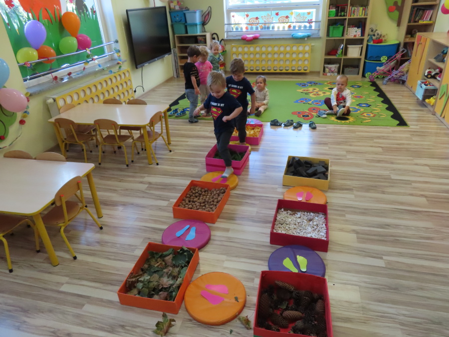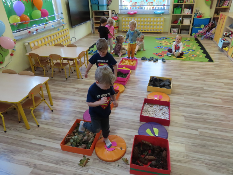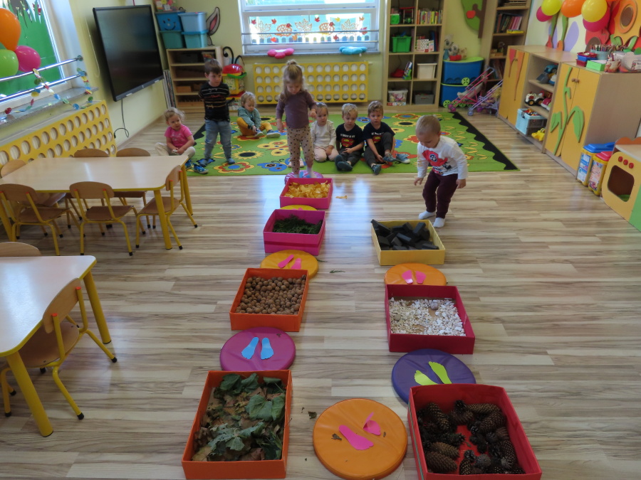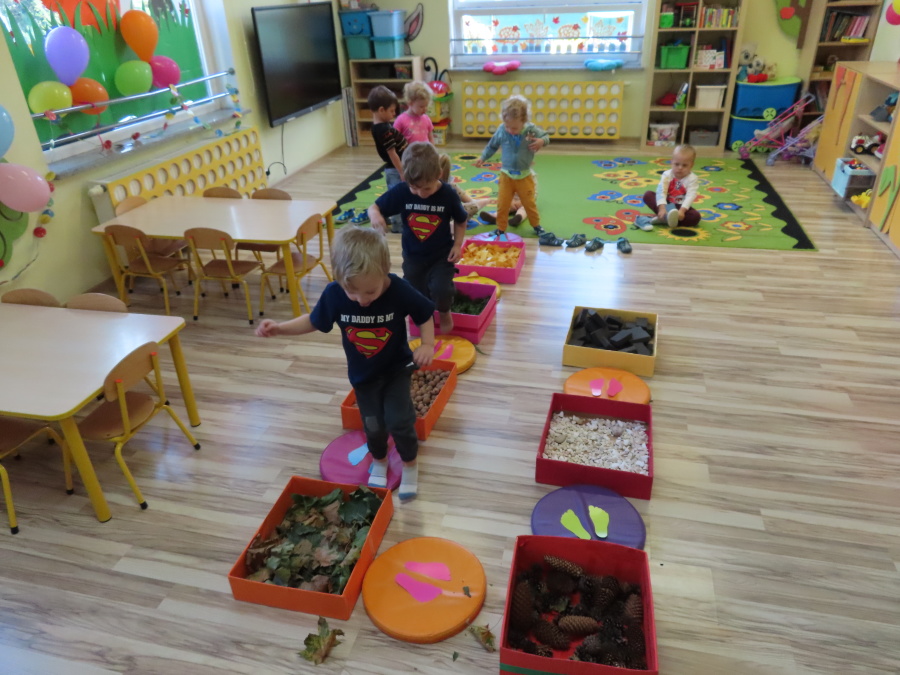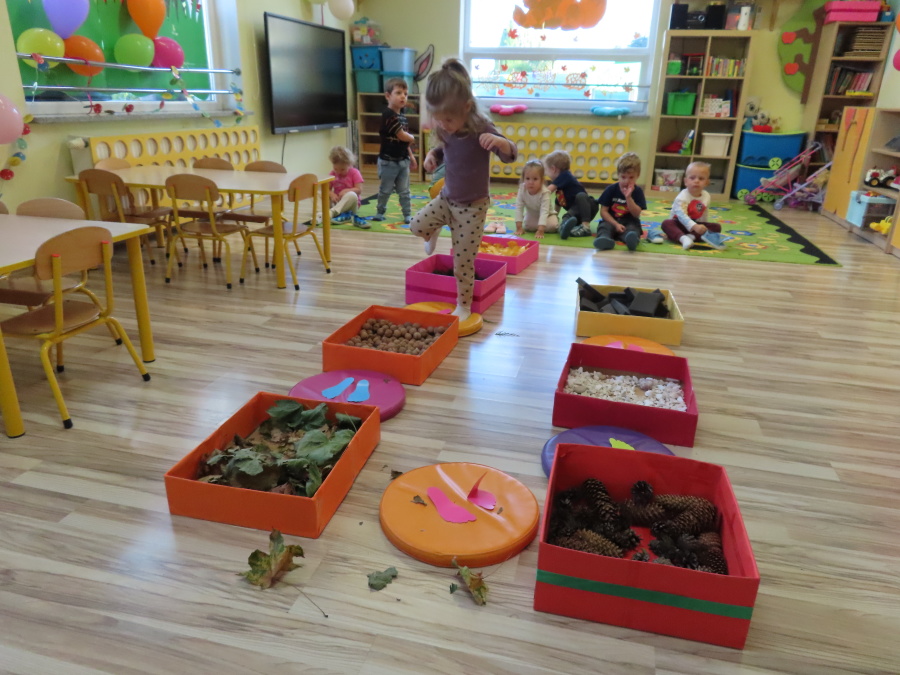 Zajęcia sensoryczne w Pszczółkach.???? Jesień dzisiaj przyszła do nas w postaci ścieżki sensorycznej. Wykorzystaliśmy szyszki, orzechy, liście, kamienie, a także przyjemne w dotyku pianki i szeleszczące papierki. ???????????????? Ścieżka sensoryczna ma ogromne znaczenie dla małych stópek, rozwija równowagę i koordynację ruchową. Usprawnia motorykę, rozwija wrażenia dotykowe, a co najważniejsze pozwala maluszkom rozwinąć wyobraźnię dotykową. ???????????? Ścieżka sensoryczna to również świetna zabawa i test na odwagę, który każda pszczółka zdała na medal.