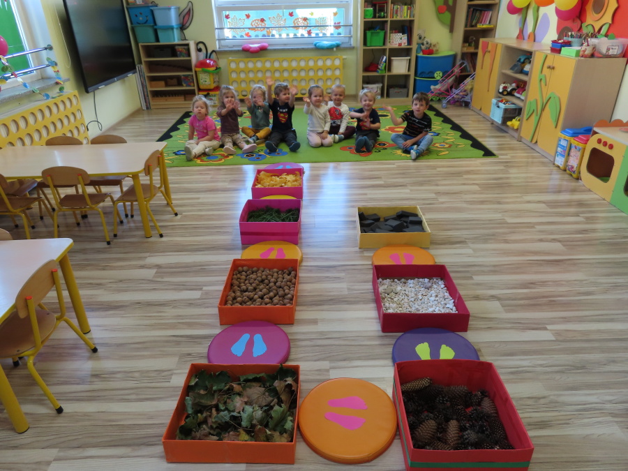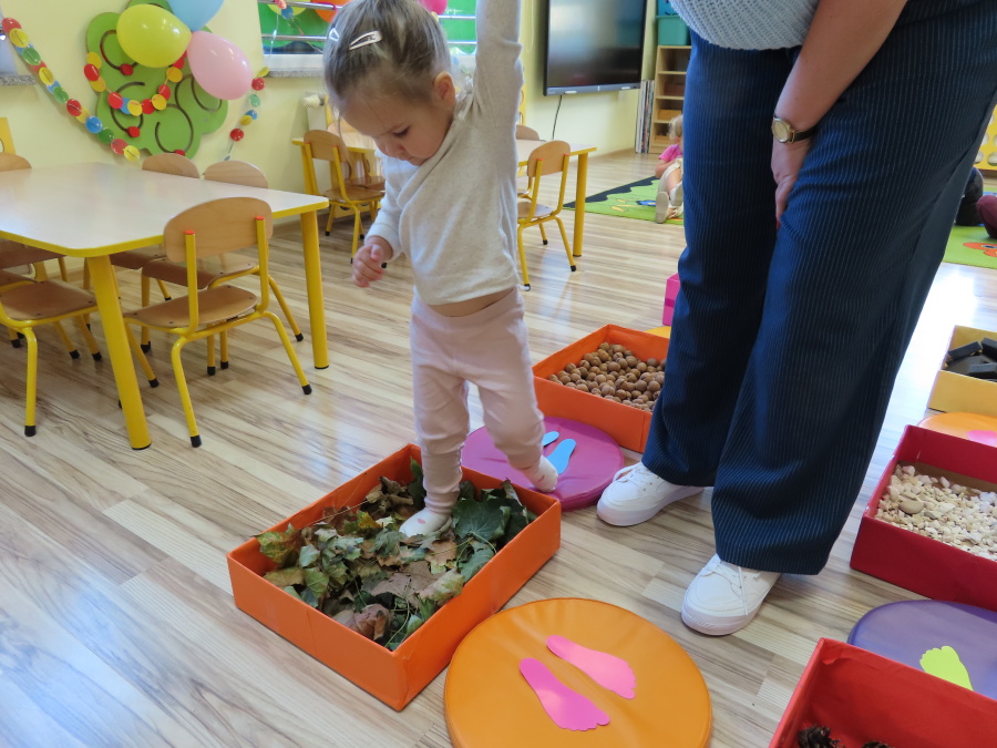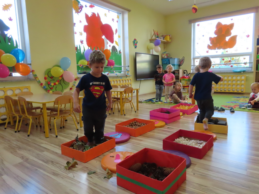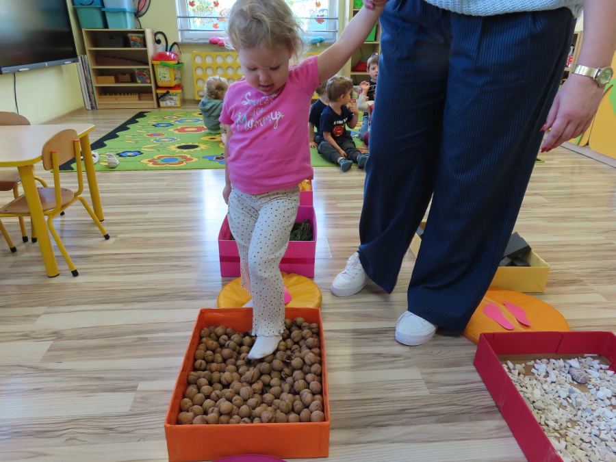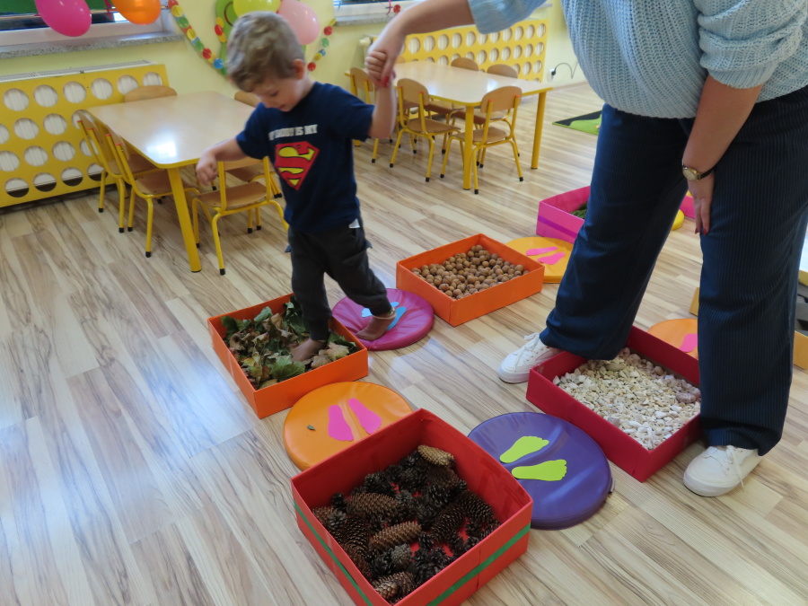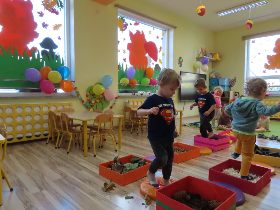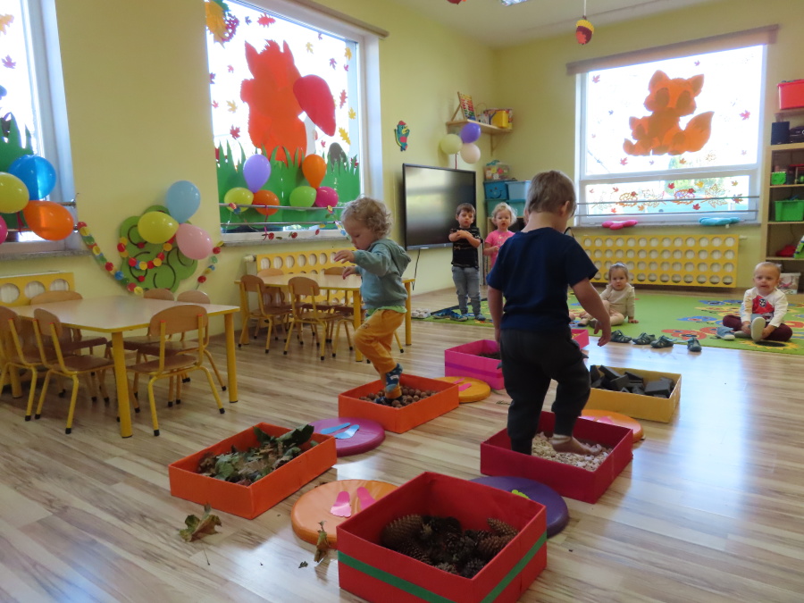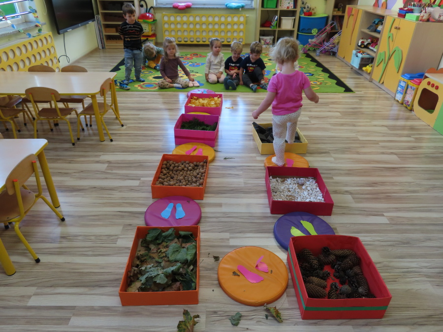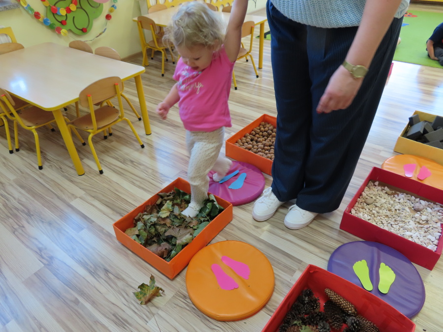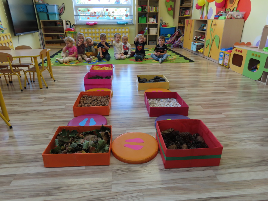 Zajęcia sensoryczne w Pszczółkach.???? Jesień dzisiaj przyszła do nas w postaci ścieżki sensorycznej. Wykorzystaliśmy szyszki, orzechy, liście, kamienie, a także przyjemne w dotyku pianki i szeleszczące papierki. ???????????????? Ścieżka sensoryczna ma ogromne znaczenie dla małych stópek, rozwija równowagę i koordynację ruchową. Usprawnia motorykę, rozwija wrażenia dotykowe, a co najważniejsze pozwala maluszkom rozwinąć wyobraźnię dotykową. ???????????? Ścieżka sensoryczna to również świetna zabawa i test na odwagę, który każda pszczółka zdała na medal.